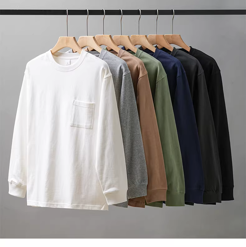 Áo thun cotton nguyên chất hạng nặng 320G dành cho nam, áo len cổ tròn dài tay phong cách Mỹ mùa thu, áo sơ mi màu trơn dáng rộng, phong cách giản dị.