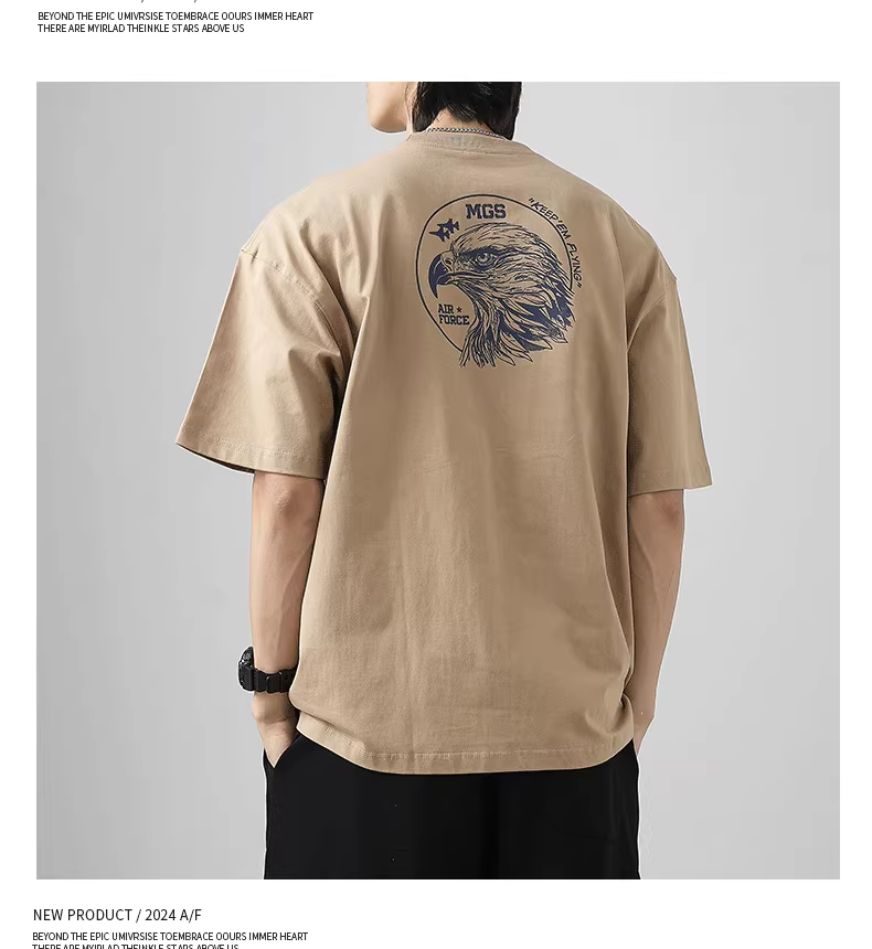 - Áo thun cotton nguyên chất hạng nặng 320G dành cho nam, tay ngắn, áo in hình đại bàng cổ điển mùa hè của Mỹ, áo nửa tay cổ tròn dáng rộng dành cho nam
