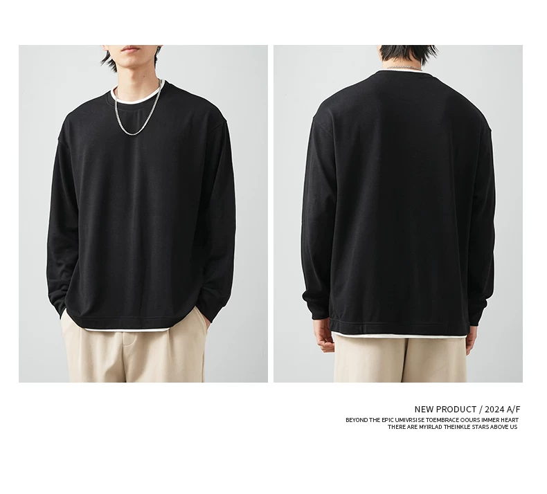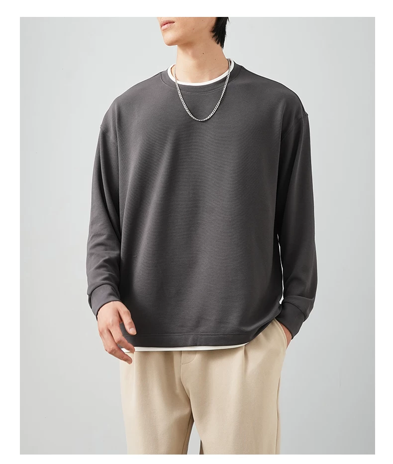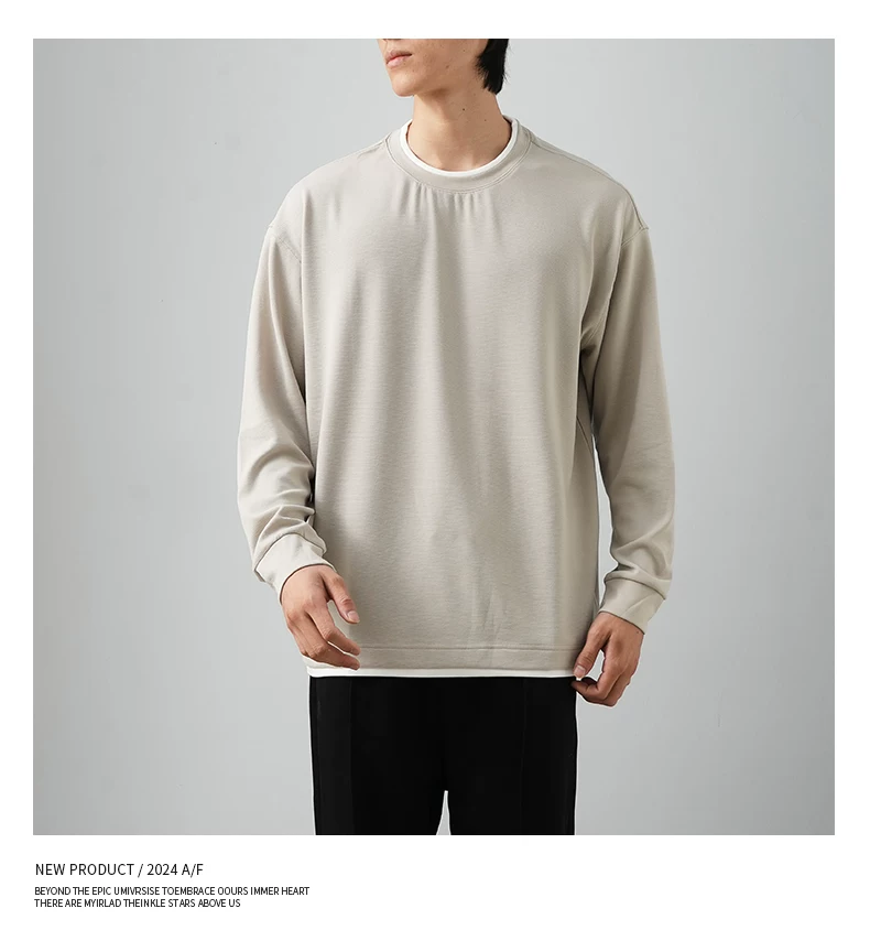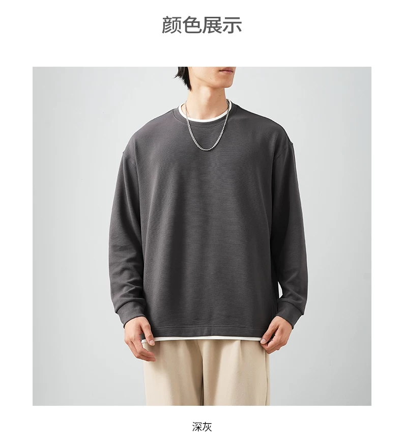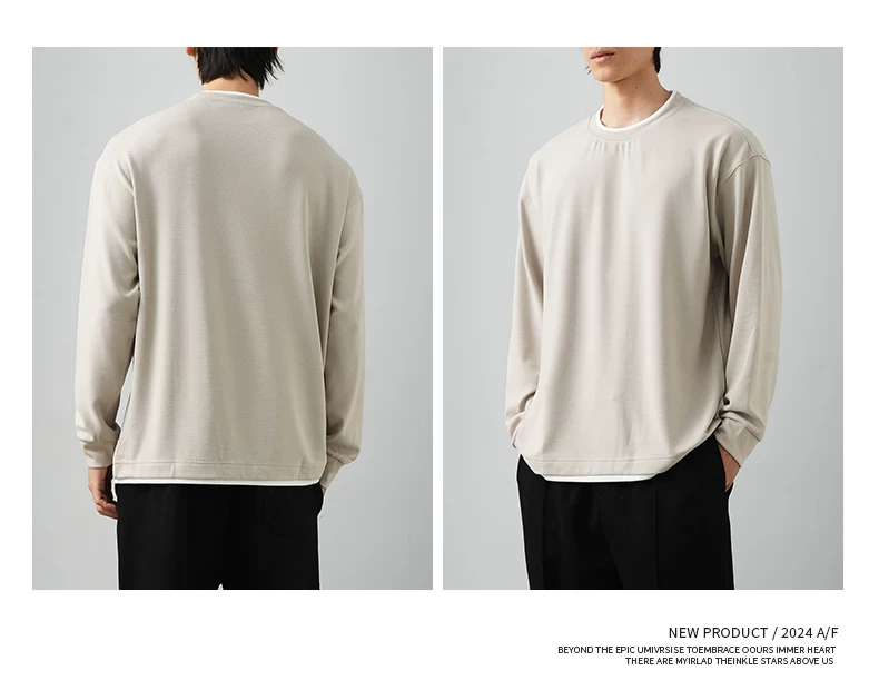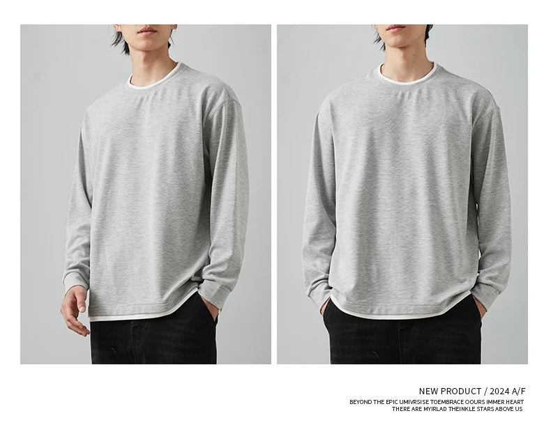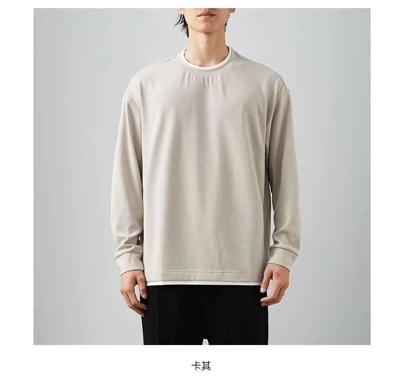- Áo thun dài tay giả hai mảnh hạng nặng OMZM300G dành cho nam giới, áo sơ mi cổ tròn dáng rộng màu trơn mùa thu dành cho giới trẻ