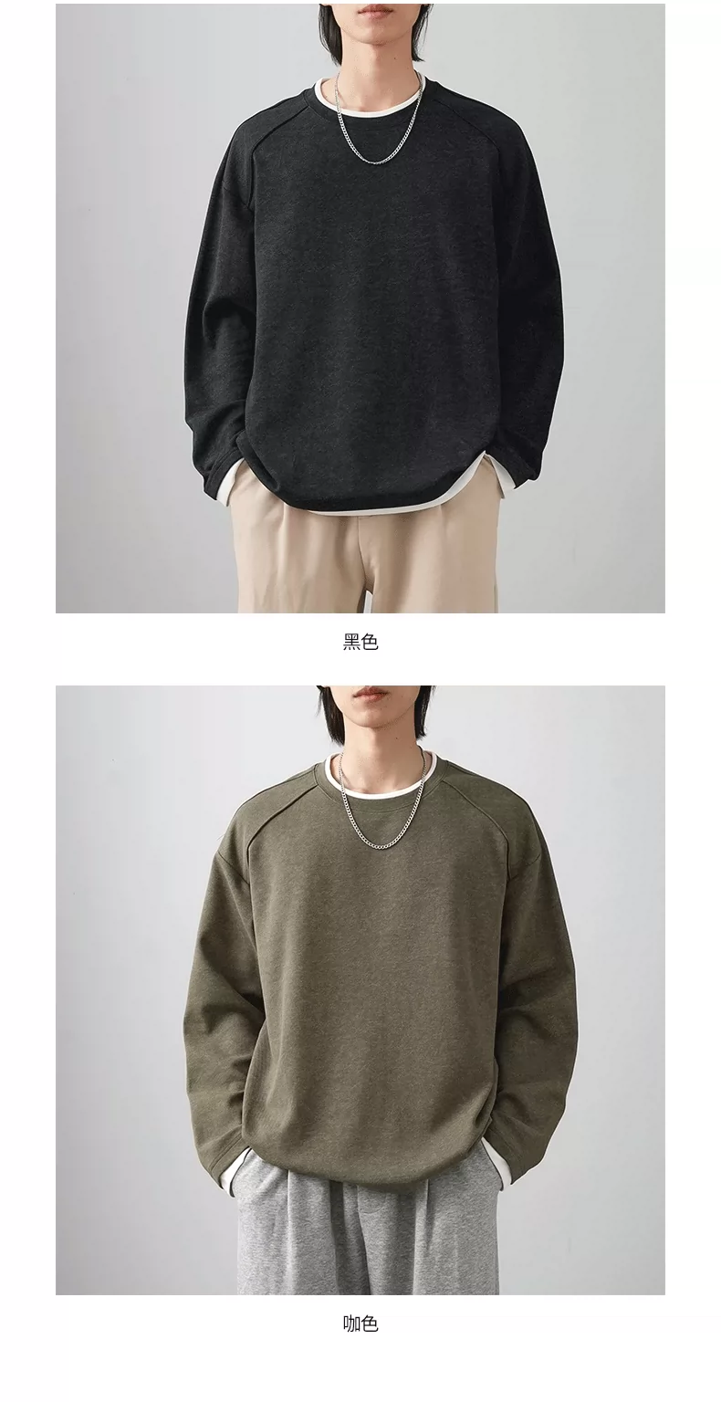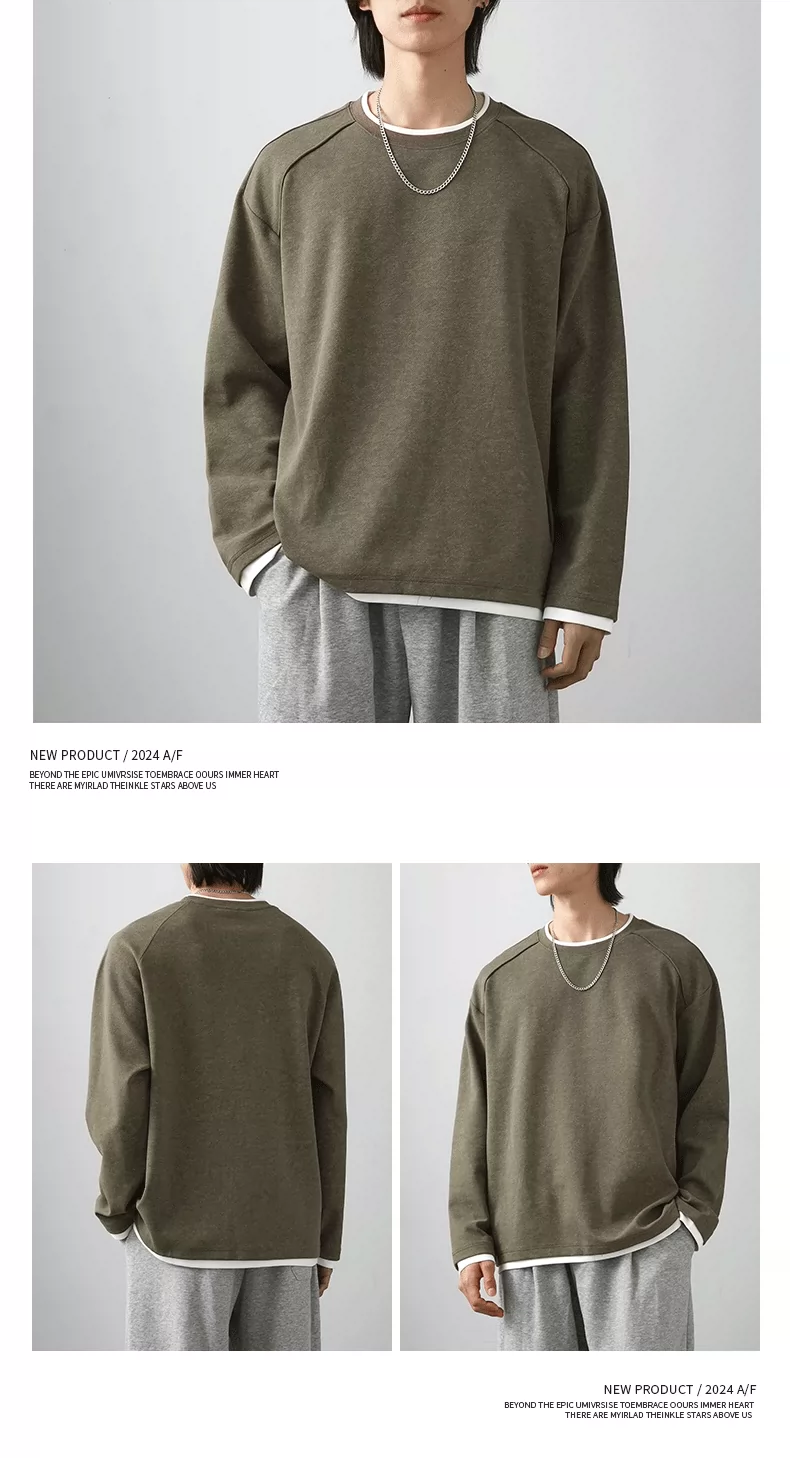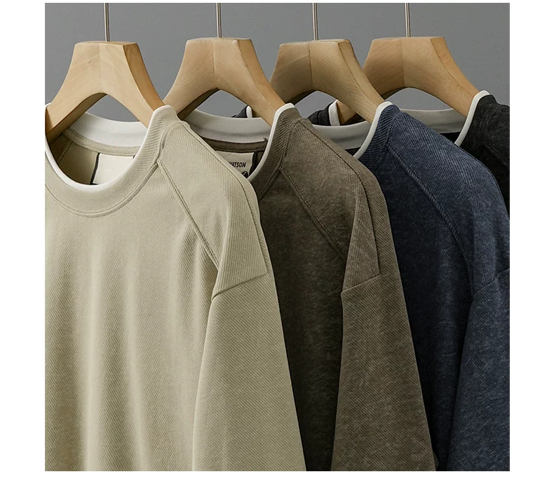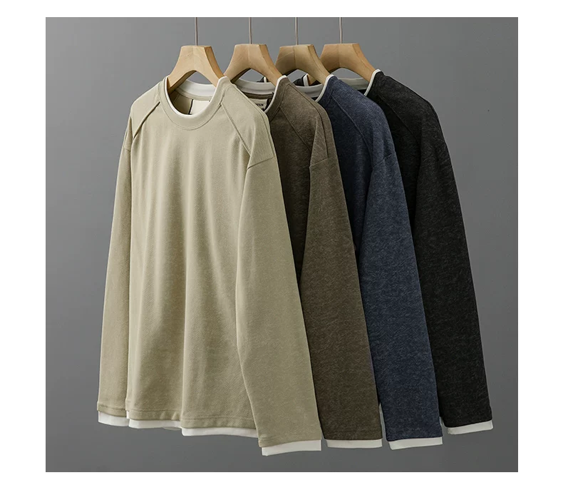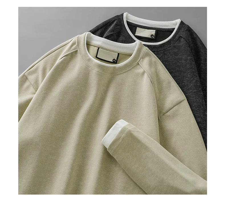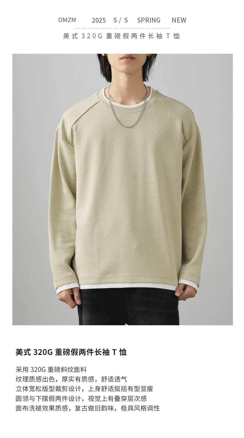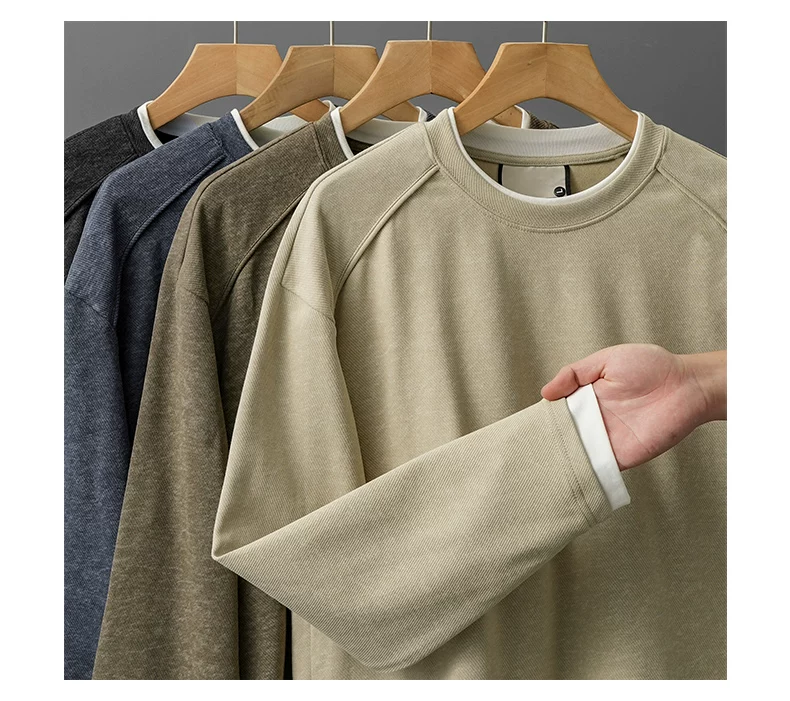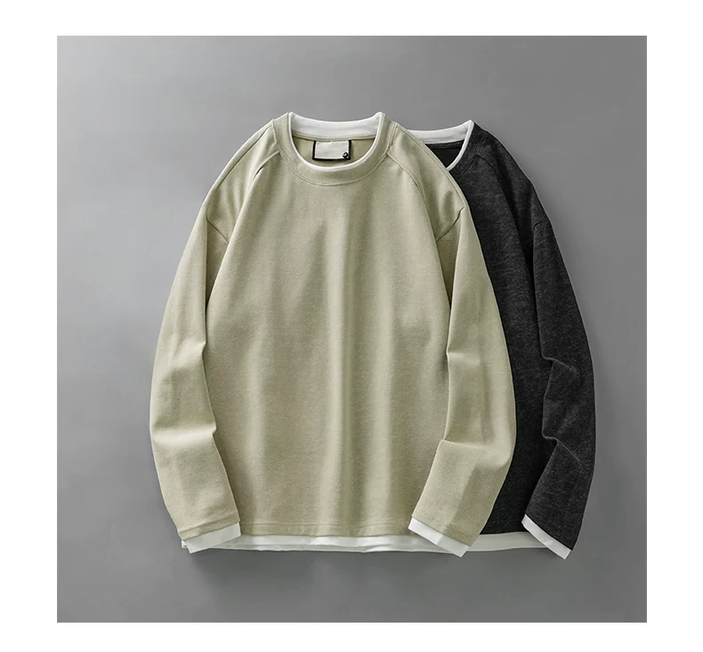 - Áo thun dài tay giả hai mảnh kiểu Mỹ 320G dành cho nam, áo len cổ tròn màu trơn mùa xuân, áo lót cổ điển.