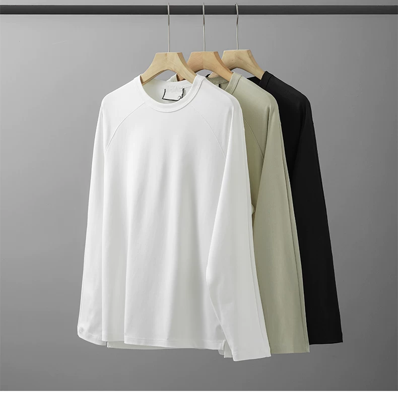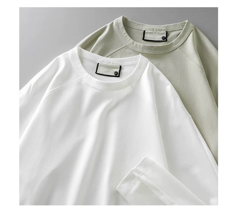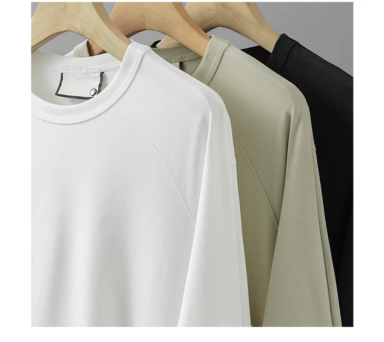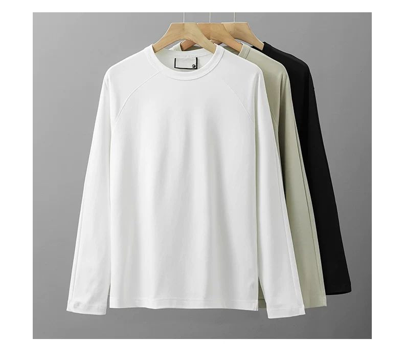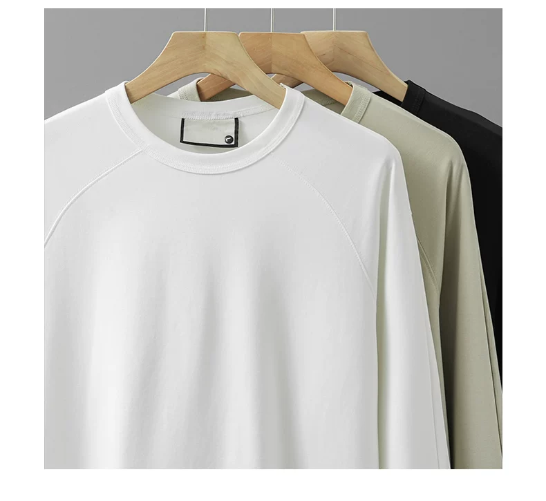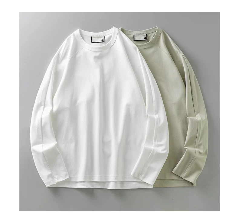 - Áo thun dài tay modal hạng nặng OMZM270G dành cho nam và nữ, mùa xuân thu, dệt ba sợi, cổ tròn, áo sơ mi màu trắng tinh khiết.