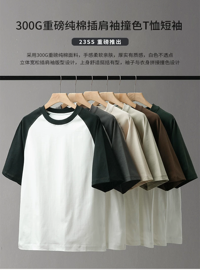 Áo thun nam 300G chất liệu dày dặn, tay ngắn, kiểu mới hè 2025, tay raglan phối màu, dáng rộng, chất liệu cotton nguyên chất.