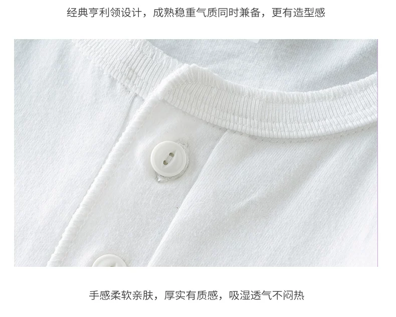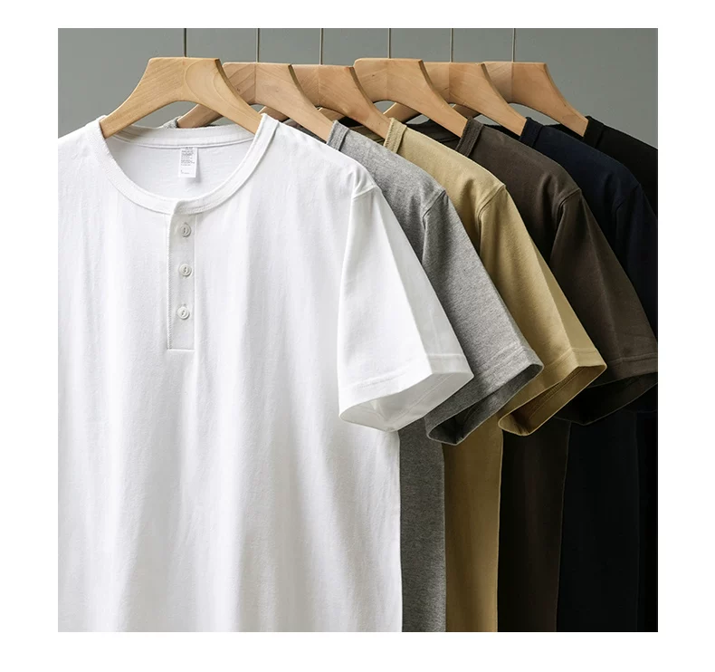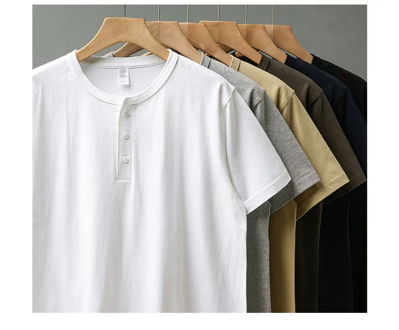 - Áo thun nam cổ henley tay ngắn chất liệu cotton dày 260g, kiểu dáng vintage mạnh mẽ, màu trắng tinh khiết, mùa hè.