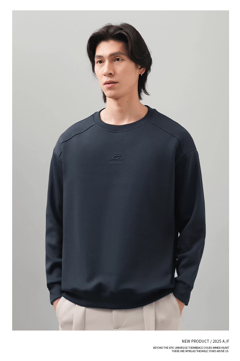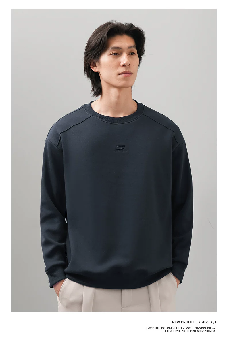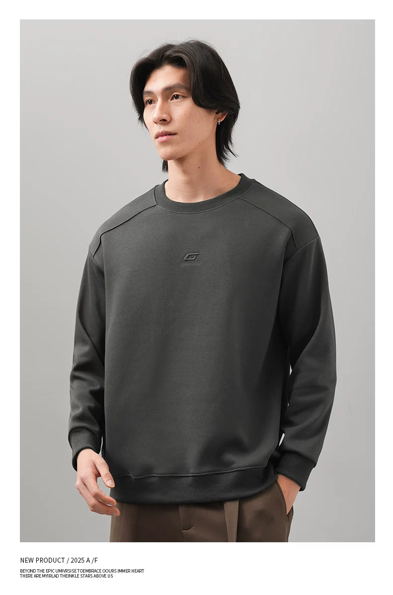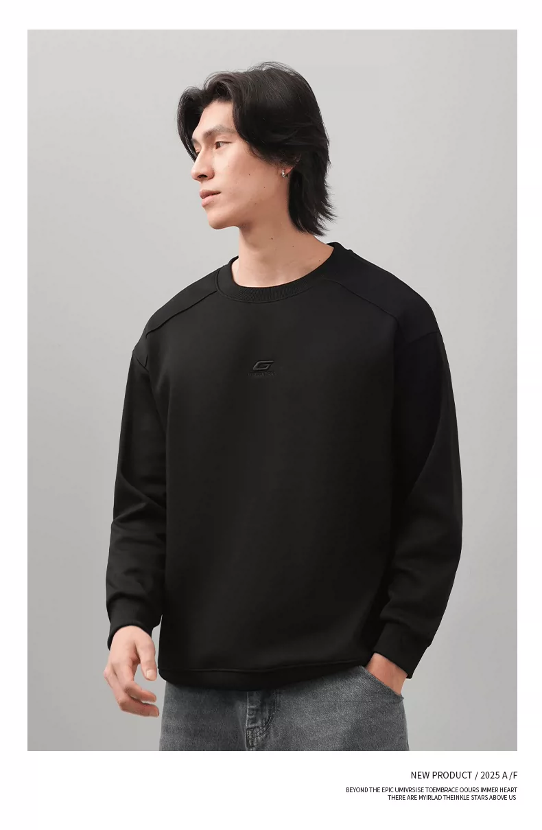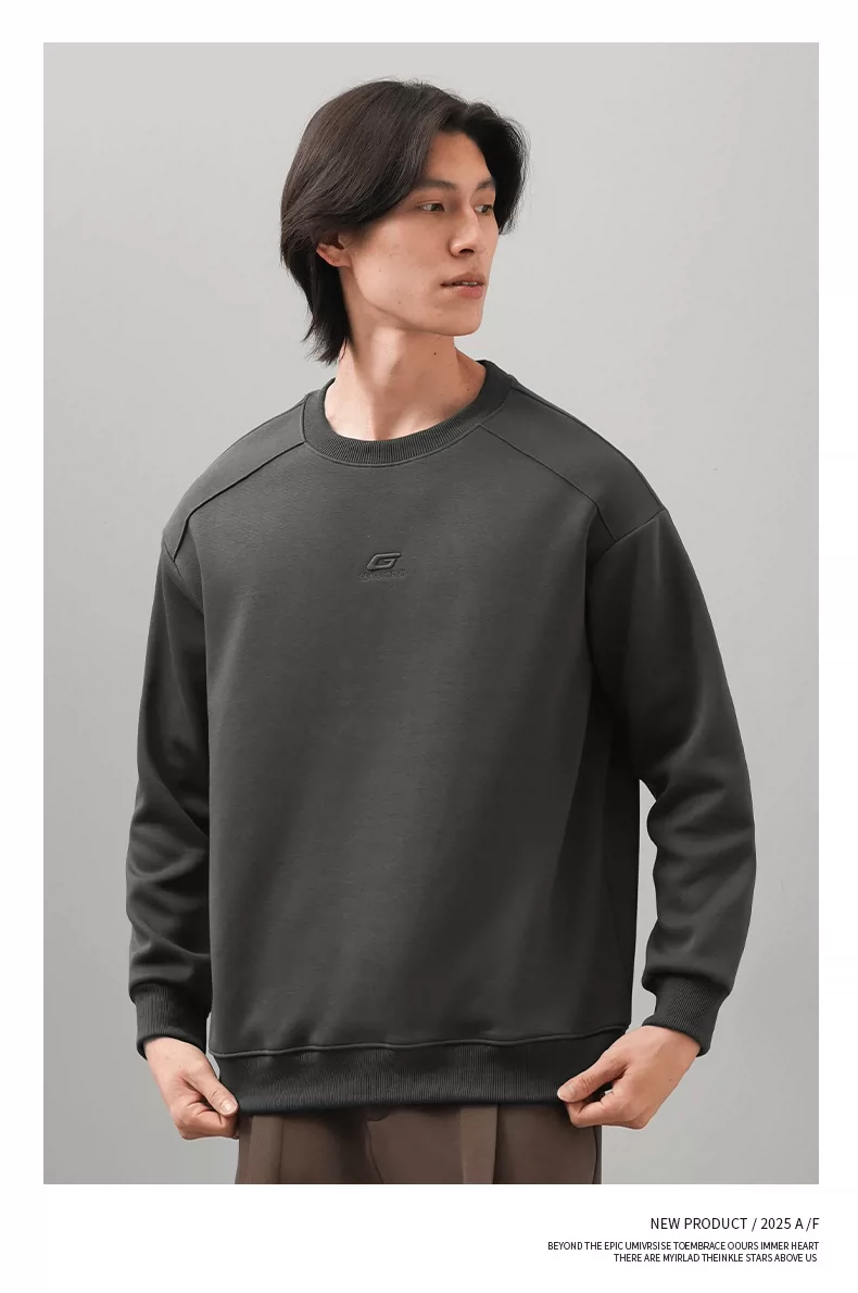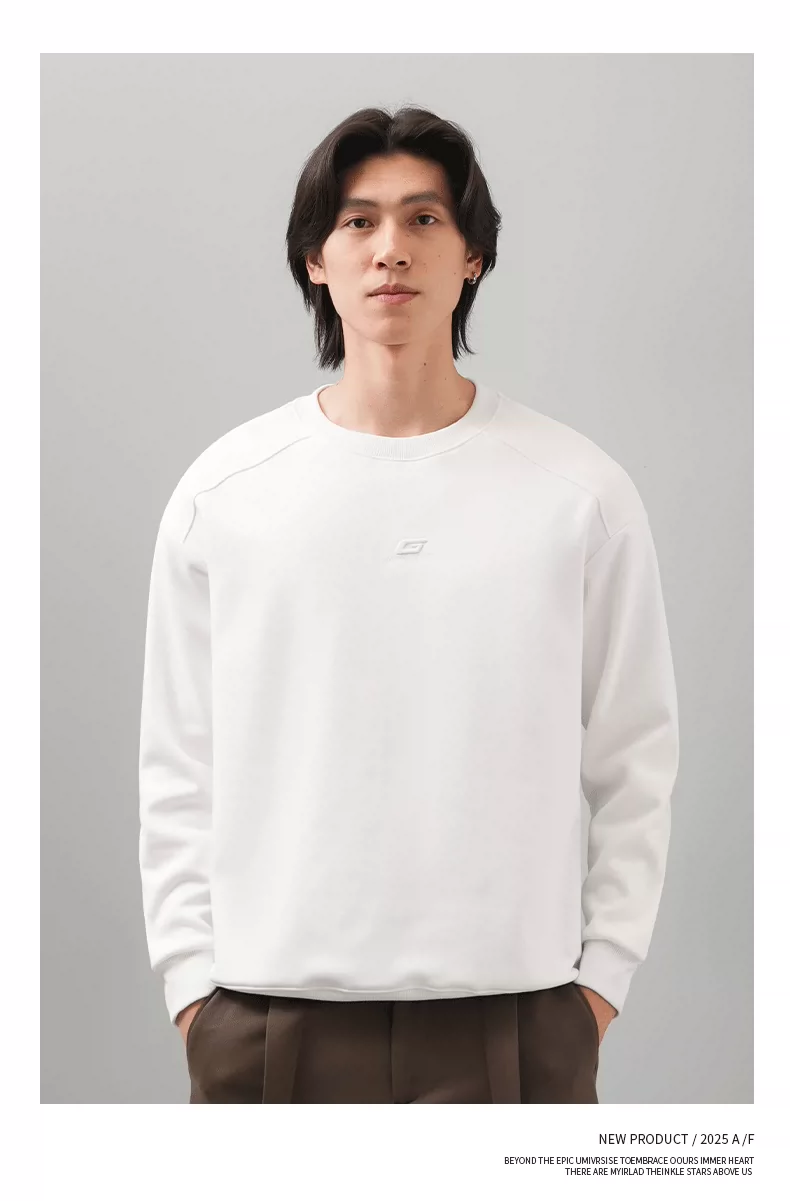 Áo thun nam cổ tròn thêu OMZM thu đông 2025, màu trơn đơn giản, kiểu dáng rộng rãi, tay dài, mặc trong, phong cách thường ngày