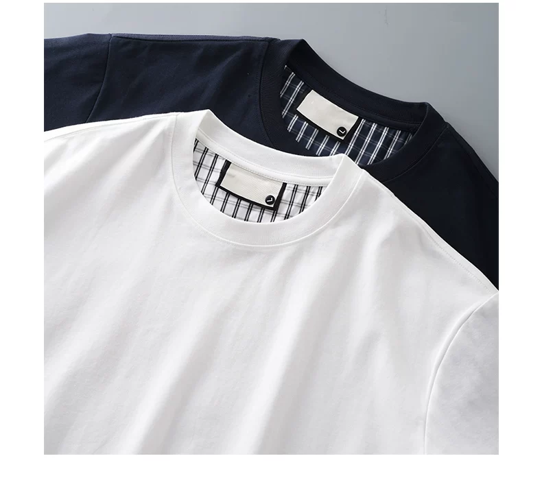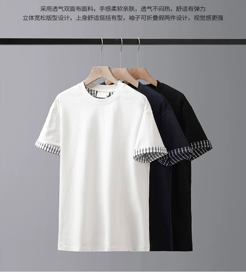 Áo thun nam giả hai mảnh tay ngắn, chất liệu dày dặn, kiểu dáng rộng rãi mùa hè, cổ tròn, thiết kế thời trang với chi tiết phối tay áo, màu trơn nửa tay.