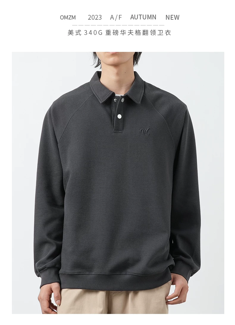 Áo thun nam OMZM kiểu Mỹ, chất liệu vải waffle dày 340G, cổ áo kiểu polo thêu, dáng rộng, mùa thu, áo lót dài tay