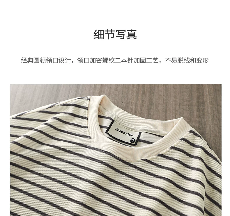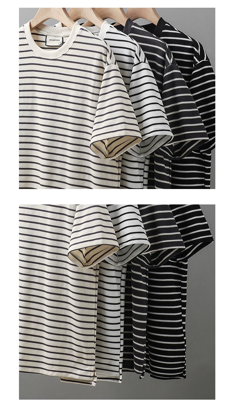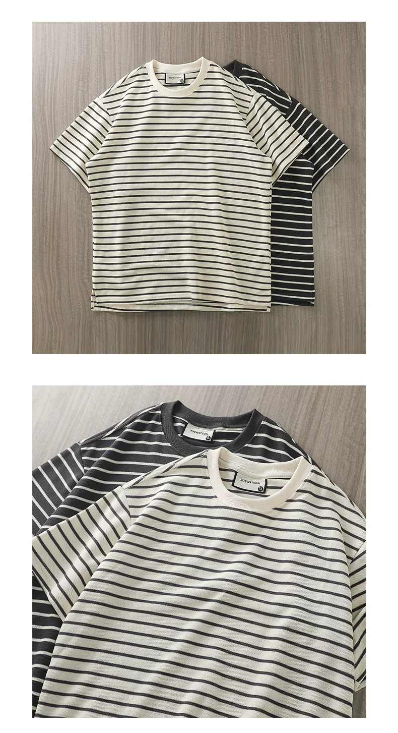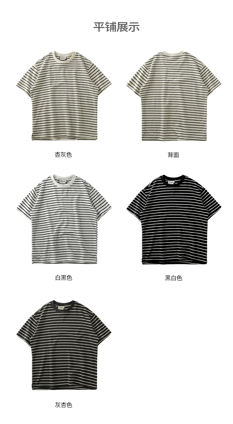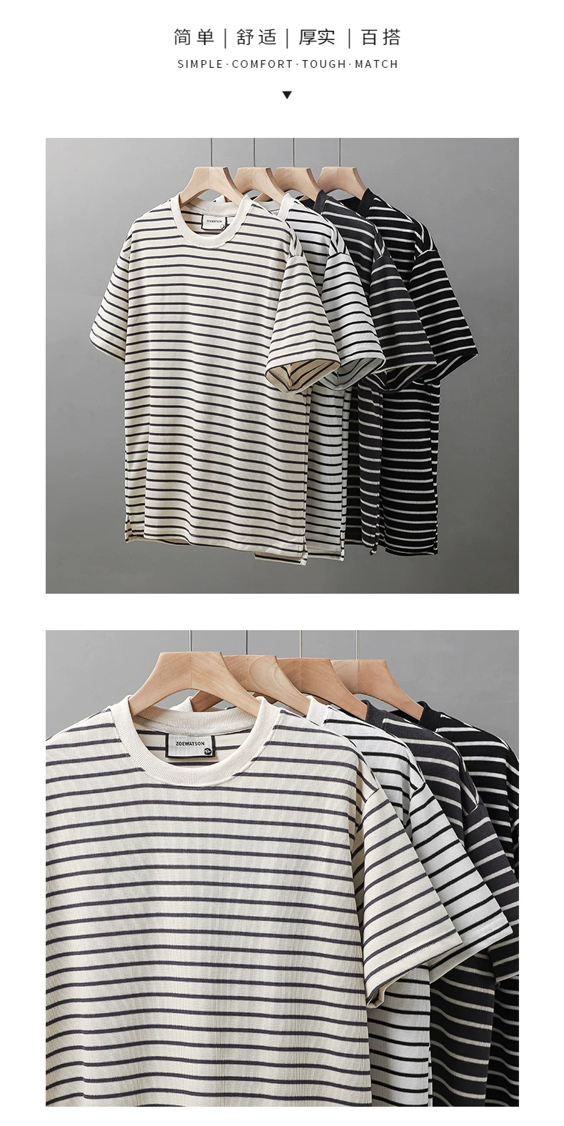 Áo thun ngắn tay sọc nặng 300g phong cách Mỹ OMZM dành cho nam, áo sơ mi thủy thủ cổ điển phối màu mùa hè, tay lửng cổ tròn rộng rãi