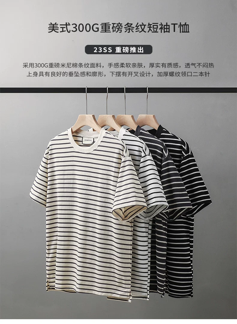 - Áo thun ngắn tay sọc nặng 300g phong cách Mỹ OMZM dành cho nam, áo sơ mi thủy thủ cổ điển phối màu mùa hè, tay lửng cổ tròn rộng rãi