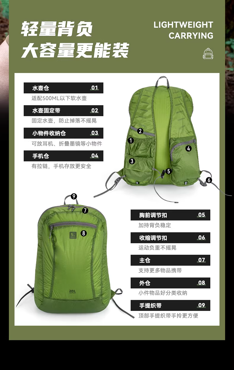 - Ba lô nhẹ ngoài trời di động chống thấm nước leo núi ba lô đi bộ đường dài túi nước du lịch túi da có thể gập lại
