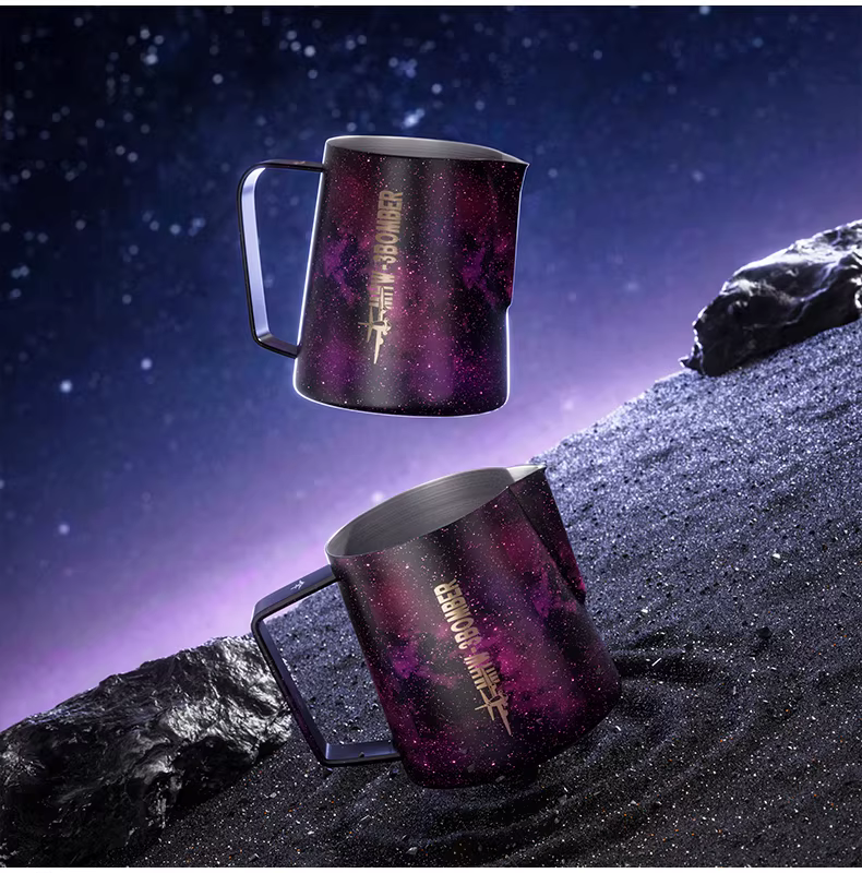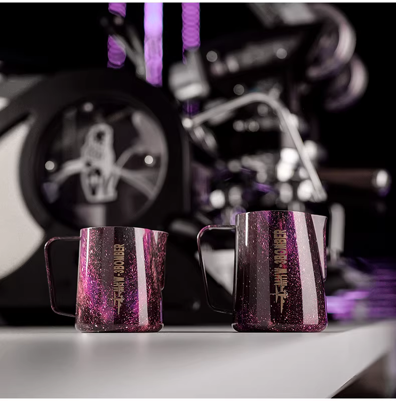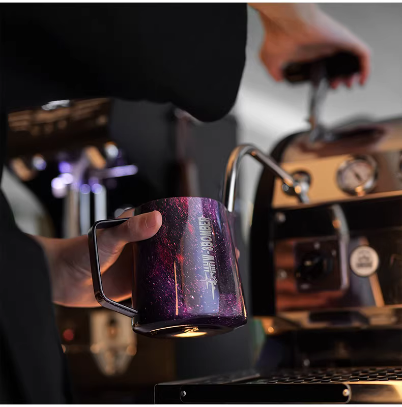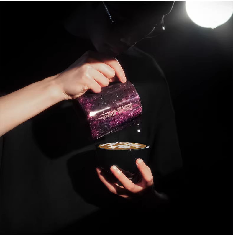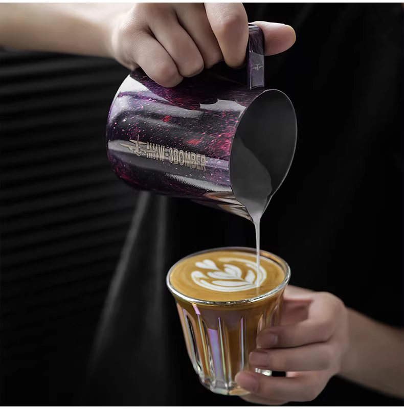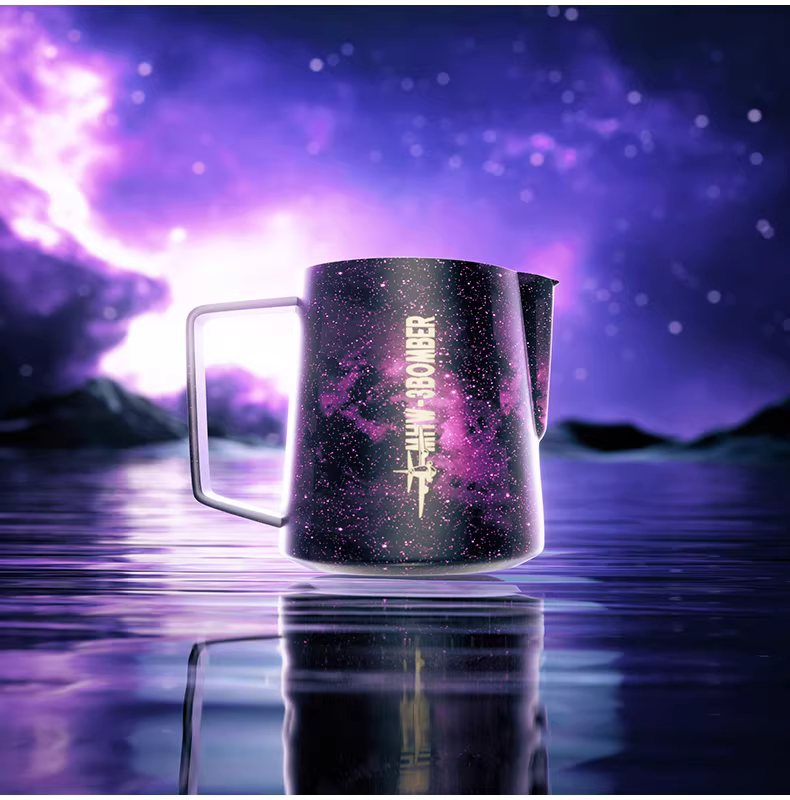 Bình tạo bọt sữa chuyên nghiệp Bomber MHW Starry Sky Latte Art, chất liệu thép không gỉ, vòi tròn, kiểu dáng Ý, dùng tạo họa tiết Latte Art.