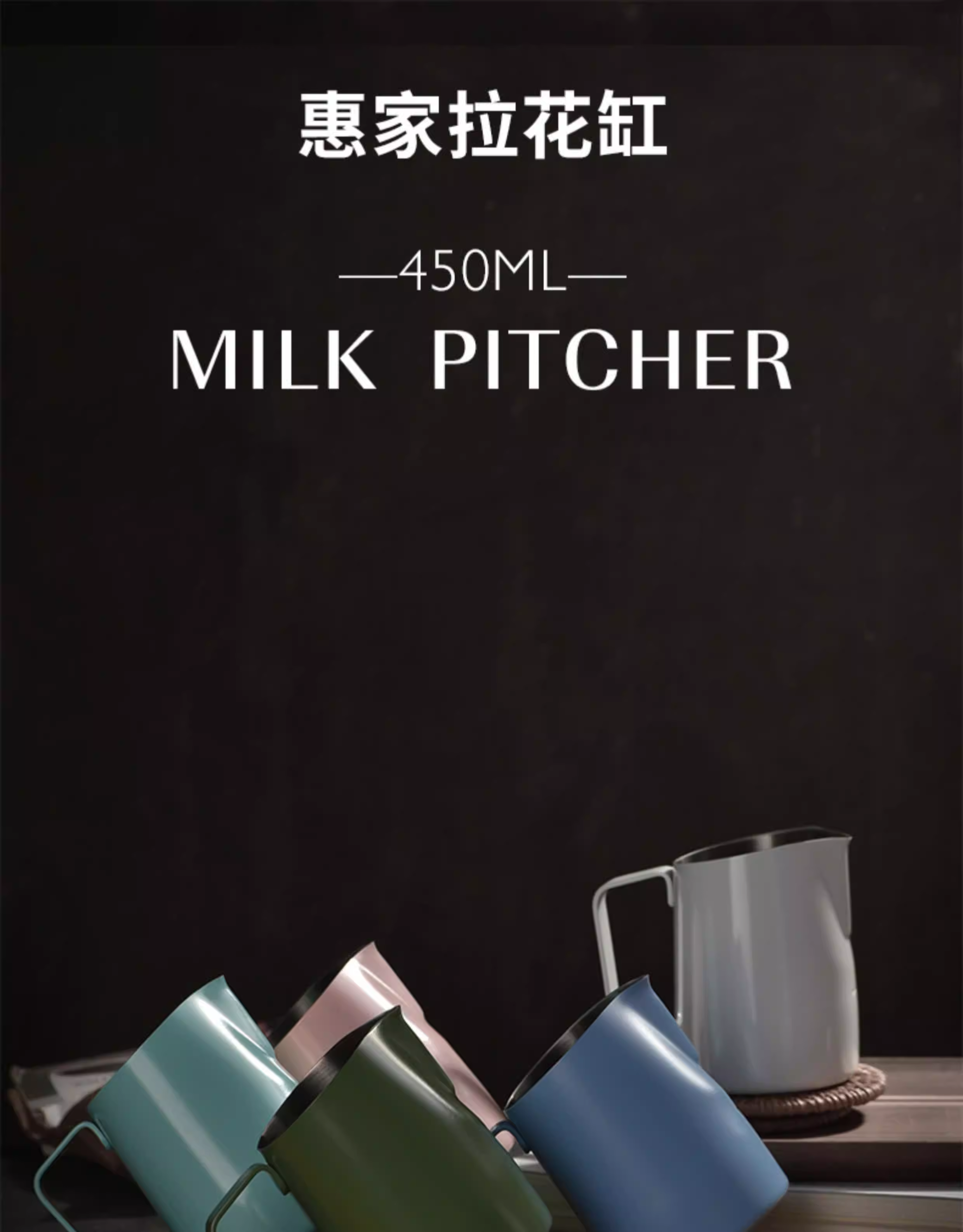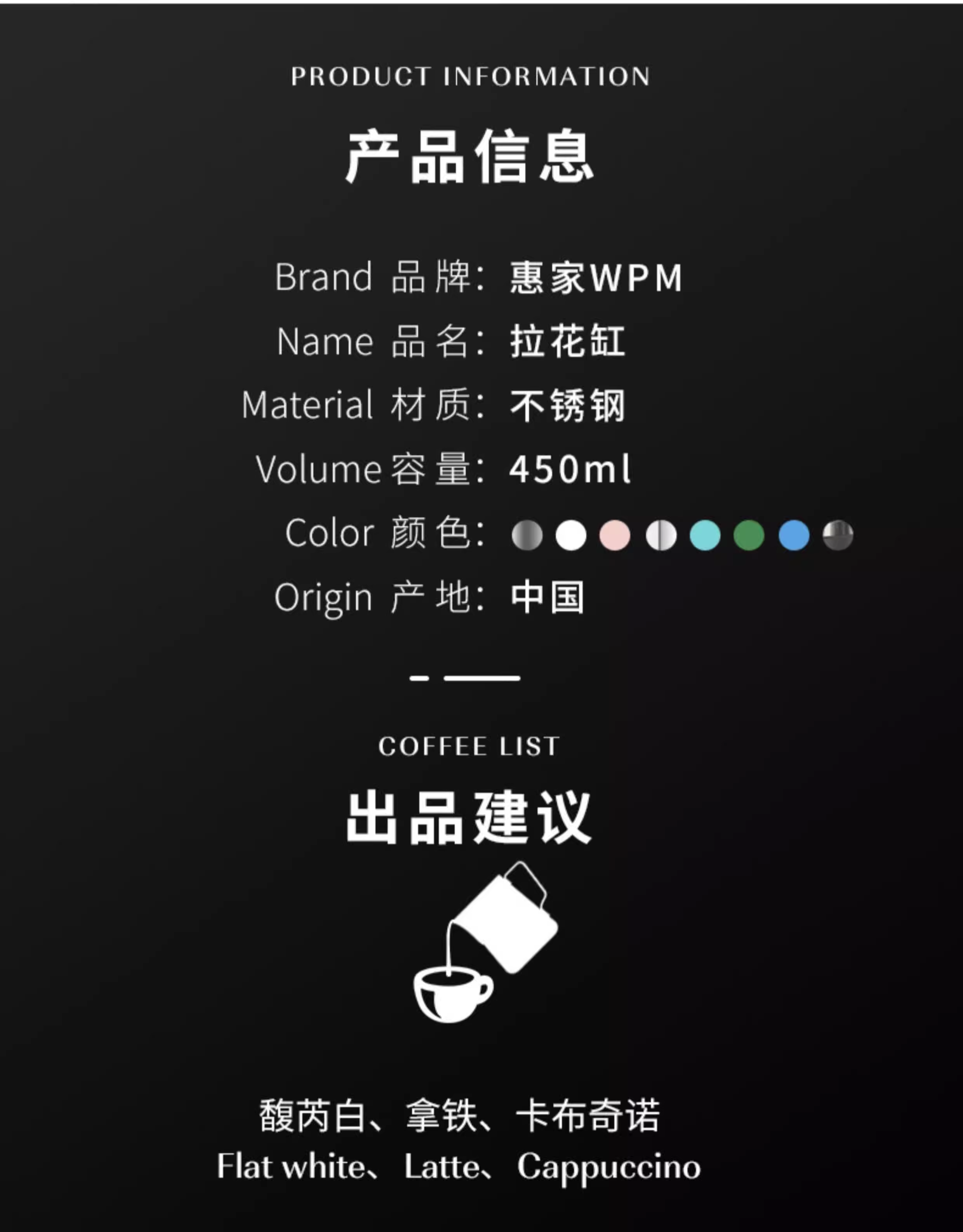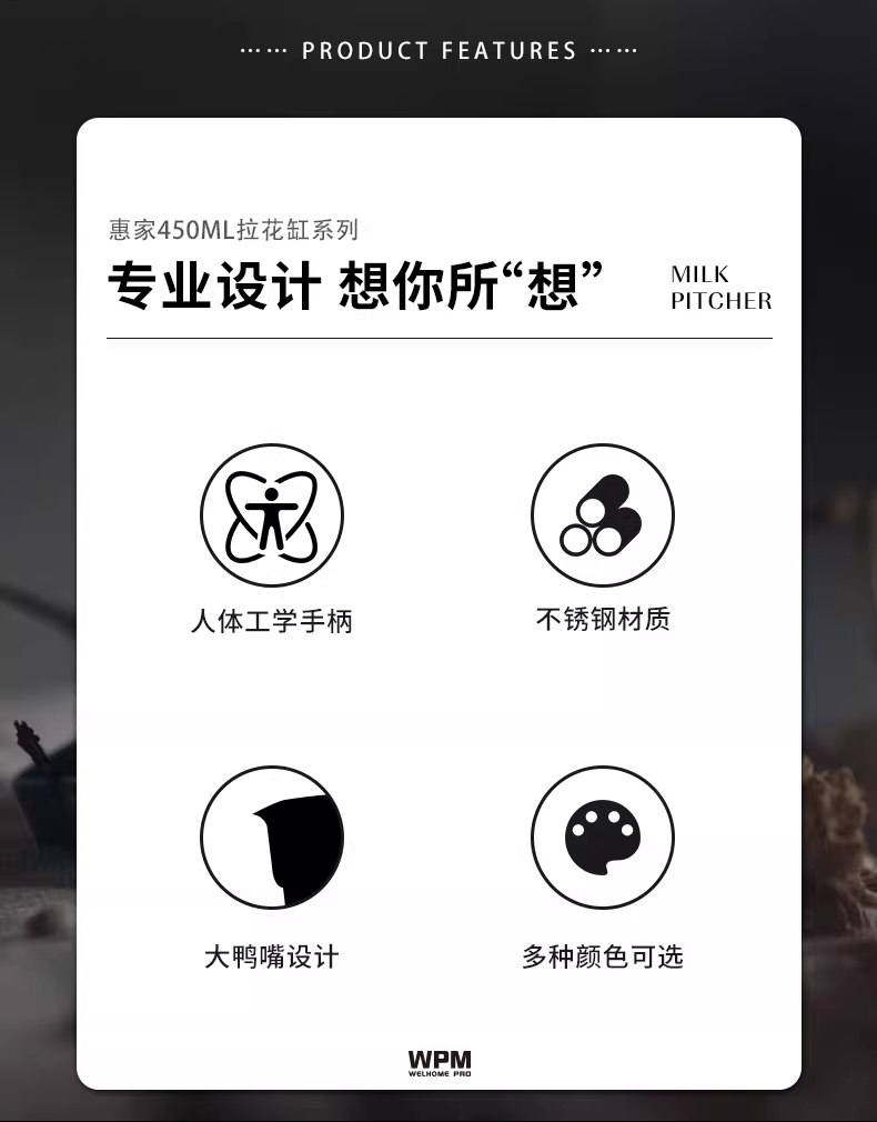 Bình tạo bọt sữa Latte Art Huijia WPM 450CC, chất liệu thép không gỉ, vòi nghiêng, vòi nhọn, vòi tròn, kiểu dáng Bomber