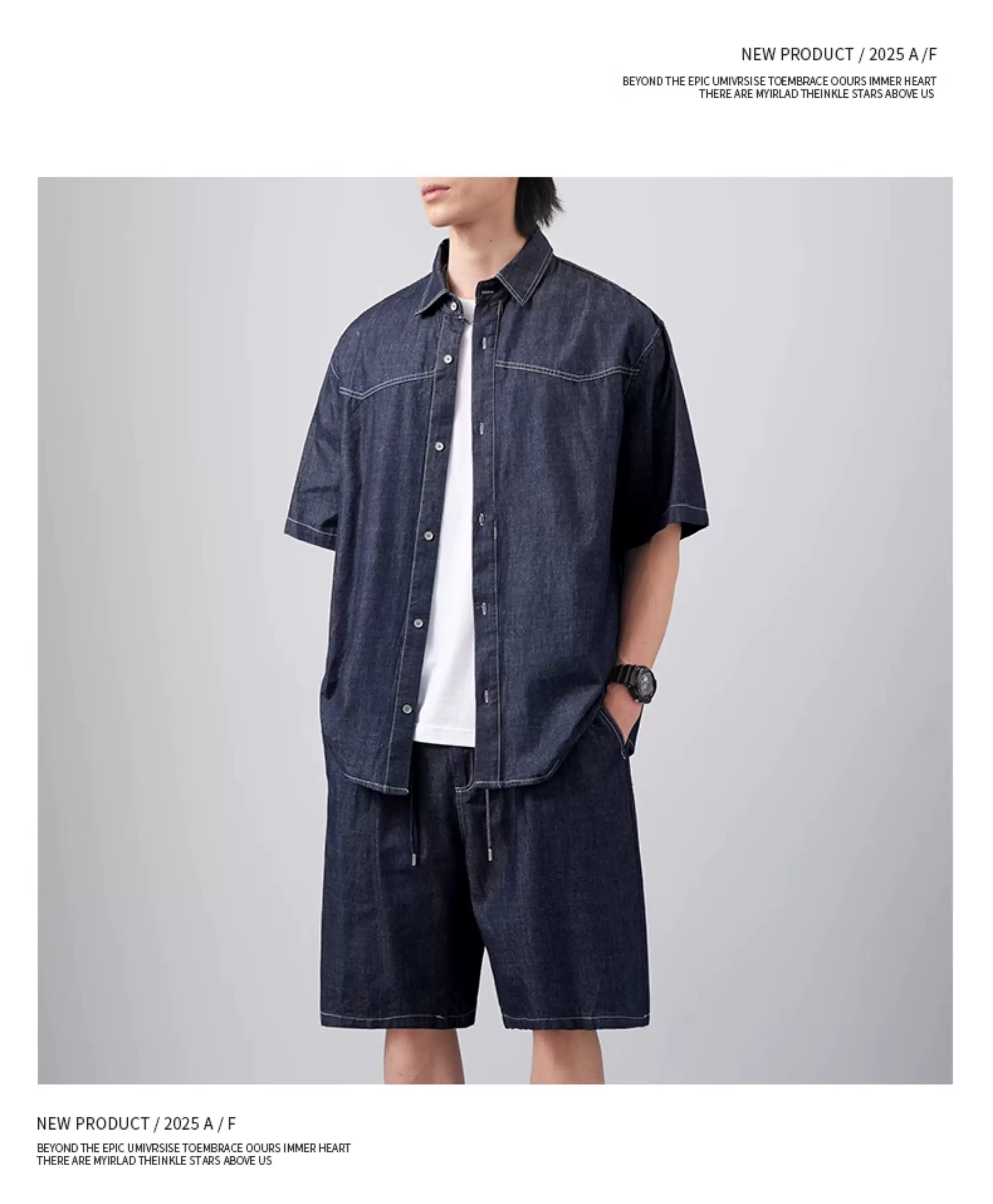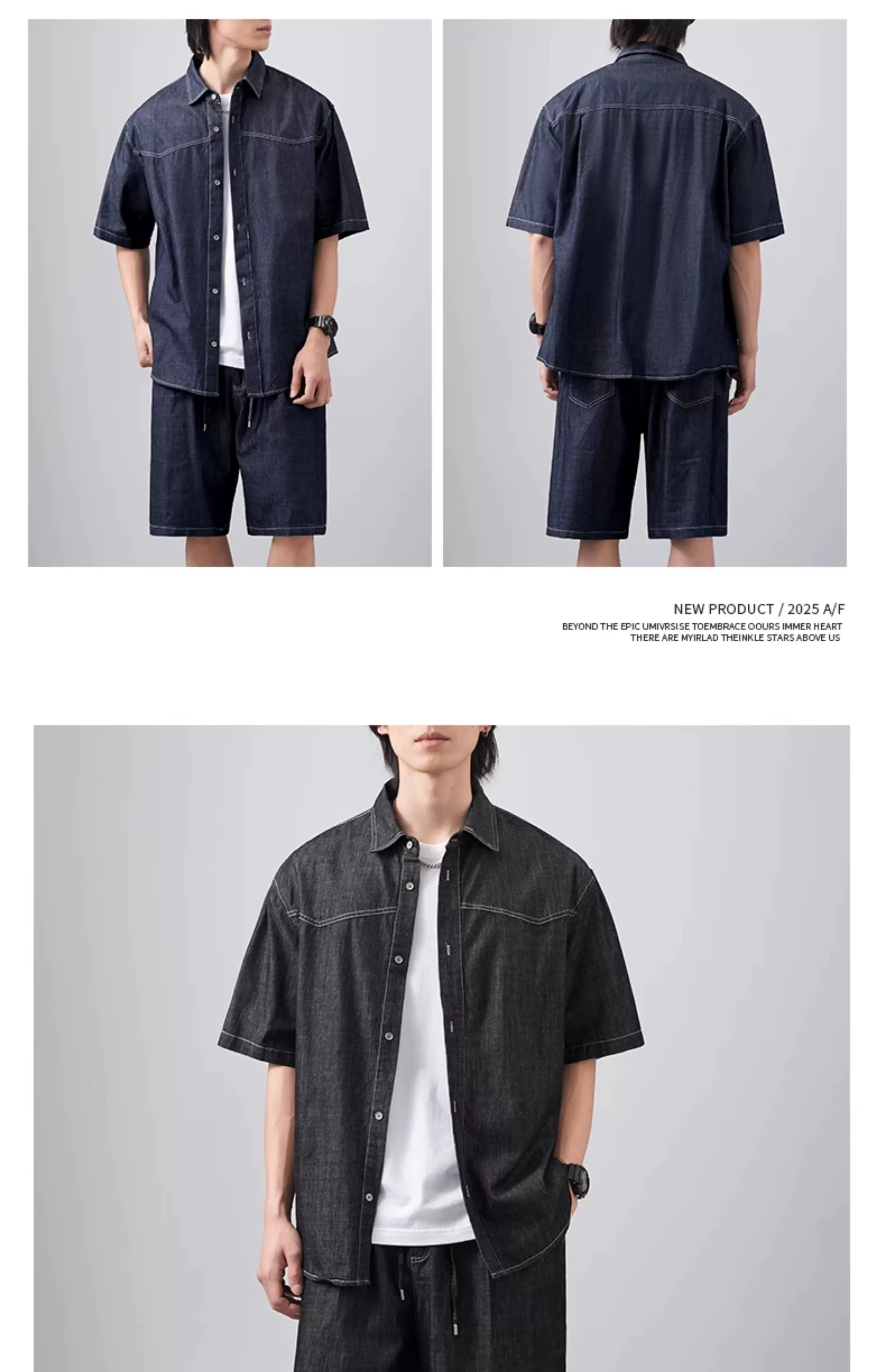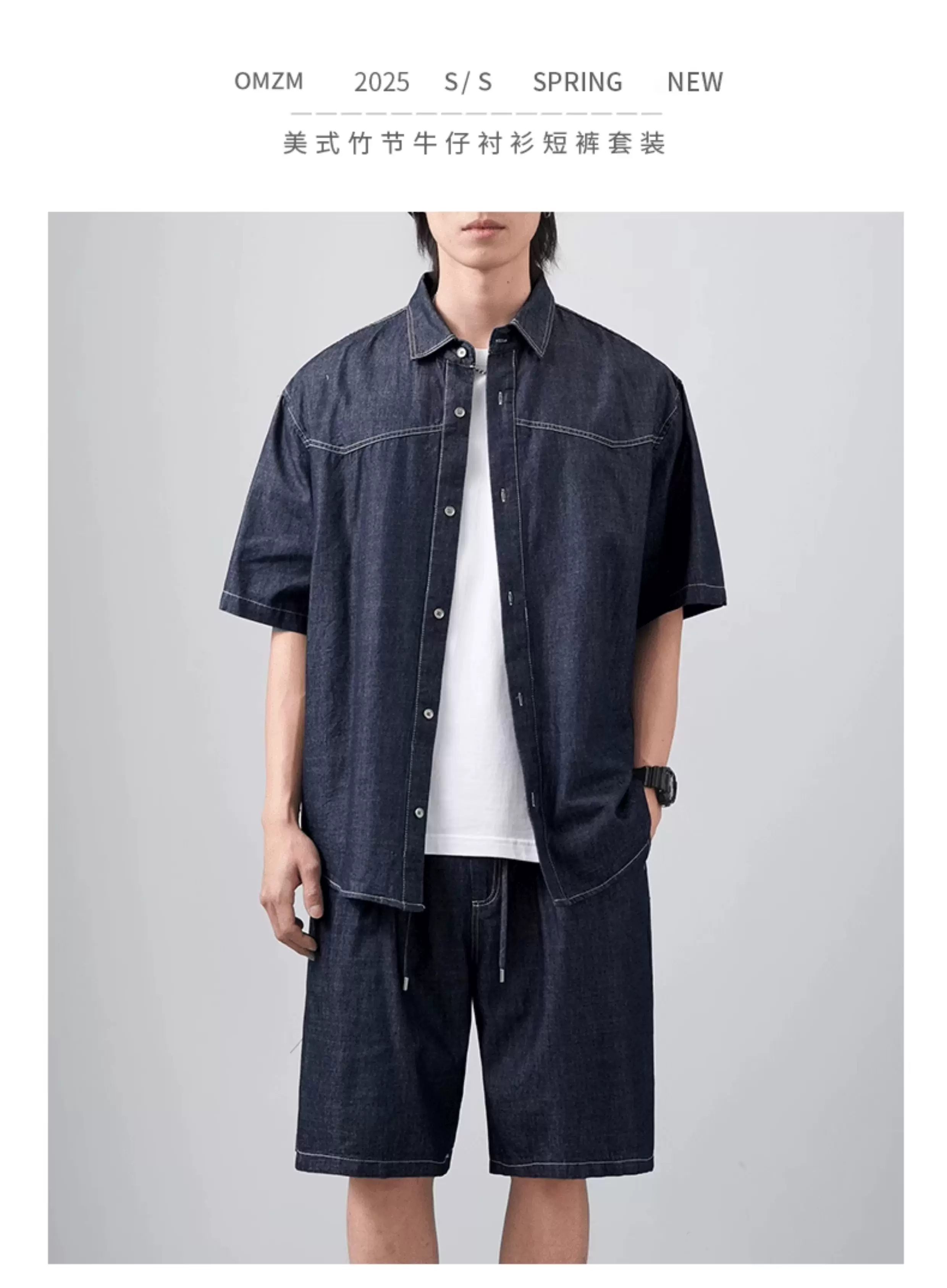 - Bộ áo sơ mi và quần short denim kiểu Mỹ OMZM dành cho nam, áo sơ mi có cổ dáng rộng mùa hè, bộ hai mảnh cổ điển cao cấp
