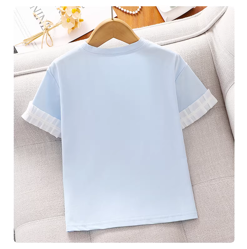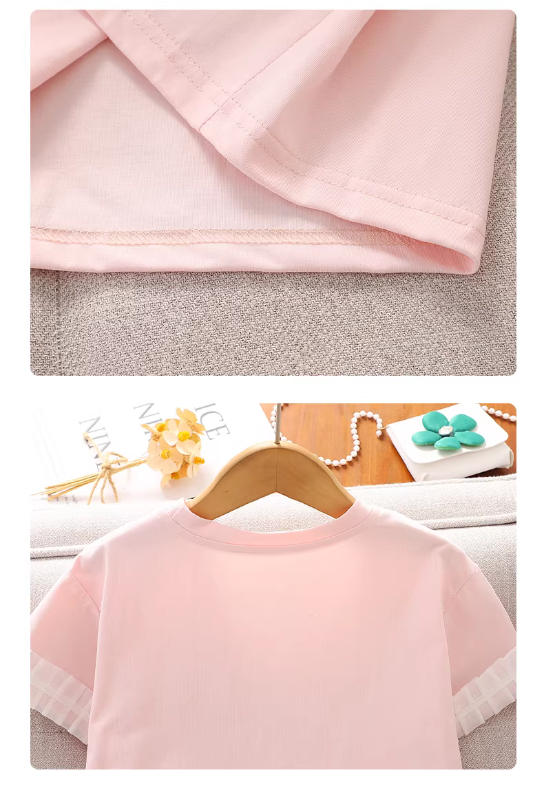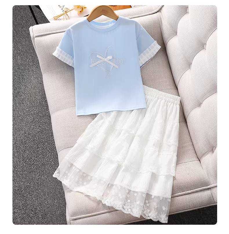 - Bộ đồ hè hai mảnh áo thun ngắn tay và chân váy cho bé gái, thời trang trẻ em lớn năm 2025, kiểu dáng năng động