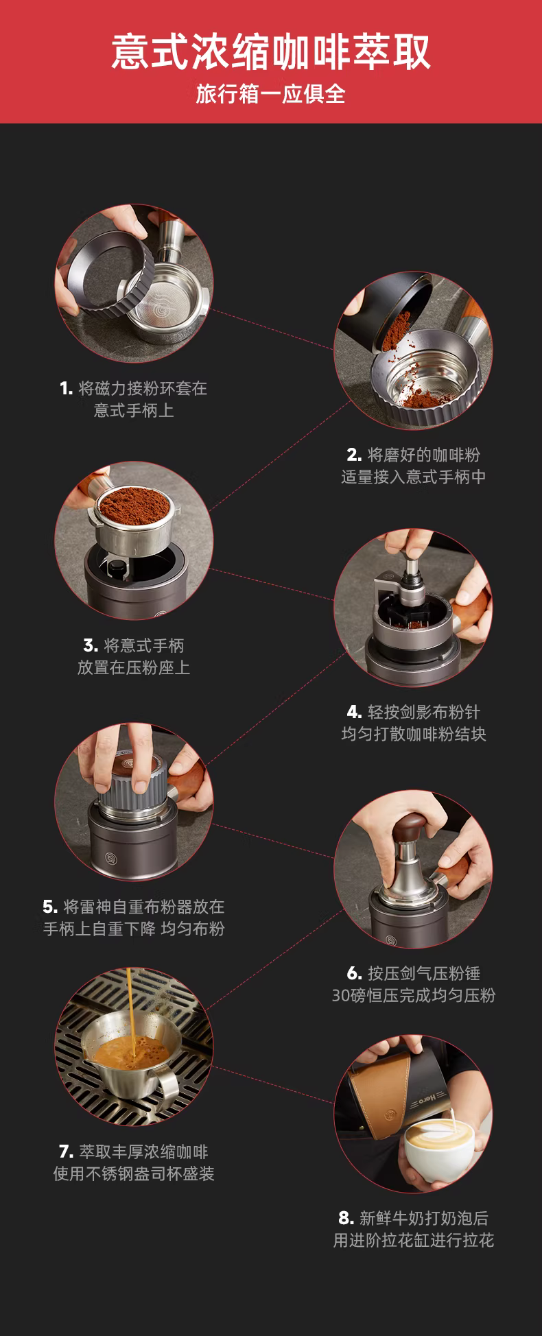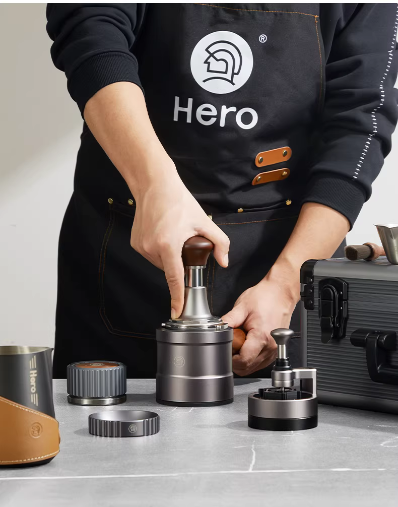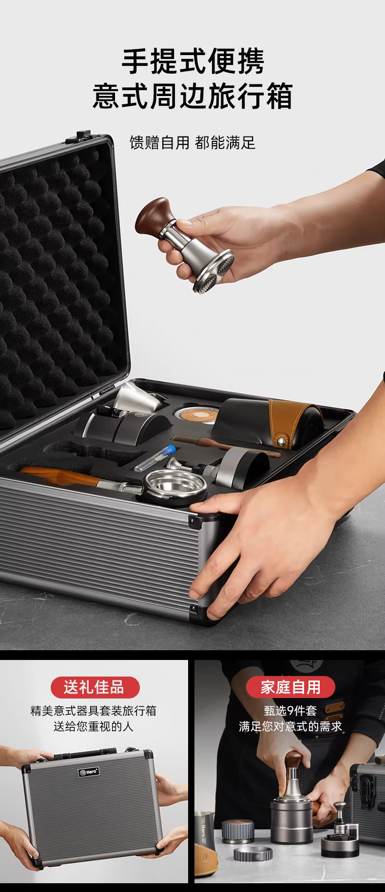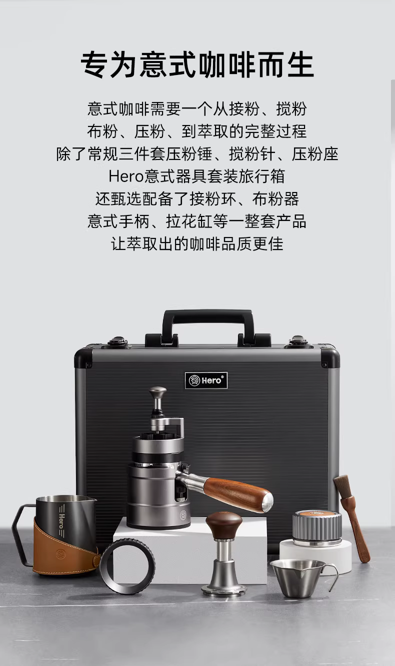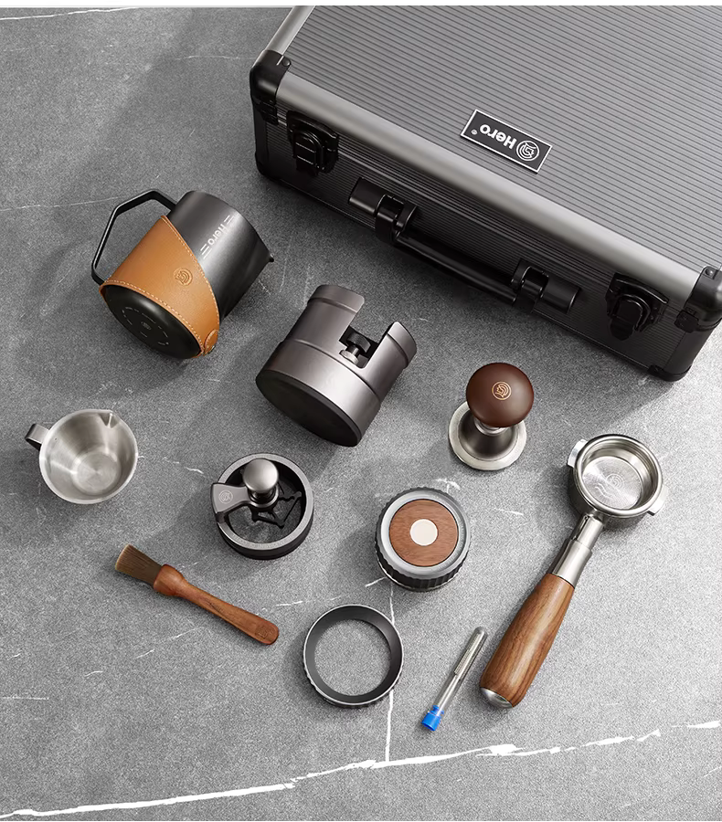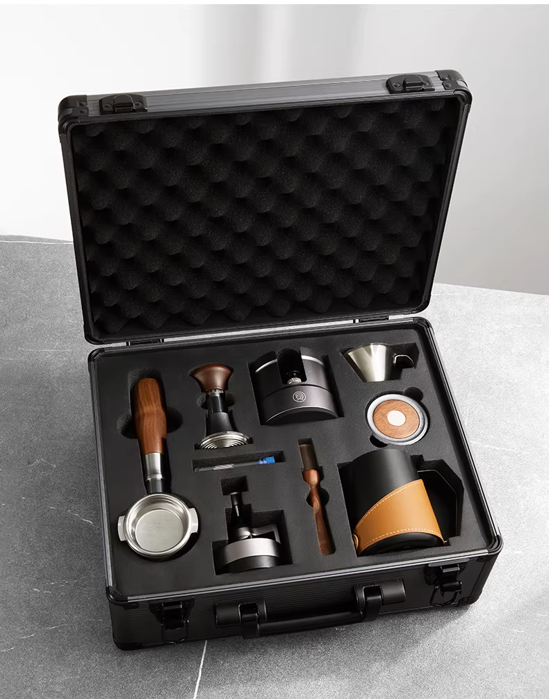 Bộ dụng cụ pha cà phê kiểu Ý gồm: vali đựng đồ nghề, bình tạo bọt sữa latte art, dụng cụ rắc bột, dụng cụ nén cà phê lực không đổi, tay cầm pha cà phê, bộ dụng cụ hoàn chỉnh.