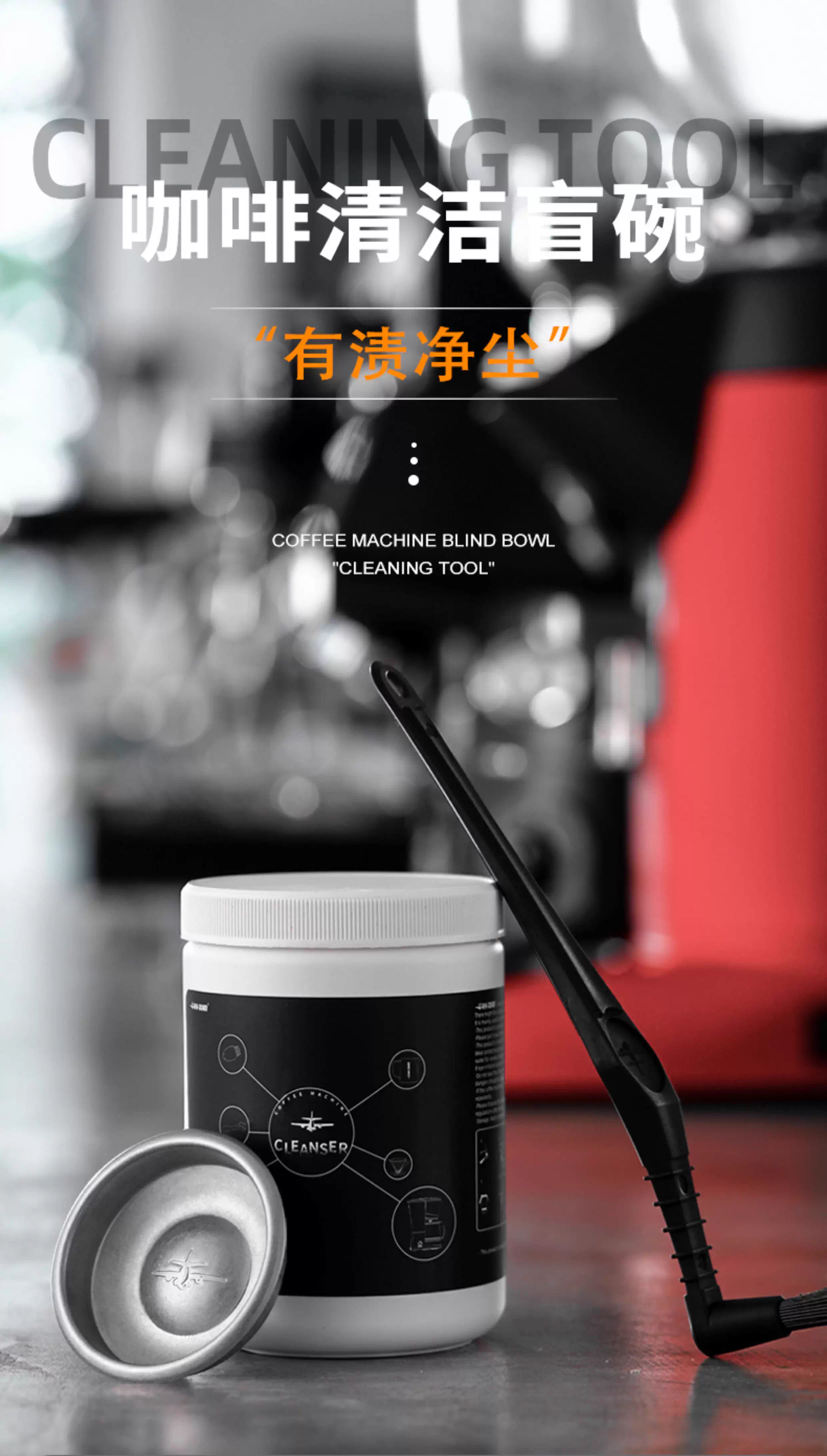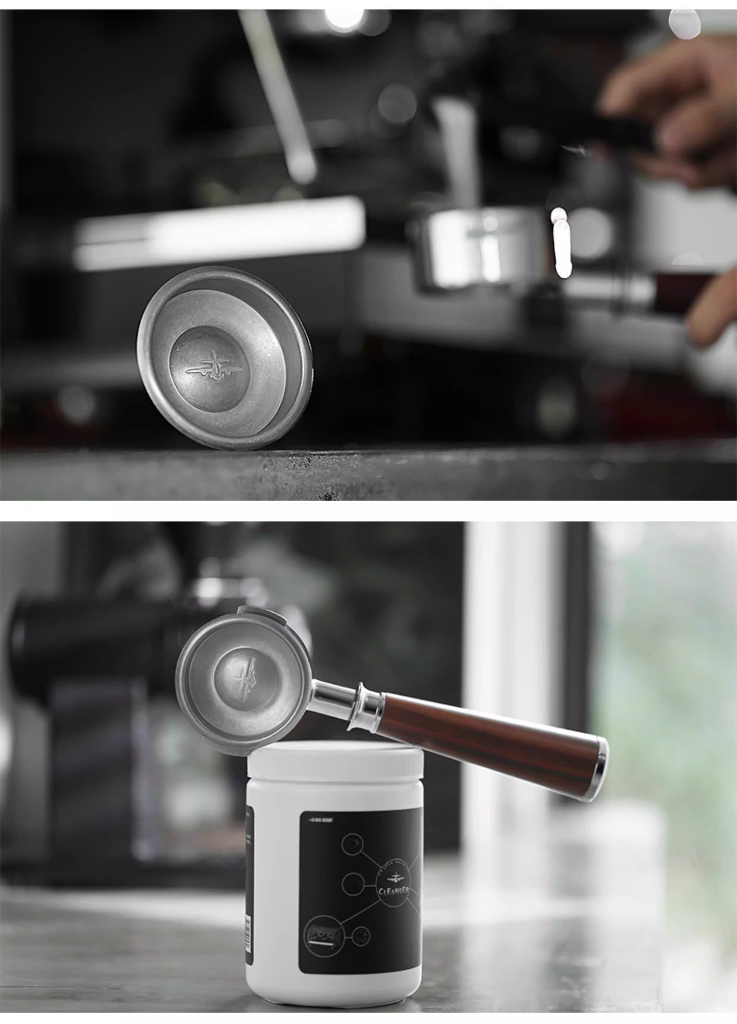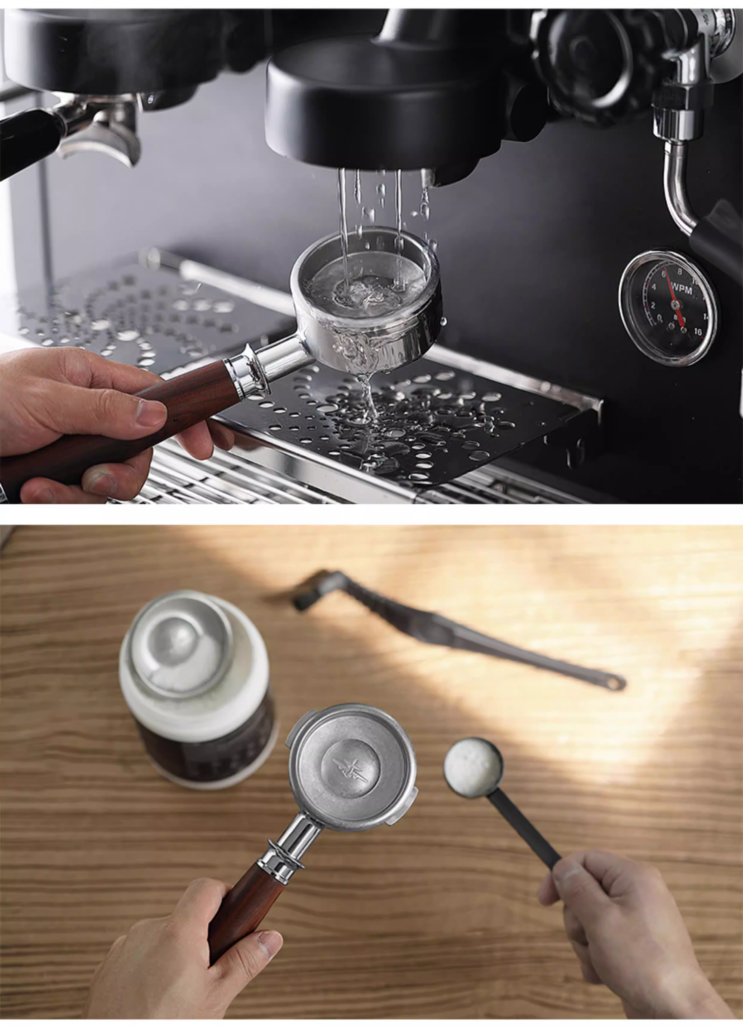 - Bộ dụng cụ vệ sinh máy pha cà phê espresso bán tự động, gồm chén vệ sinh bằng thép không gỉ 58mm, bàn chải vệ sinh, và chén đựng bột vệ sinh Bomber MHW.