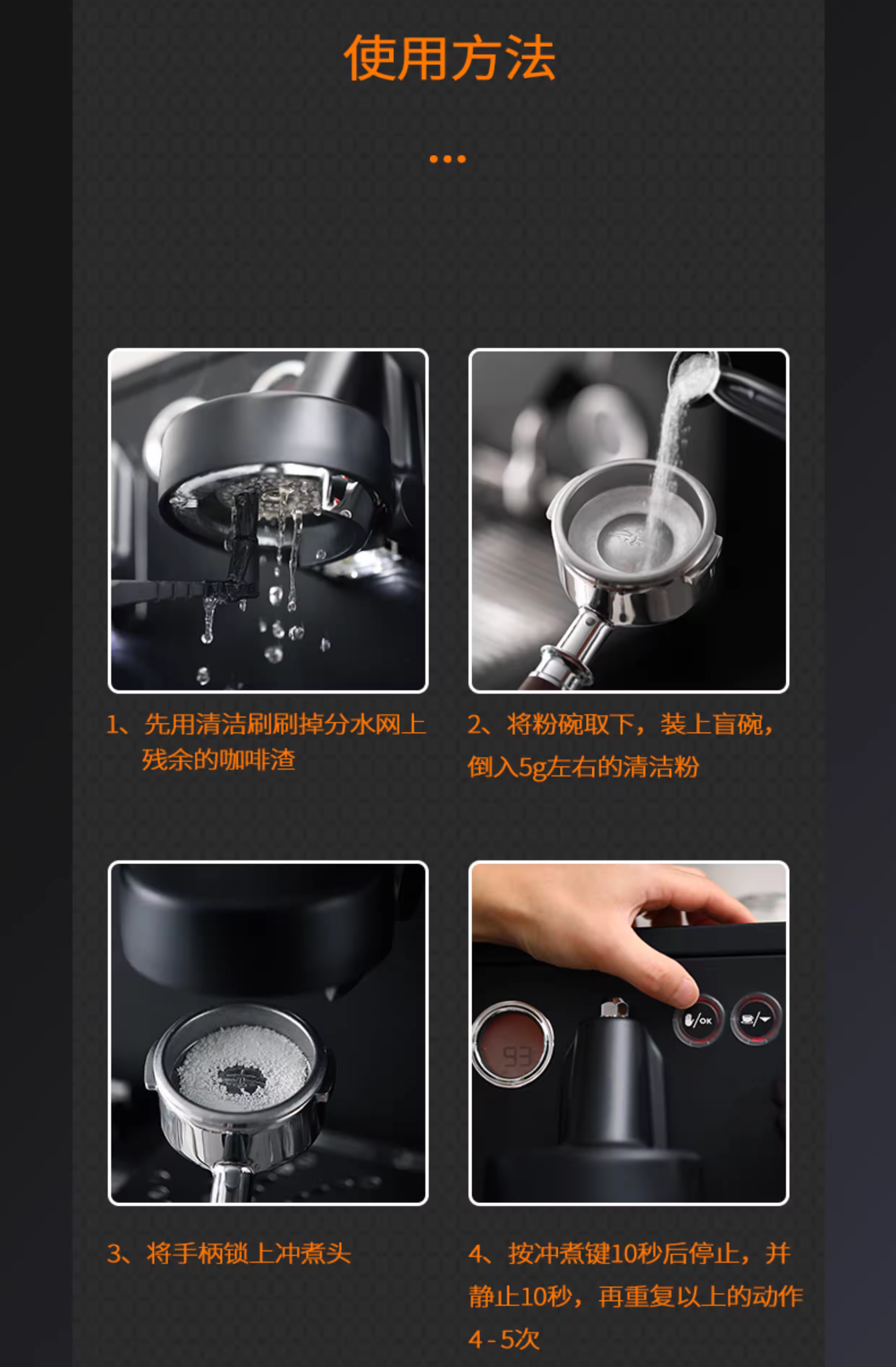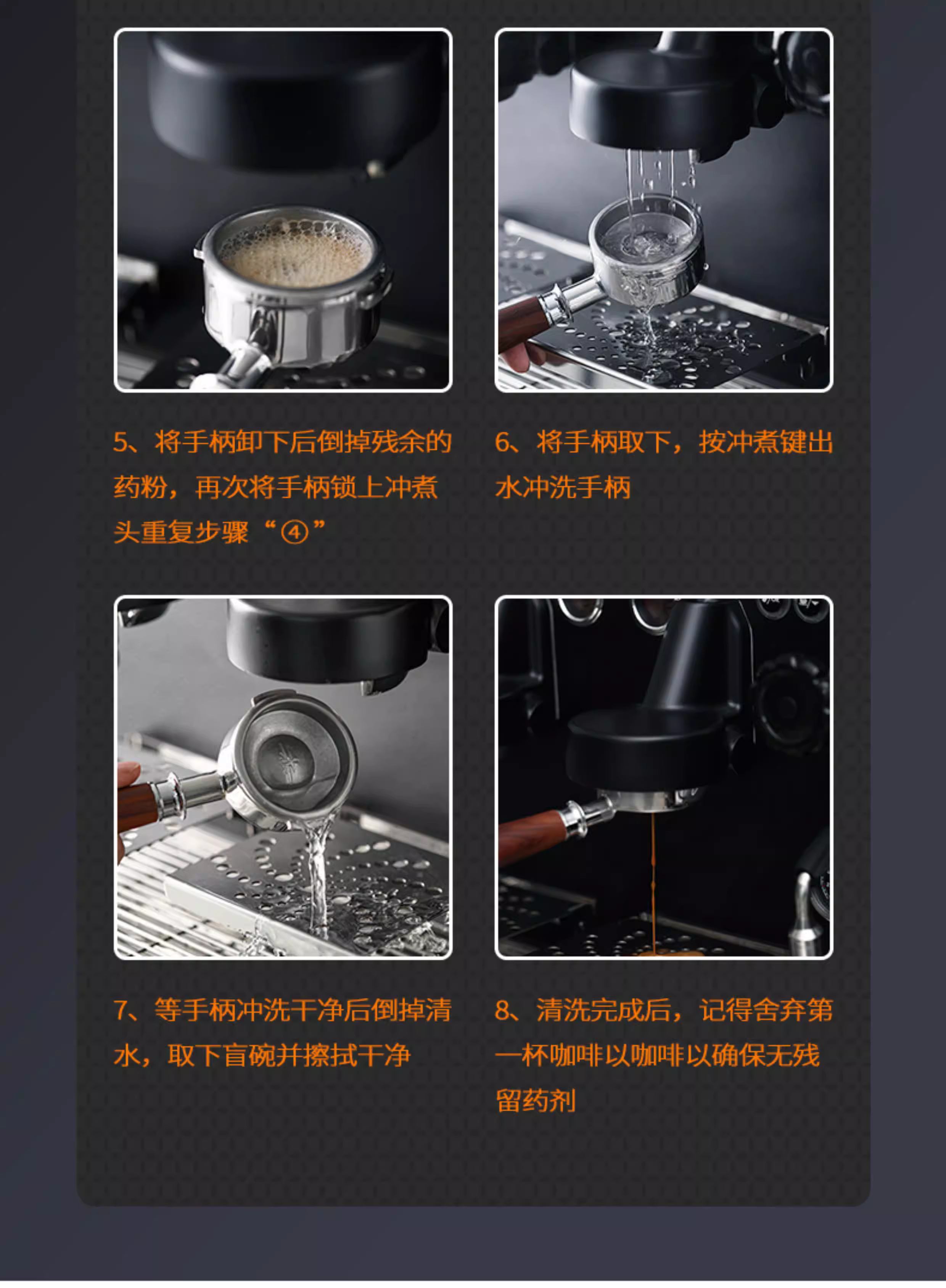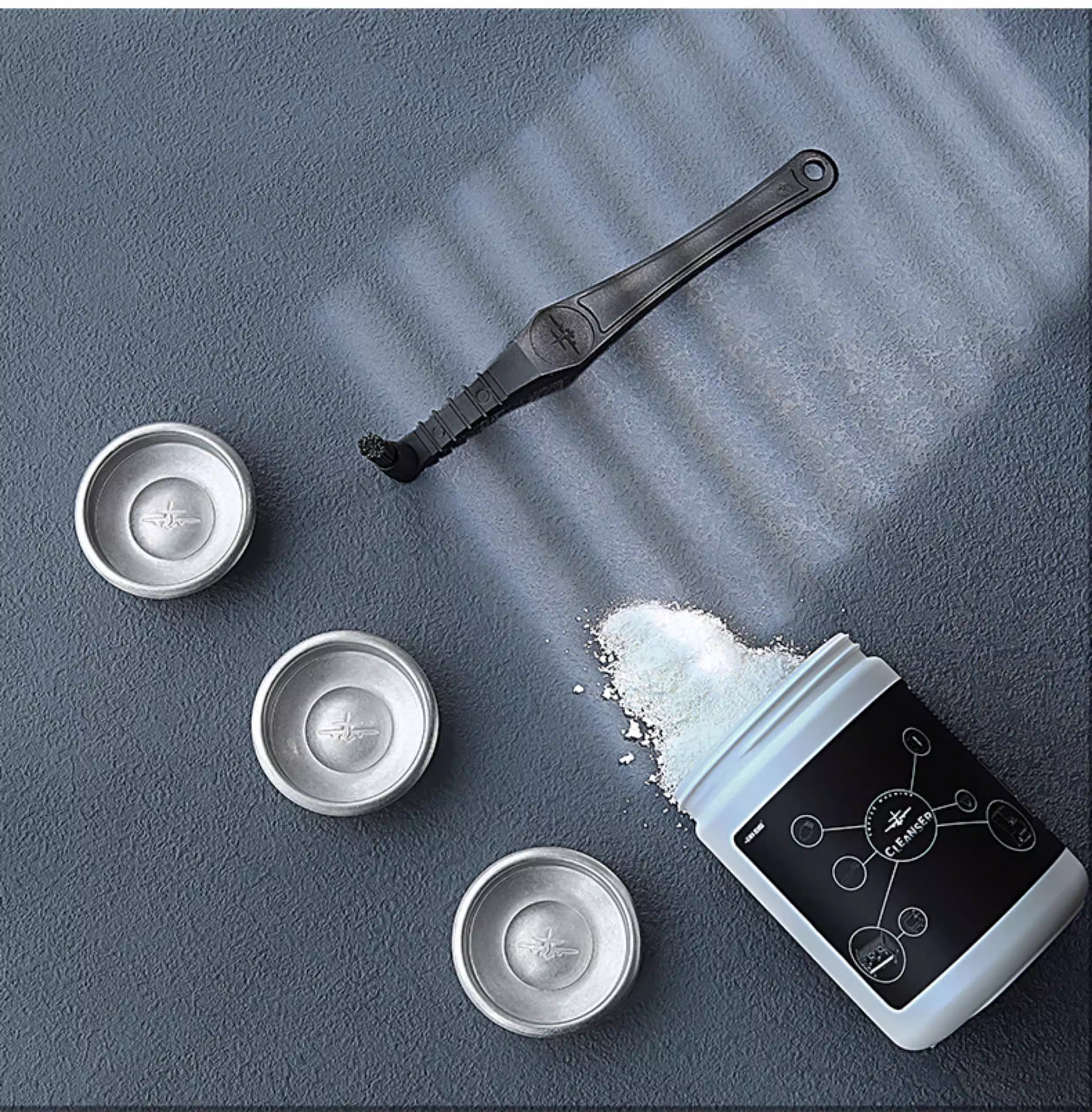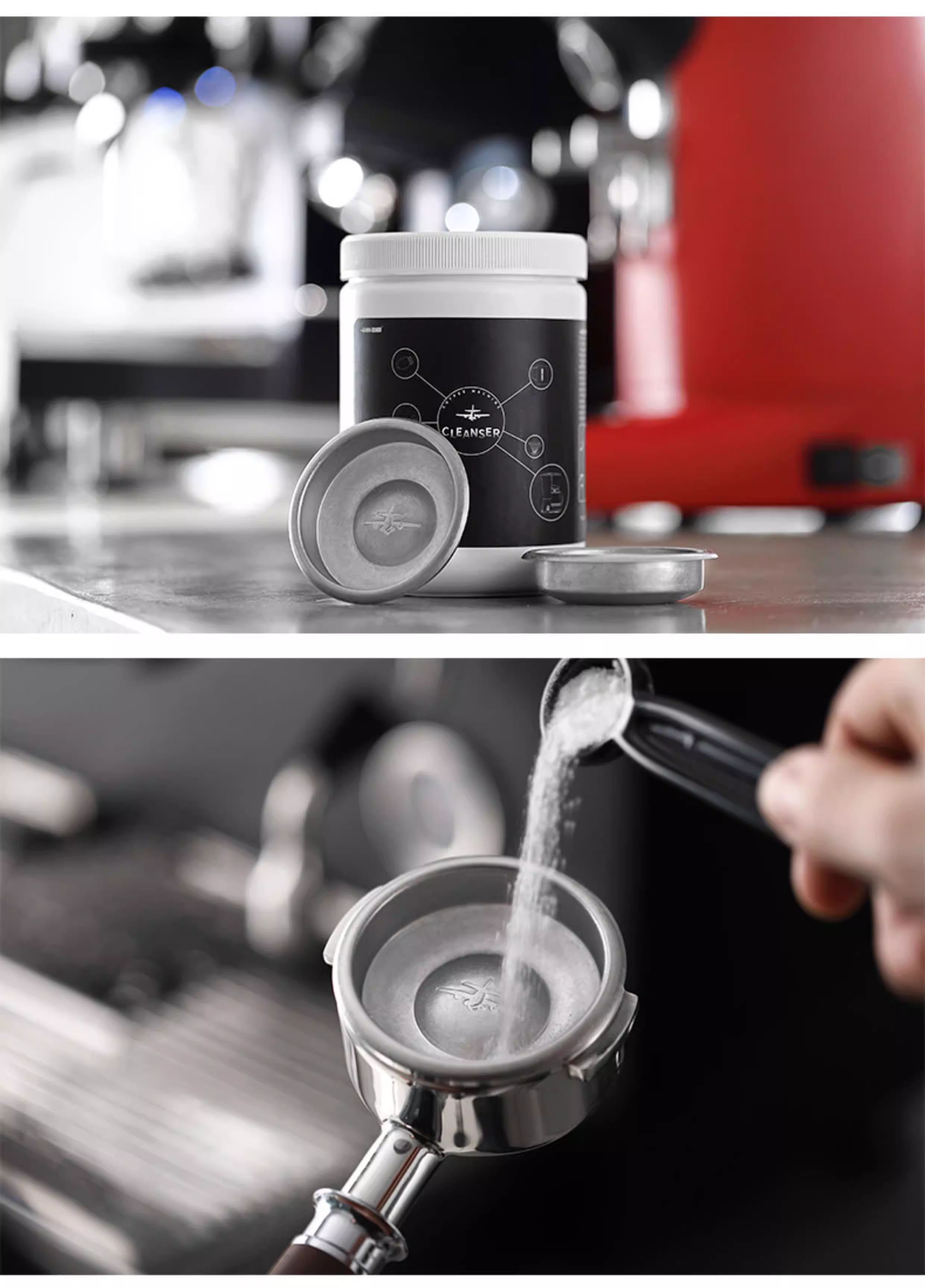 - Bộ dụng cụ vệ sinh máy pha cà phê espresso bán tự động, gồm chén vệ sinh bằng thép không gỉ 58mm, bàn chải vệ sinh, và chén đựng bột vệ sinh Bomber MHW.