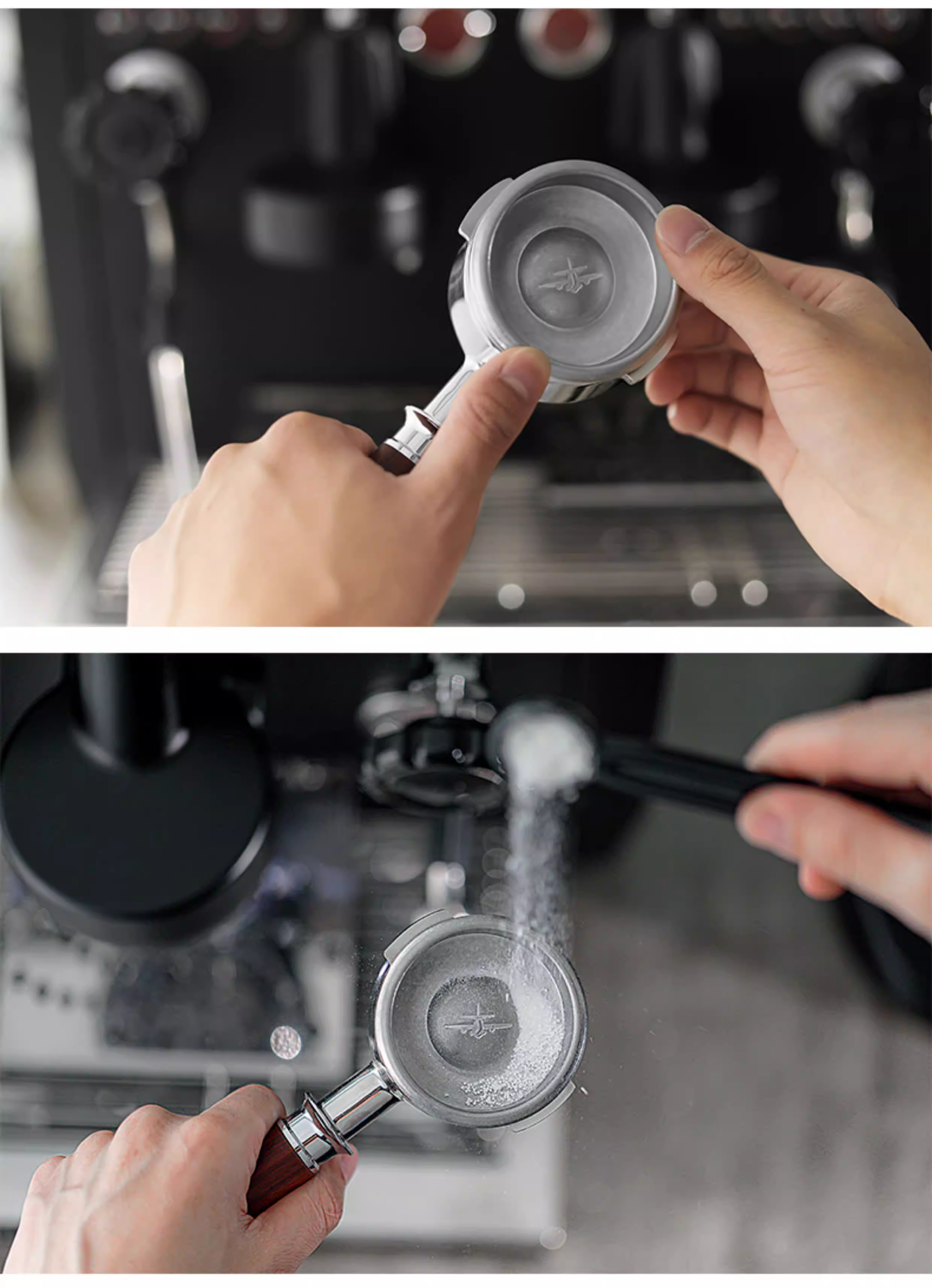 Bộ dụng cụ vệ sinh máy pha cà phê espresso bán tự động, gồm chén vệ sinh bằng thép không gỉ 58mm, bàn chải vệ sinh, và chén đựng bột vệ sinh Bomber MHW.