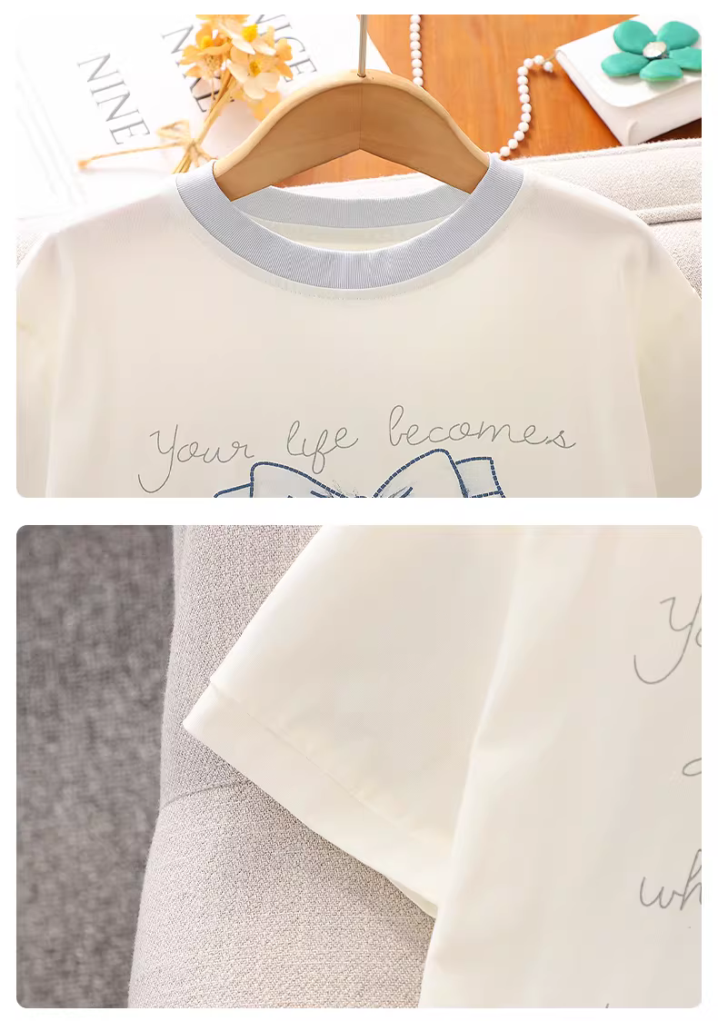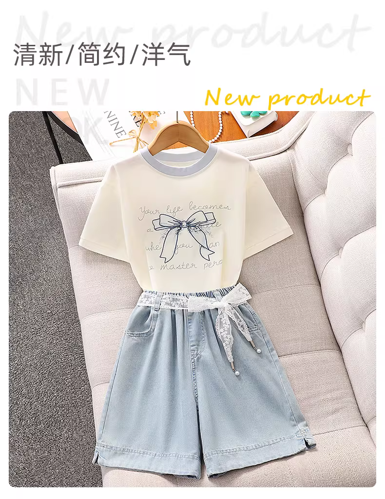 Bộ trang phục hè cho bé gái 2025 kiểu mới, phong cách thường ngày, áo ngắn tay mỏng, quần short denim hai mảnh