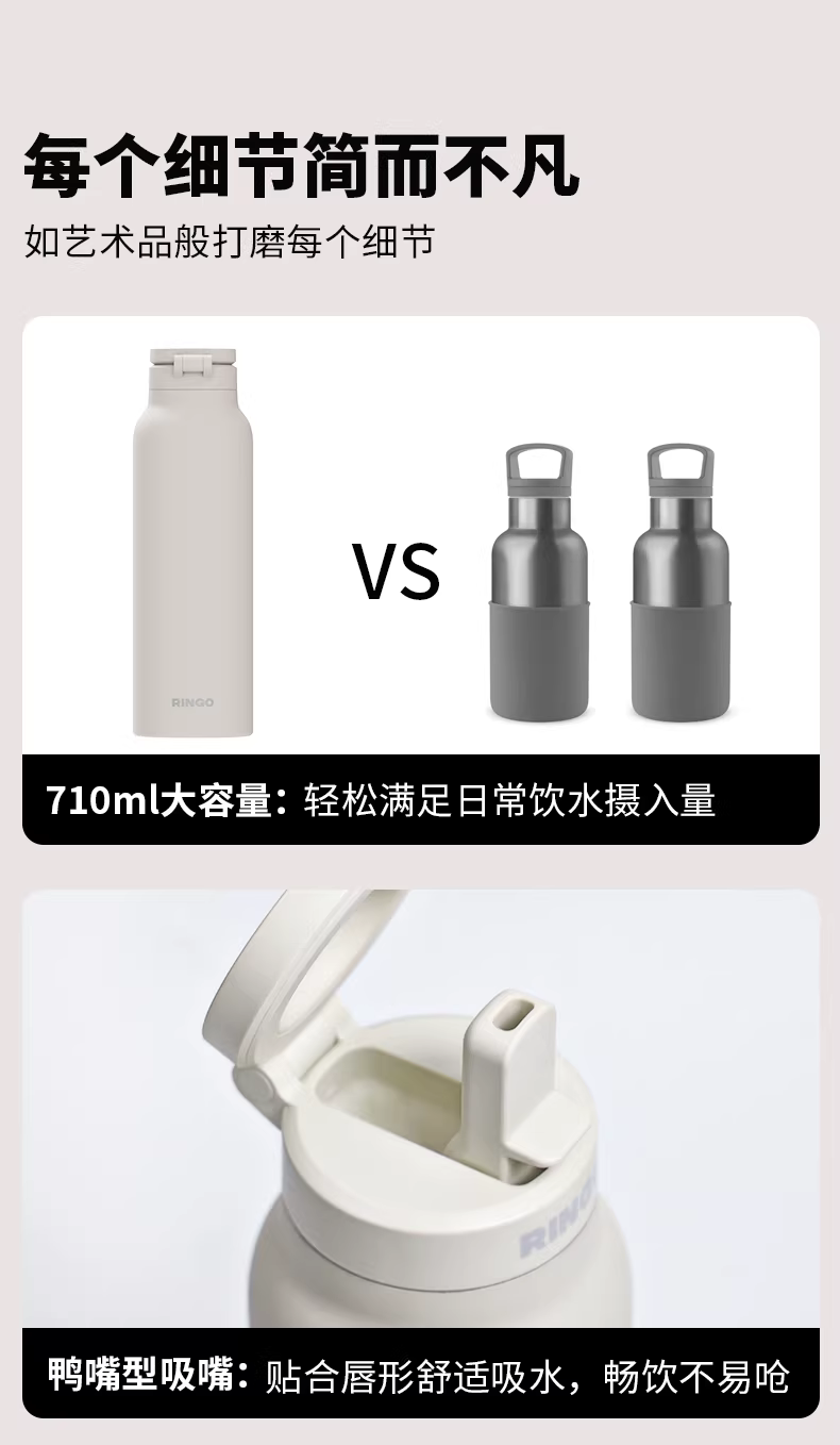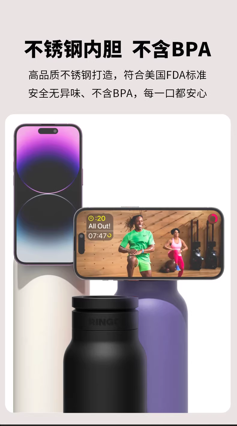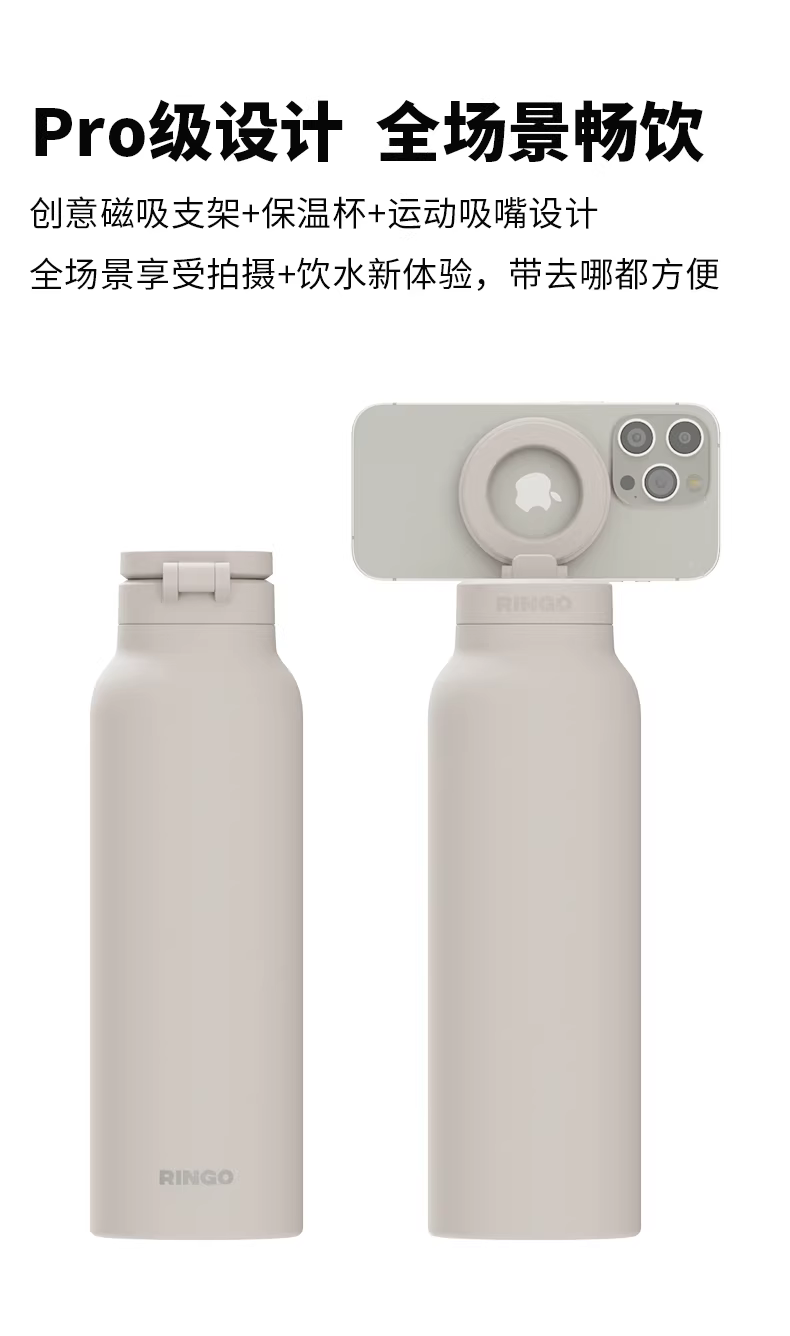 - Cốc giữ nhiệt Ringo bằng thép không gỉ, tích hợp giá đỡ điện thoại để xem phim và chụp ảnh, kèm ống hút.