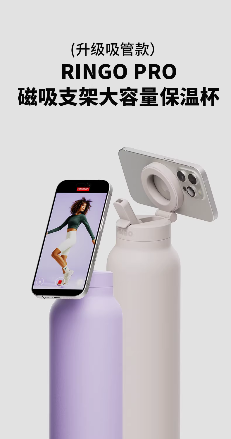 Cốc giữ nhiệt Ringo bằng thép không gỉ, tích hợp giá đỡ điện thoại để xem phim và chụp ảnh, kèm ống hút.