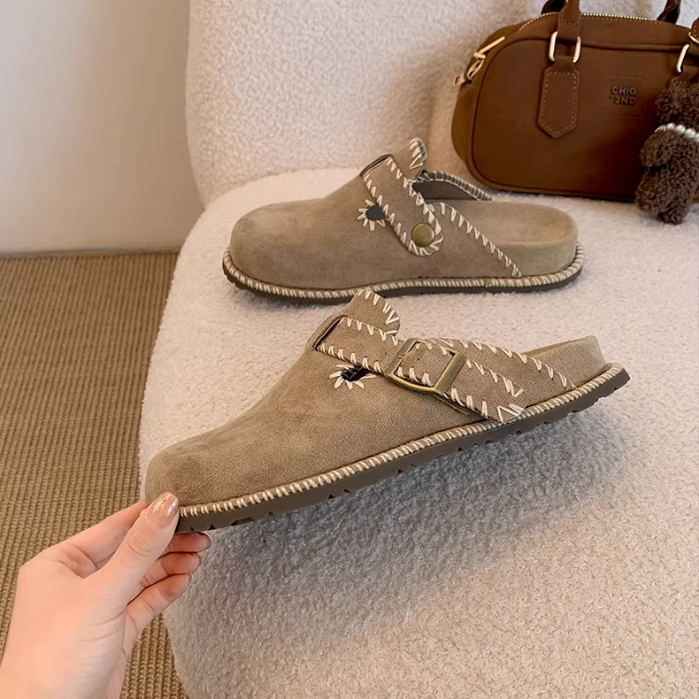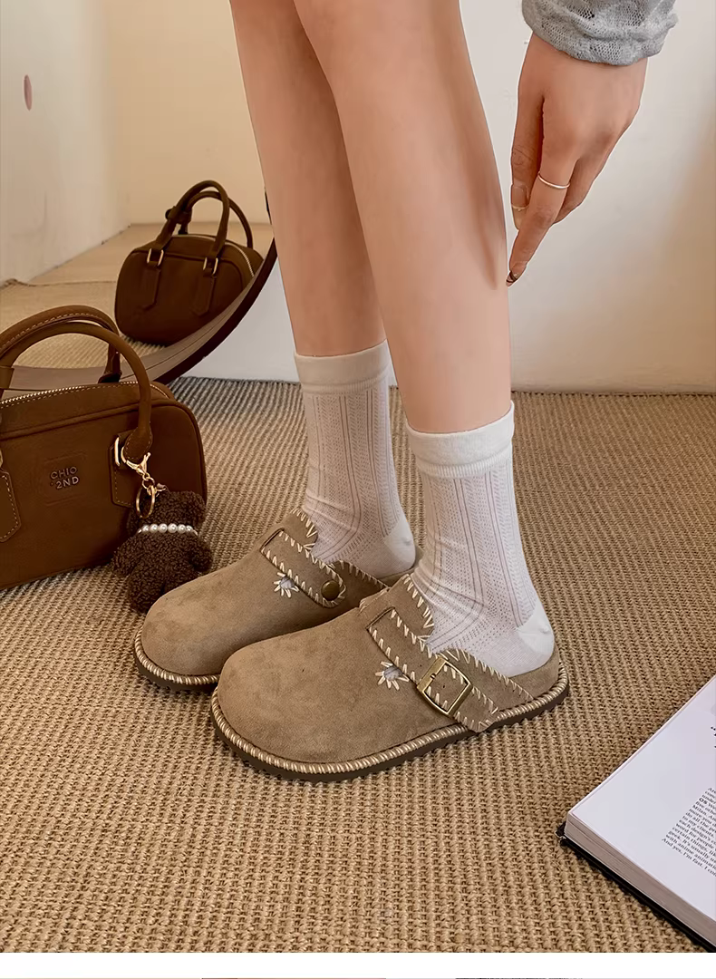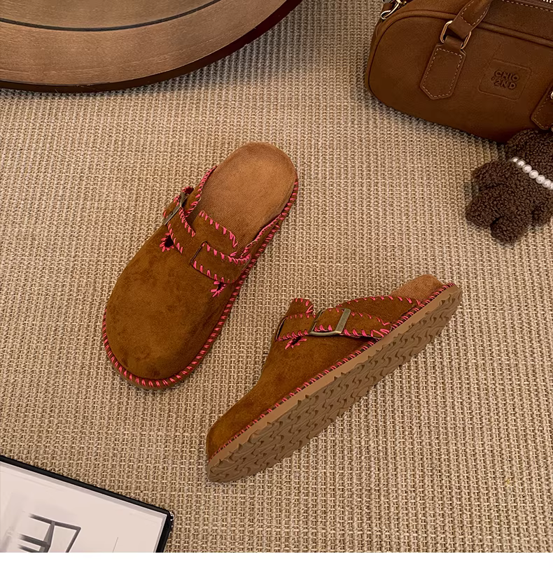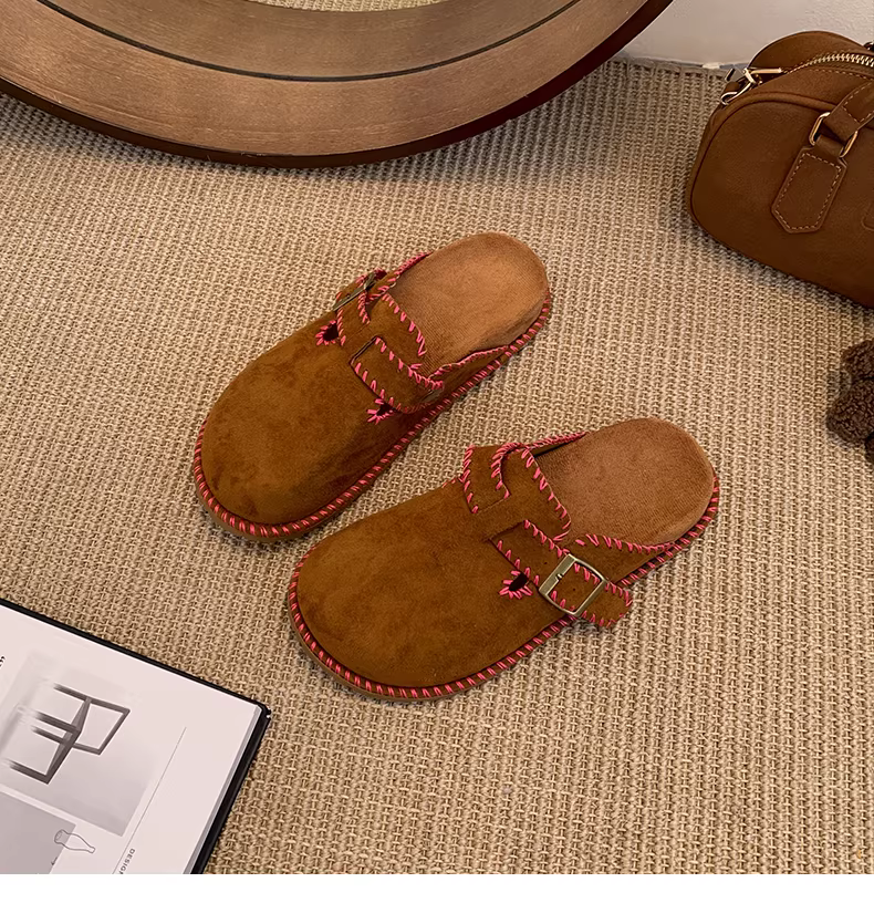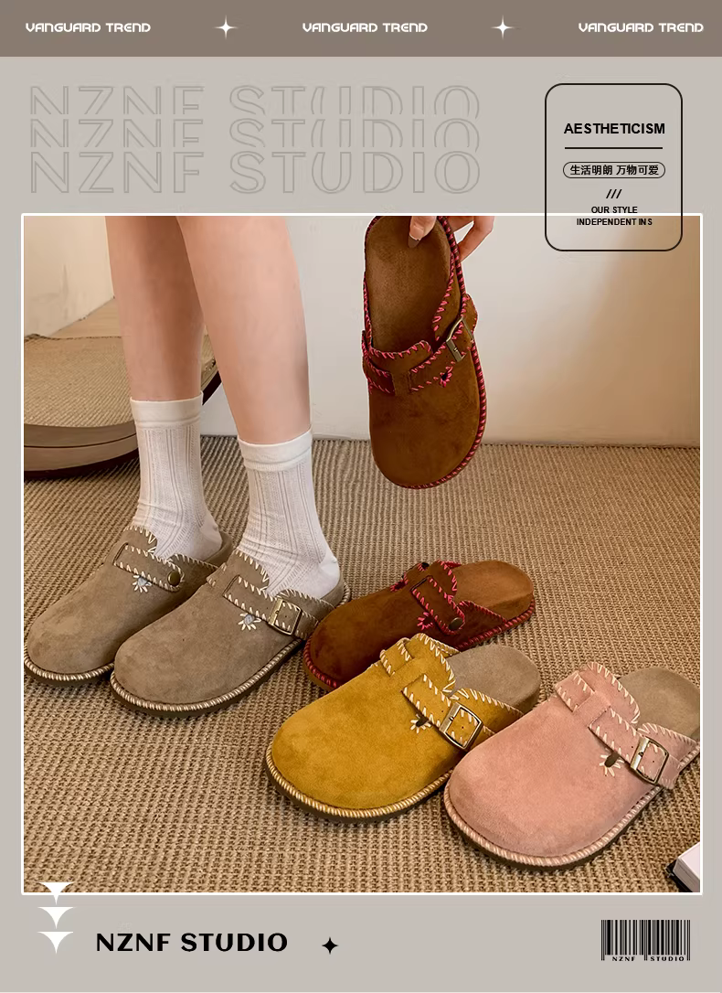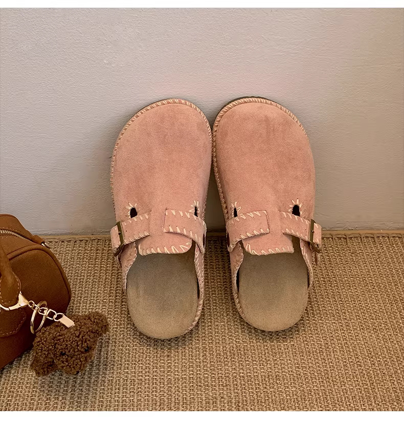 Dép lê mũi tròn kiểu retro phổ biến dành cho nữ, áo khoác ngoài mùa thu, giày Birkenstock nửa đế màu hồng đa năng chống trơn trượt mới năm 2025
