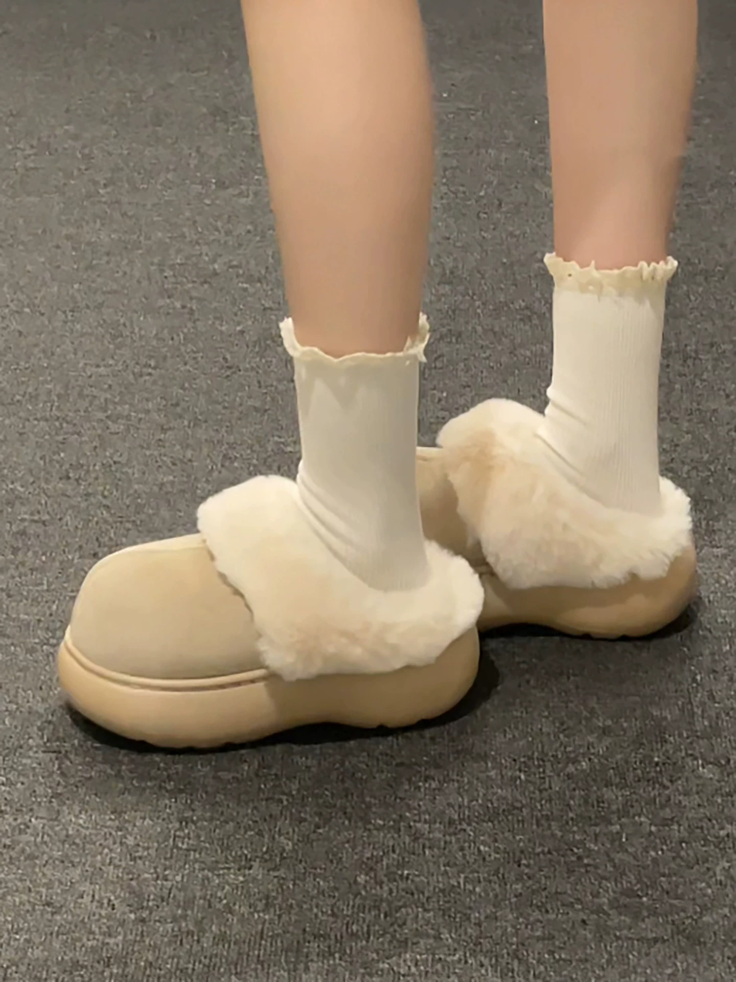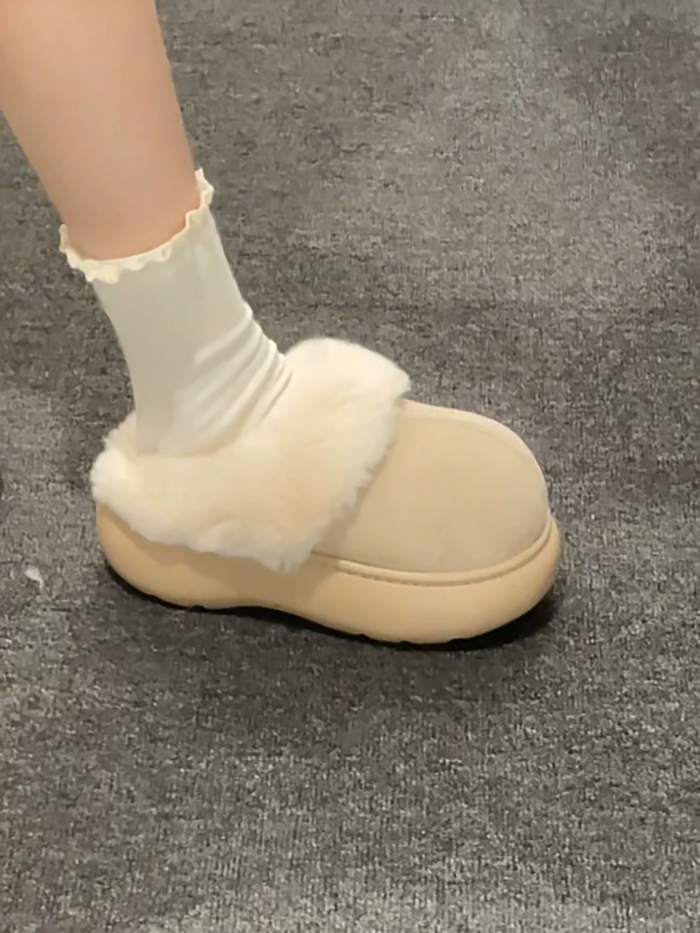 - Dép lông dày đế dày chống trơn kiểu cổ điển màu trắng dành cho nữ, thích hợp để mang ngoài trời, dép bông đế mềm mũi kín tăng chiều cao mùa thu đông 2025 mới.