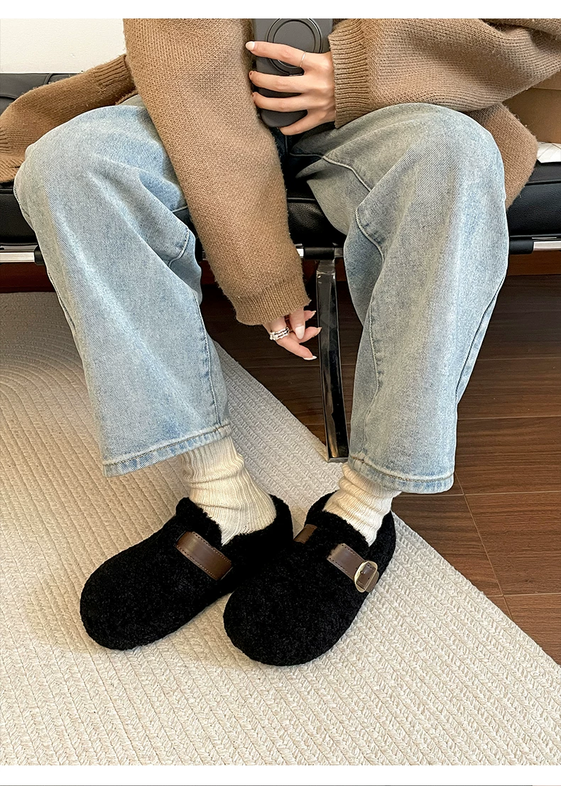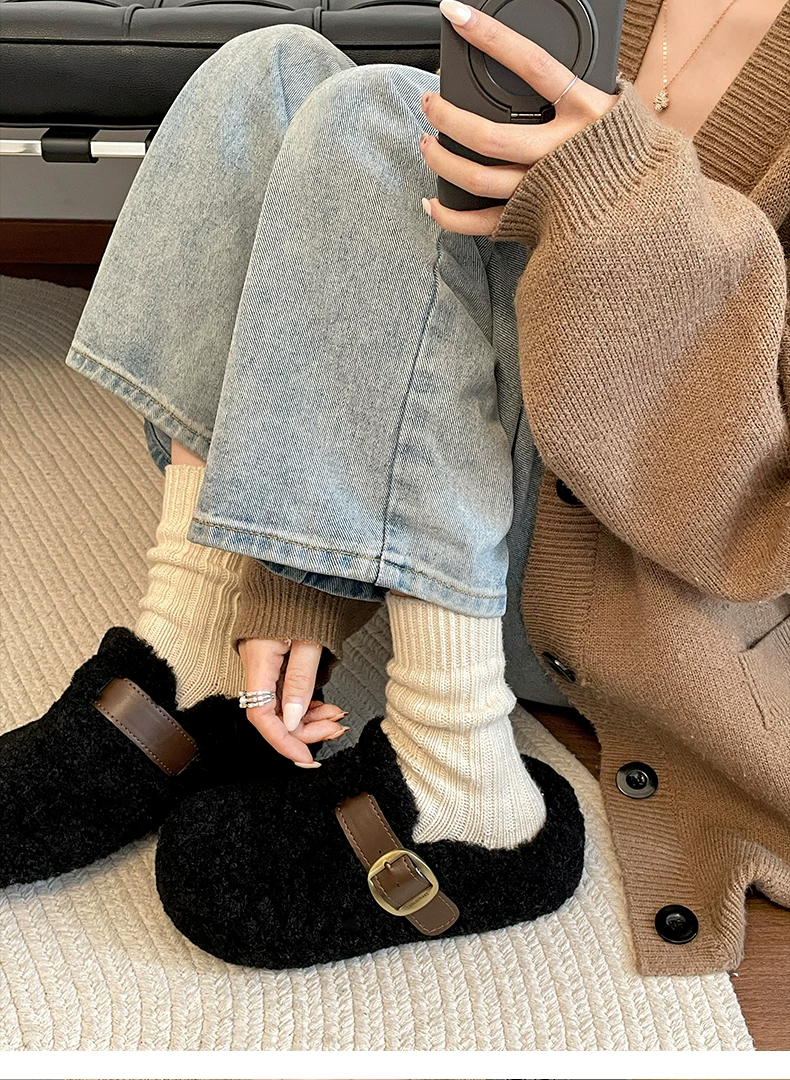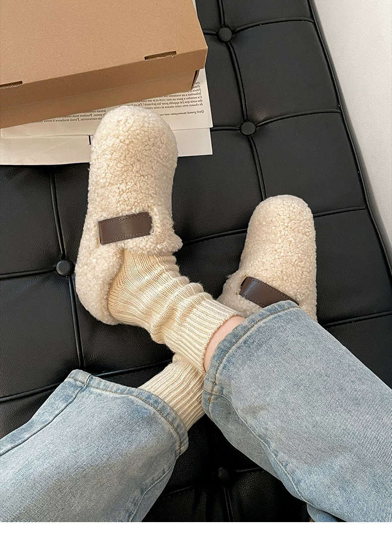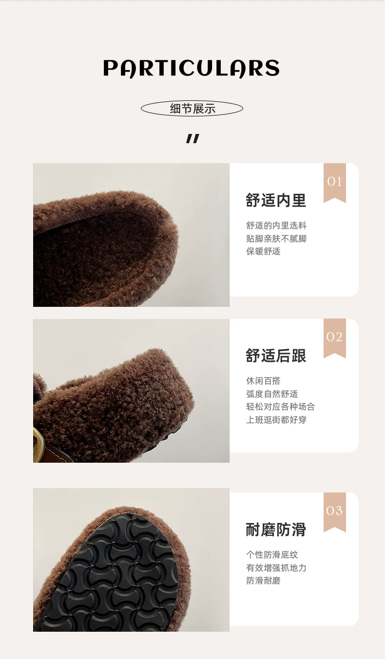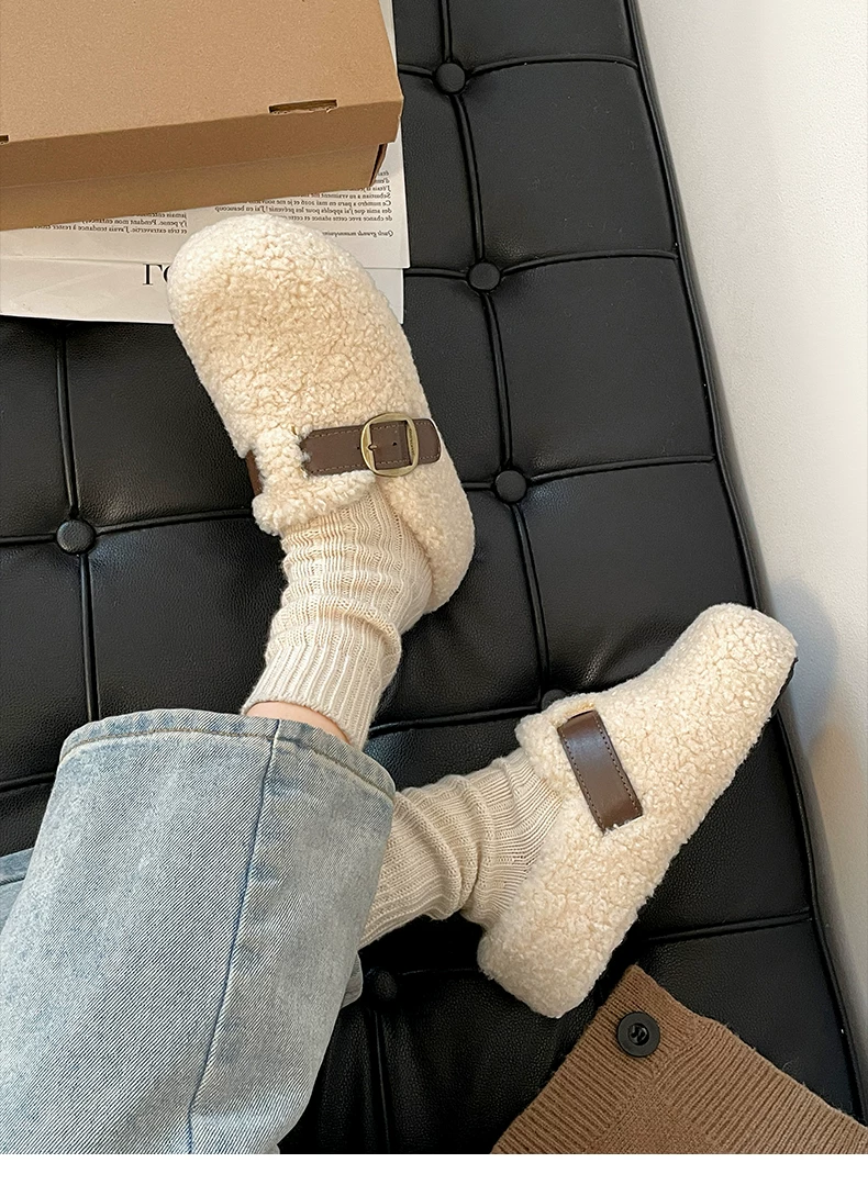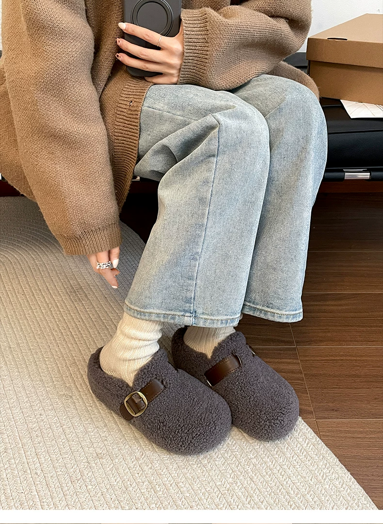 Dép lông dày đế dày chống trơn màu trắng cổ điển dành cho nữ, mặc ngoài trời mùa đông, kiểu mới 2025, lót lông cừu, dày dặn, ấm áp kiểu Birkenstock.