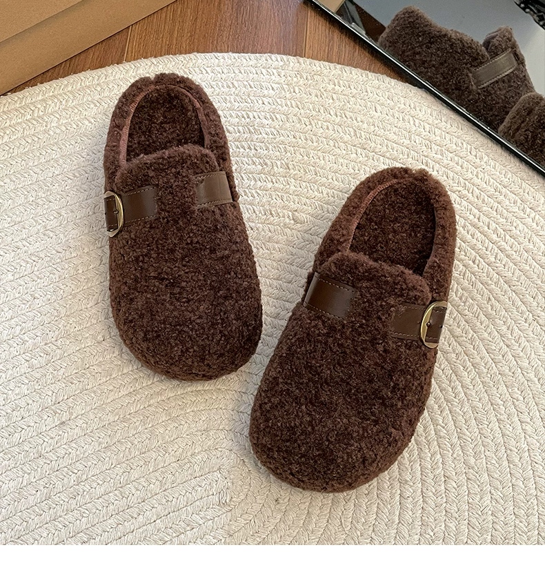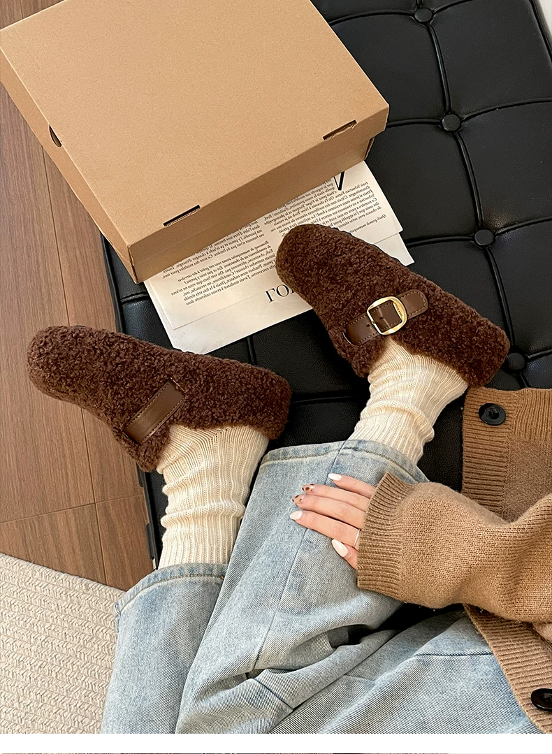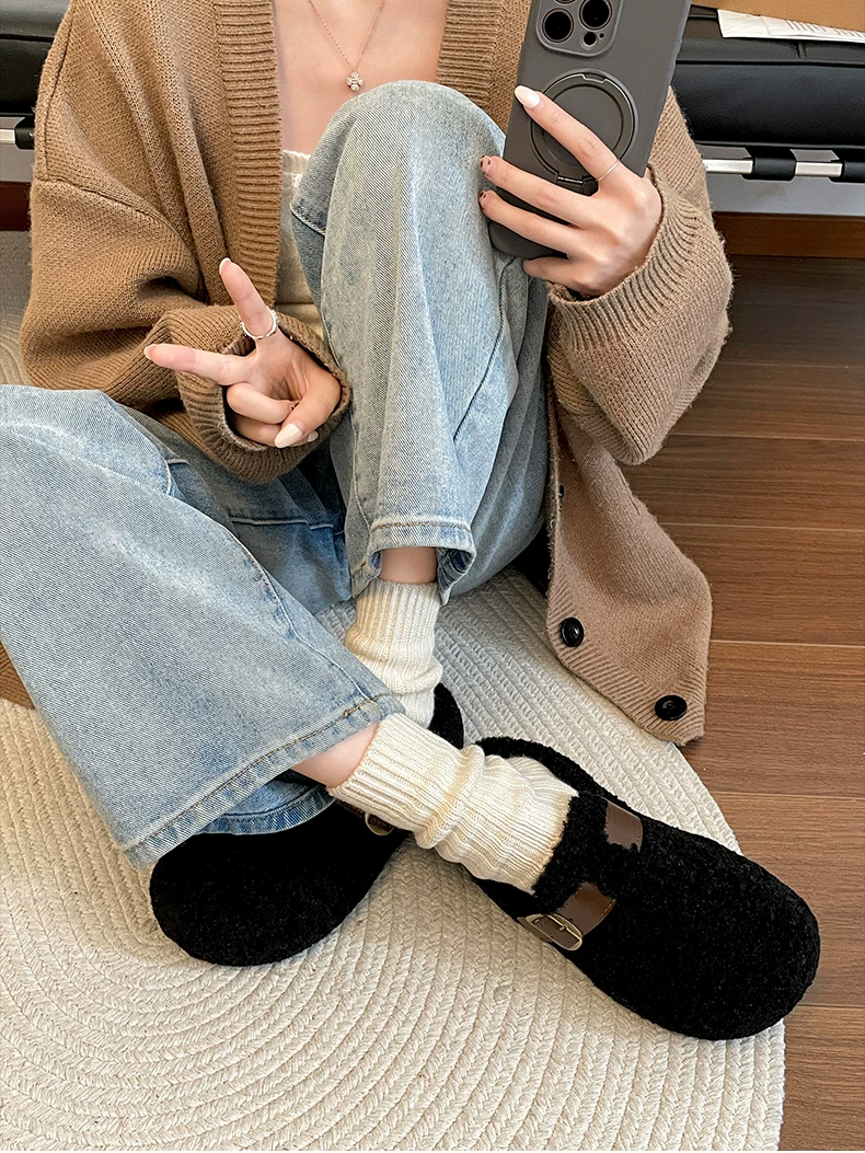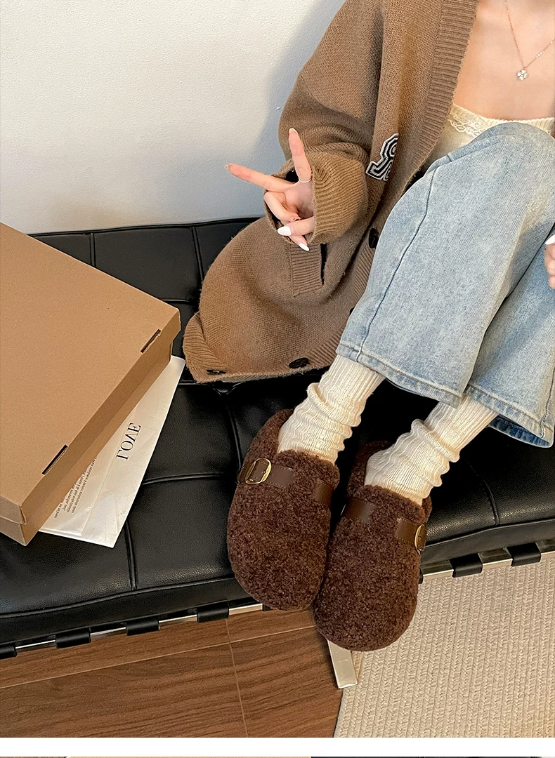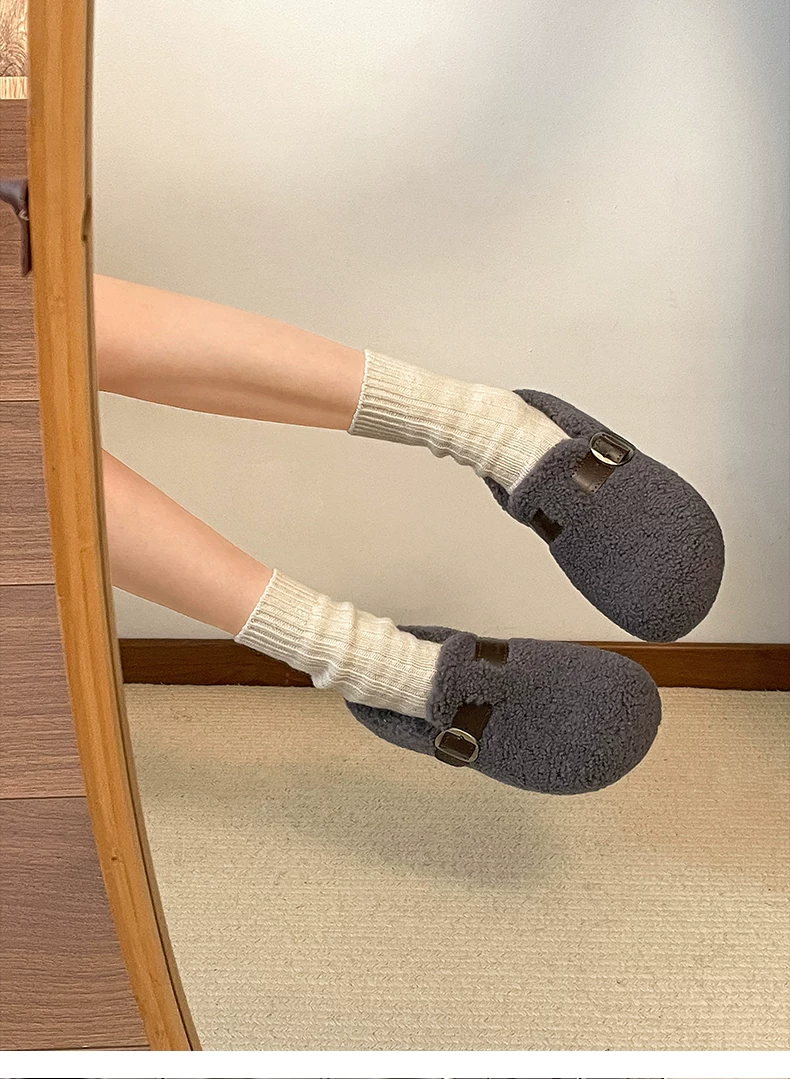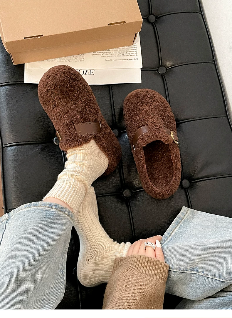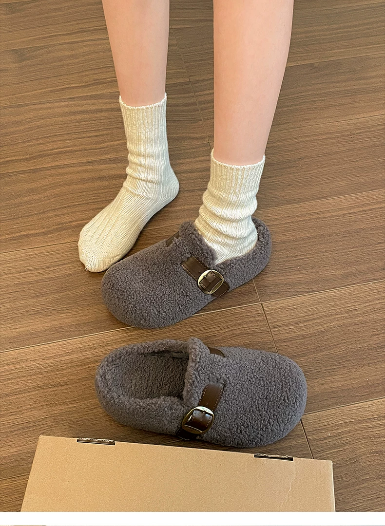 Dép lông dày đế dày chống trơn màu trắng cổ điển dành cho nữ, mặc ngoài trời mùa đông, kiểu mới 2025, lót lông cừu, dày dặn, ấm áp kiểu Birkenstock.