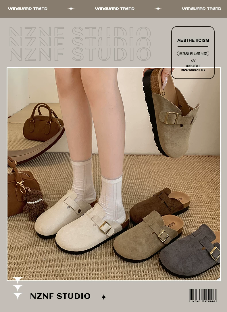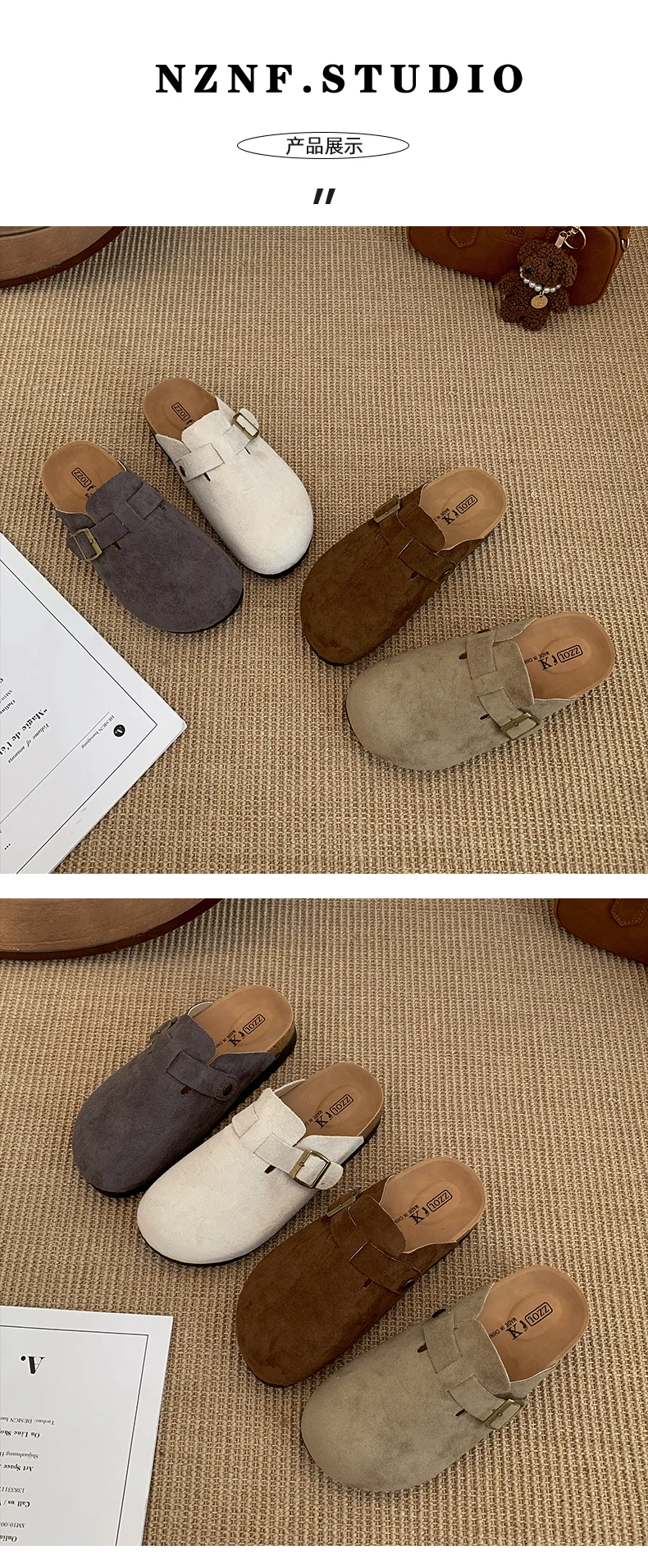 Dép nữ đế dày kiểu Pháp cổ điển màu trắng, trang phục mùa thu, kiểu mới 2025 phối chân váy, dép nửa đế Birkenstock chống trơn