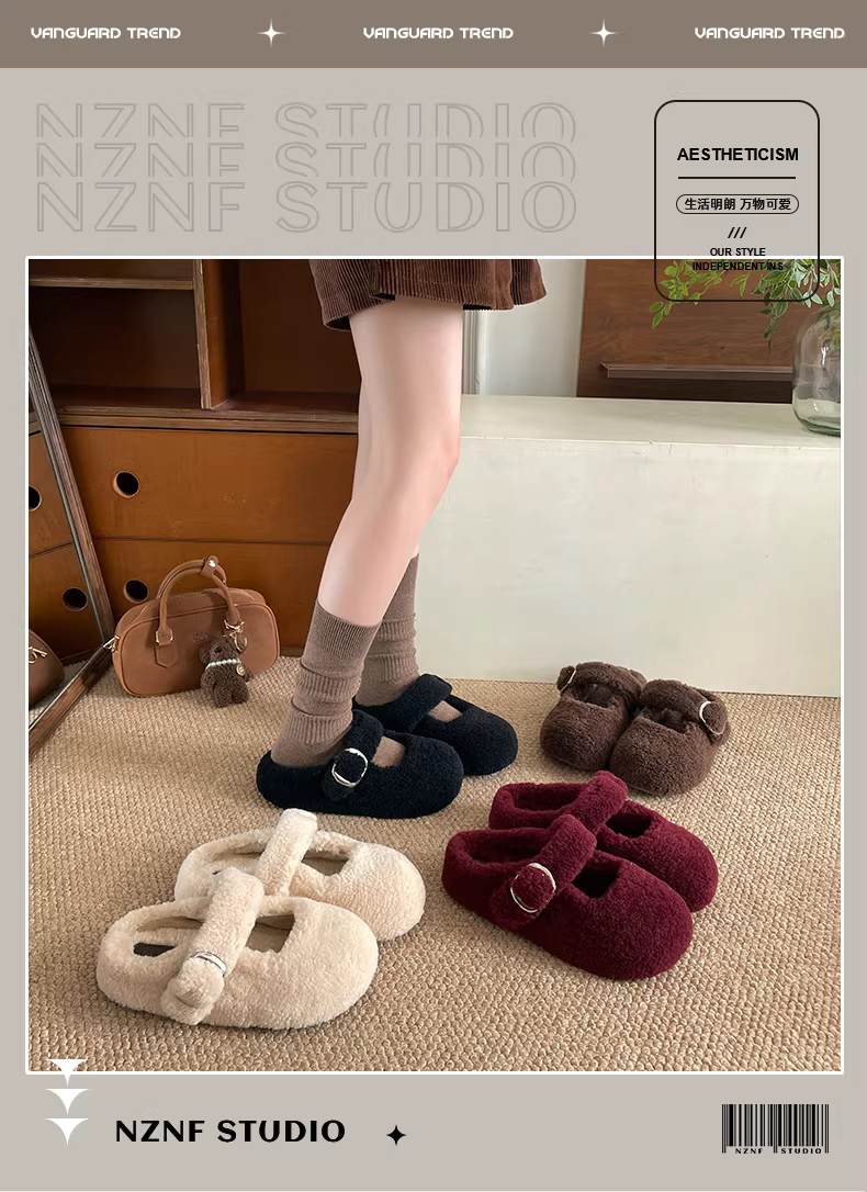 Đôi dép lông dày kiểu Pháp Nanzai Nanfang màu đen dành cho nữ, mẫu mới mùa đông 2025, giữ ấm khi đi ngoài trời, chất liệu bông mềm mại.