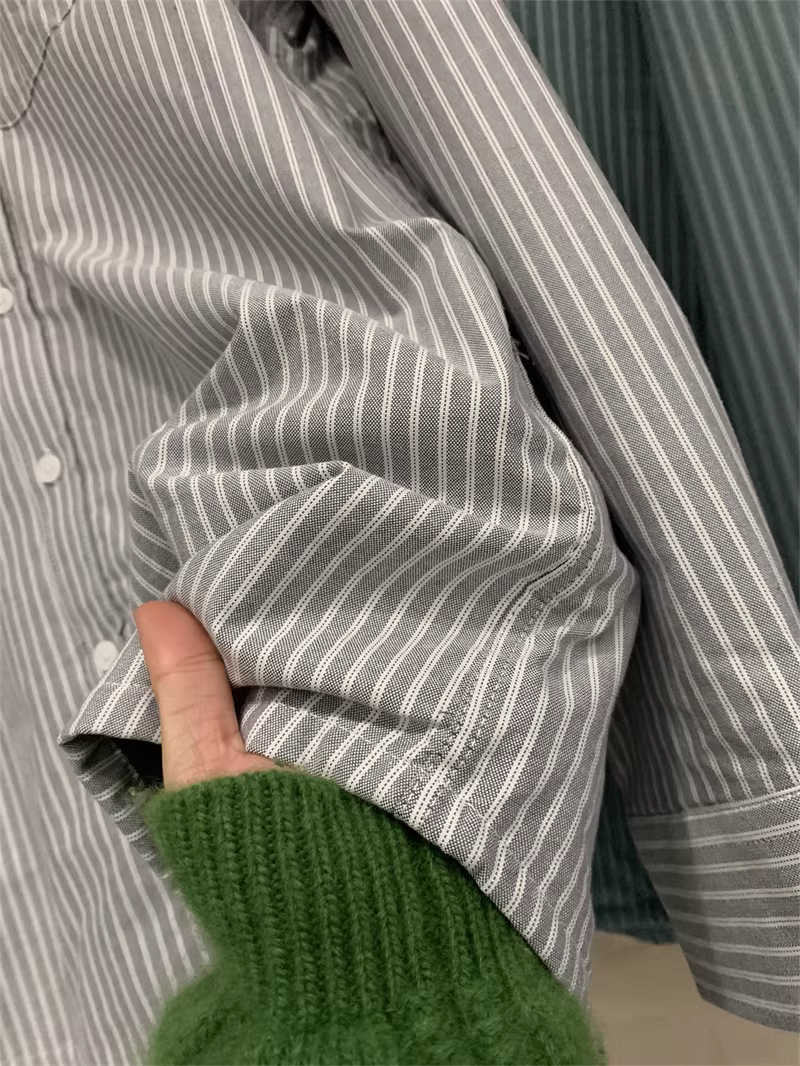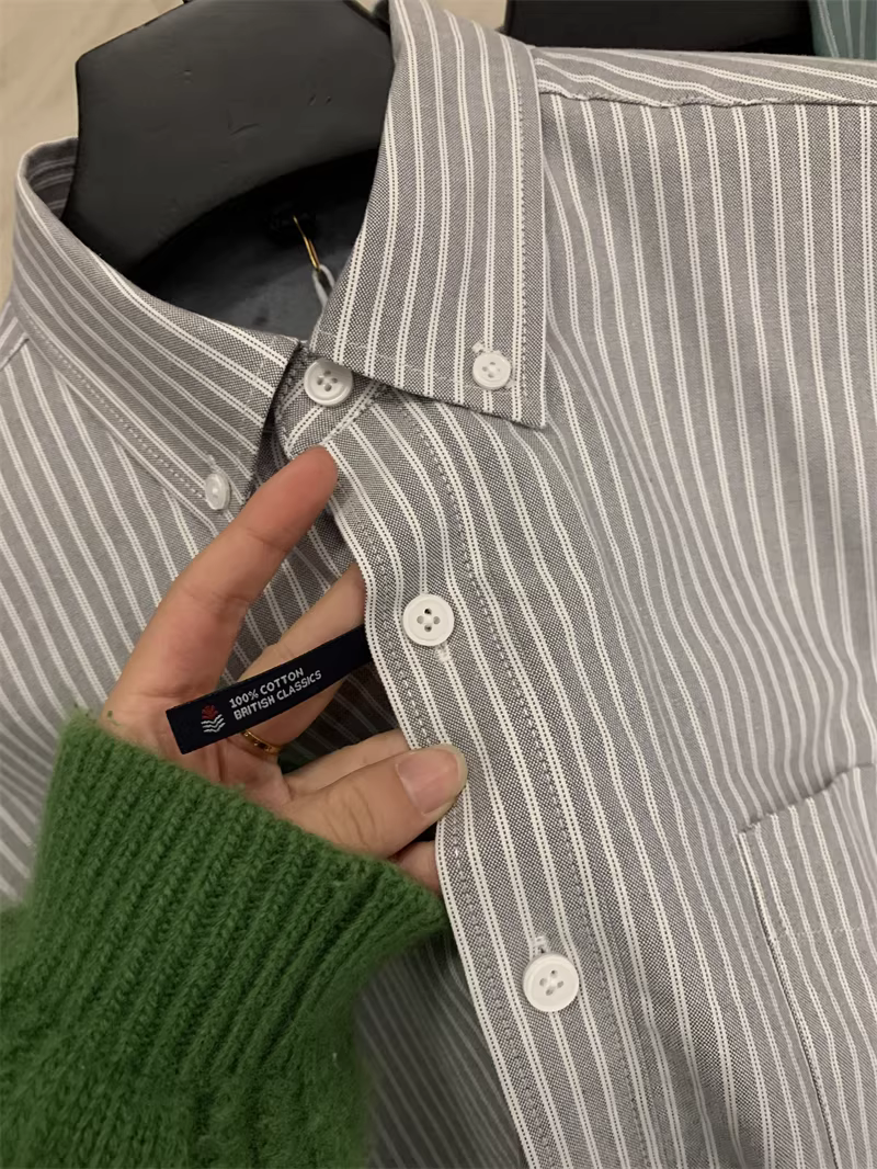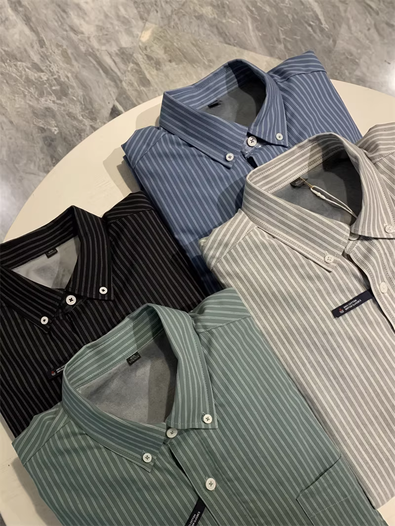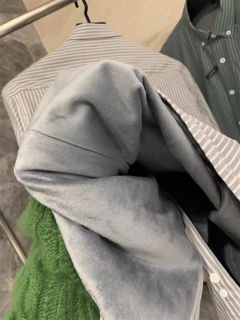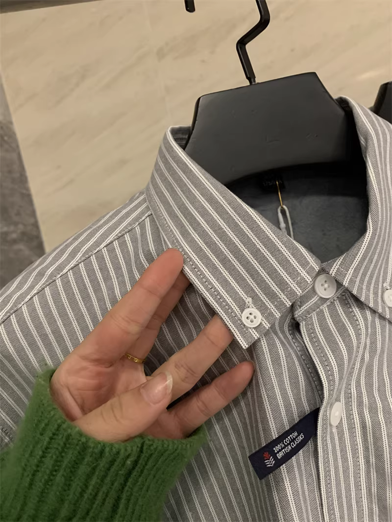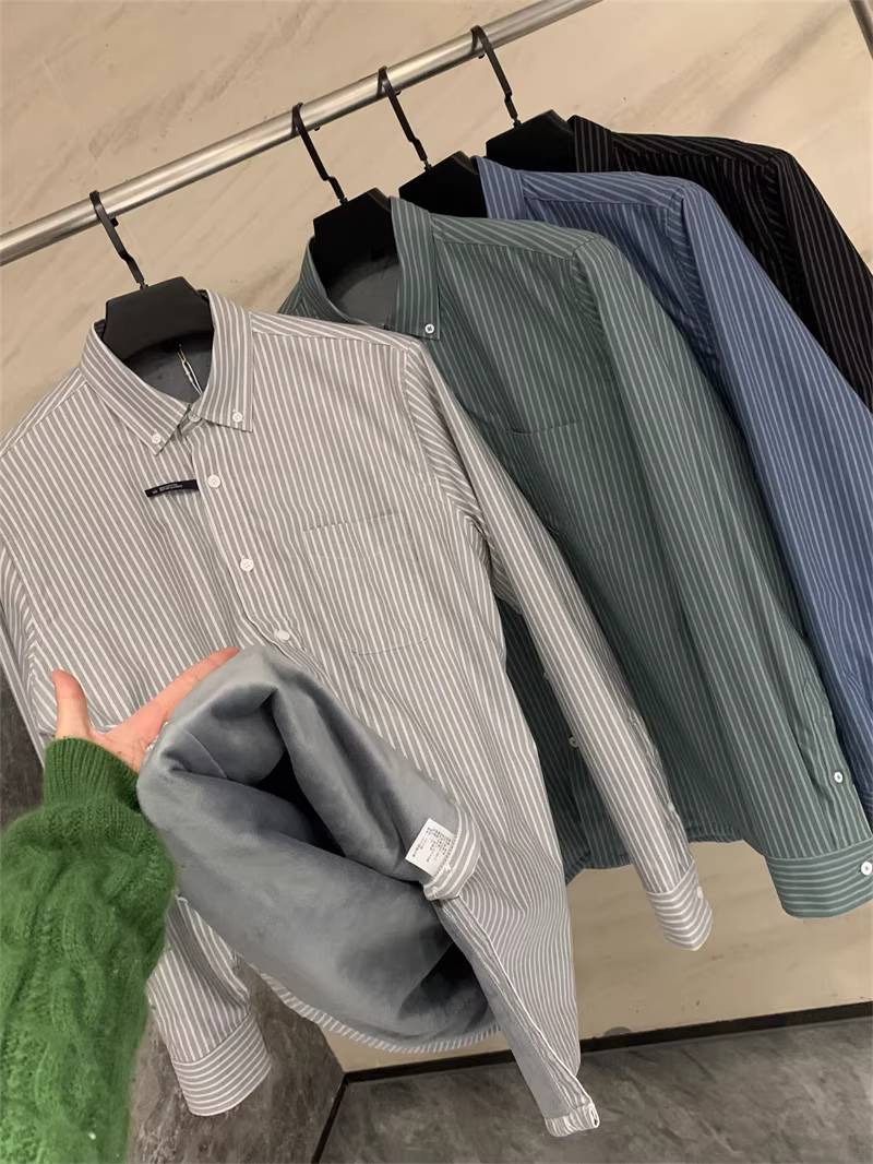 Đơn đặt hàng của công ty Don Quixote ODM! Quần áo may sẵn đã được giặt sạch! Áo sơ mi dài tay kẻ sọc dày dặn, lót lông cừu, cổ trụ, thời trang mùa thu đông.