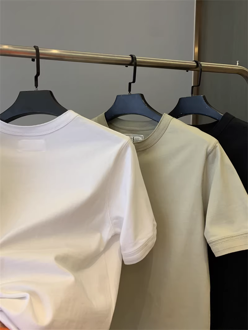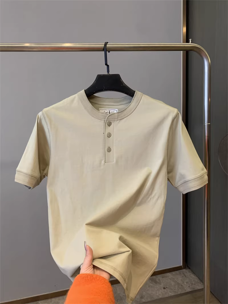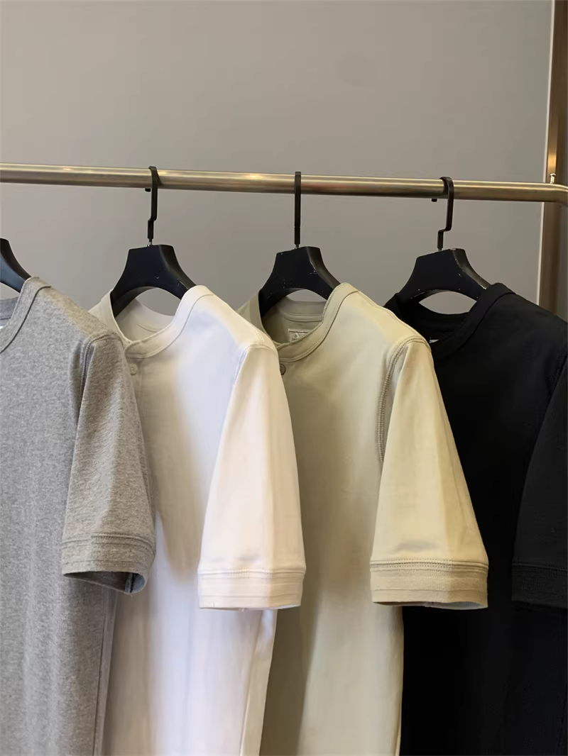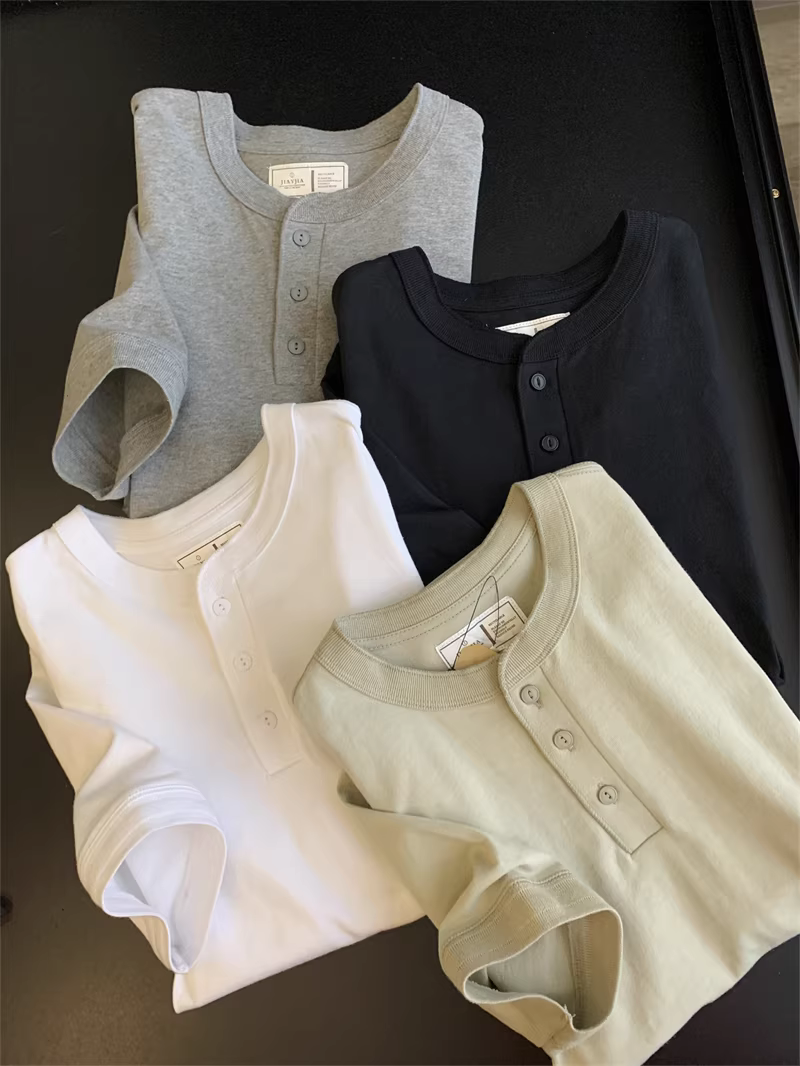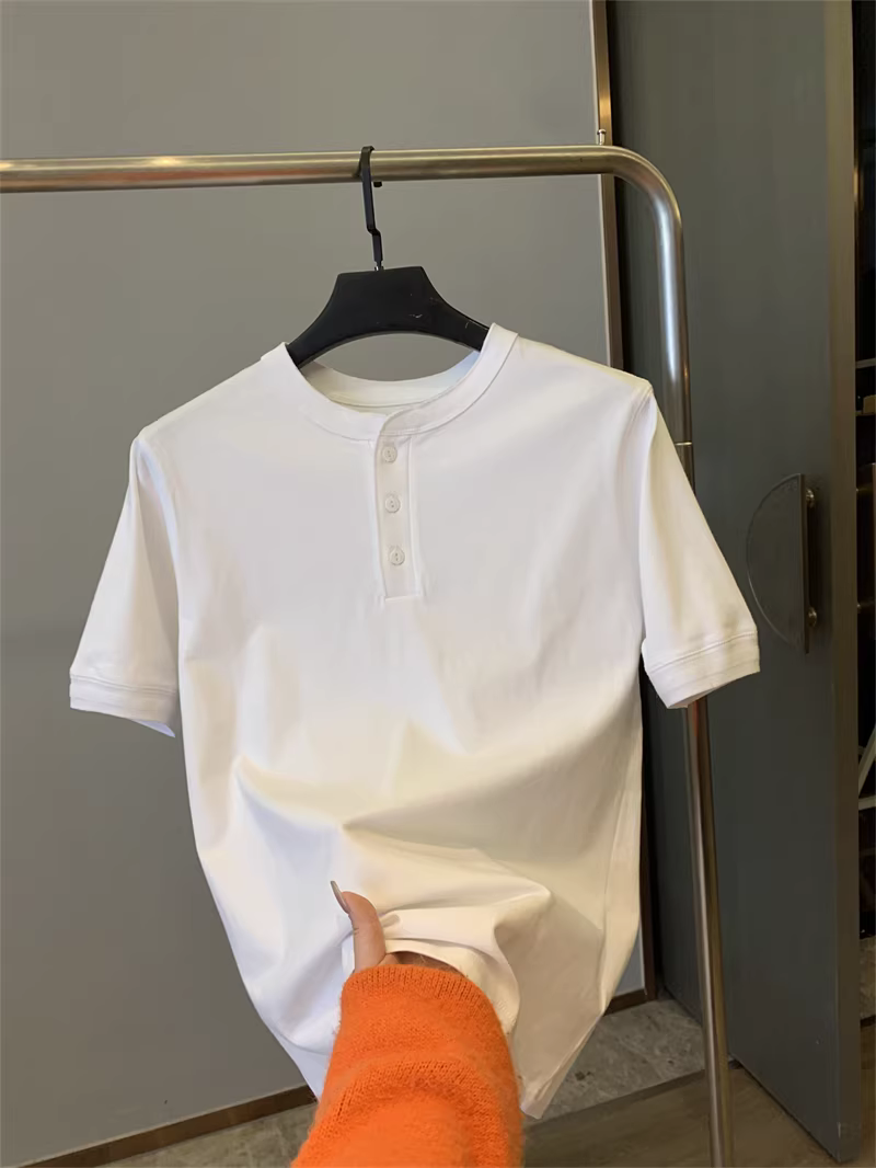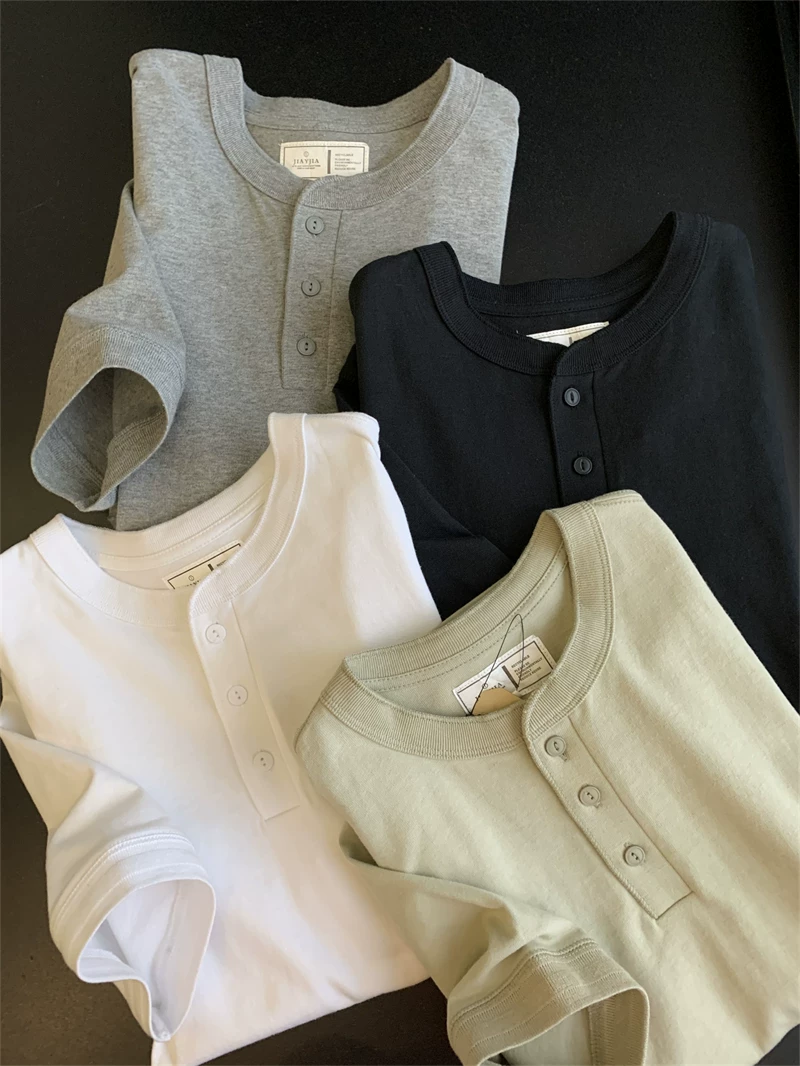 Đơn đặt hàng của Don Quixote Company! Áo thun ngắn tay màu trơn, chất liệu cotton nguyên chất, cổ Henry, dáng rộng và đa năng, kiểu dáng mùa hè mới.