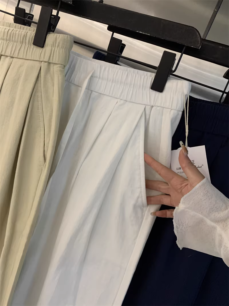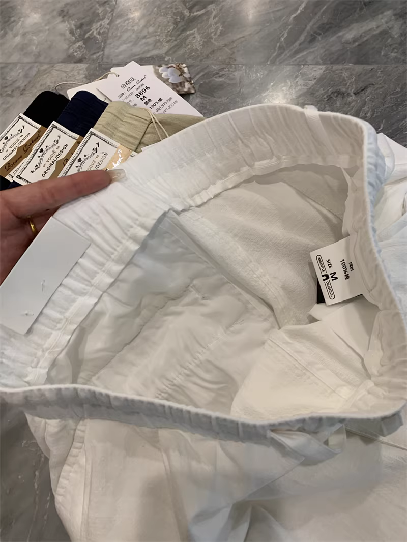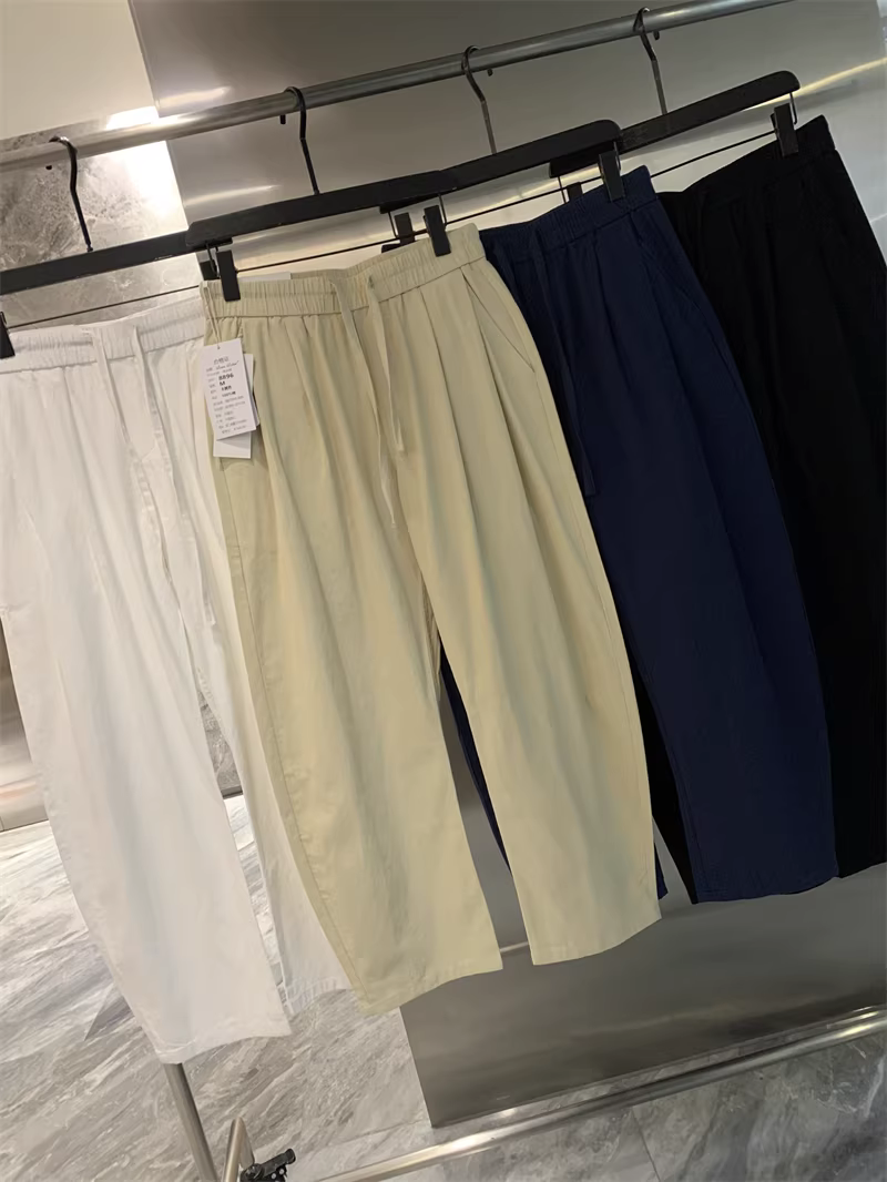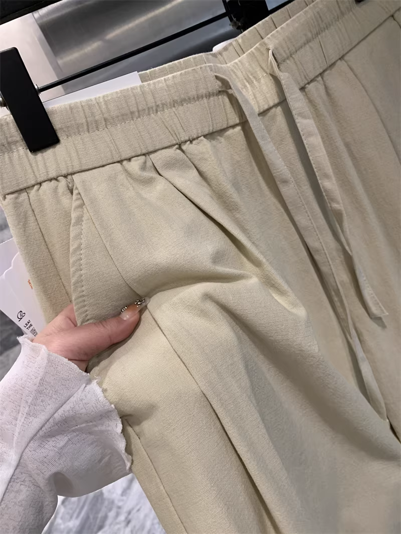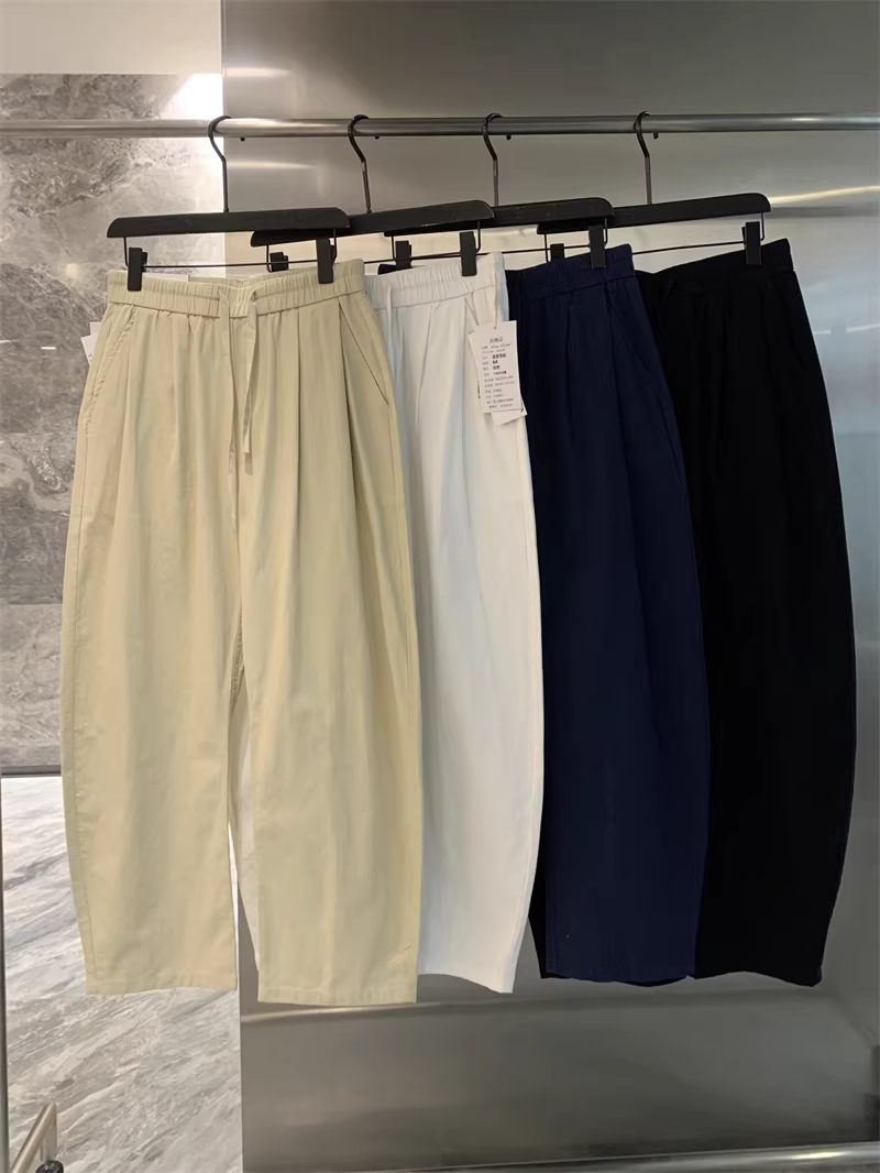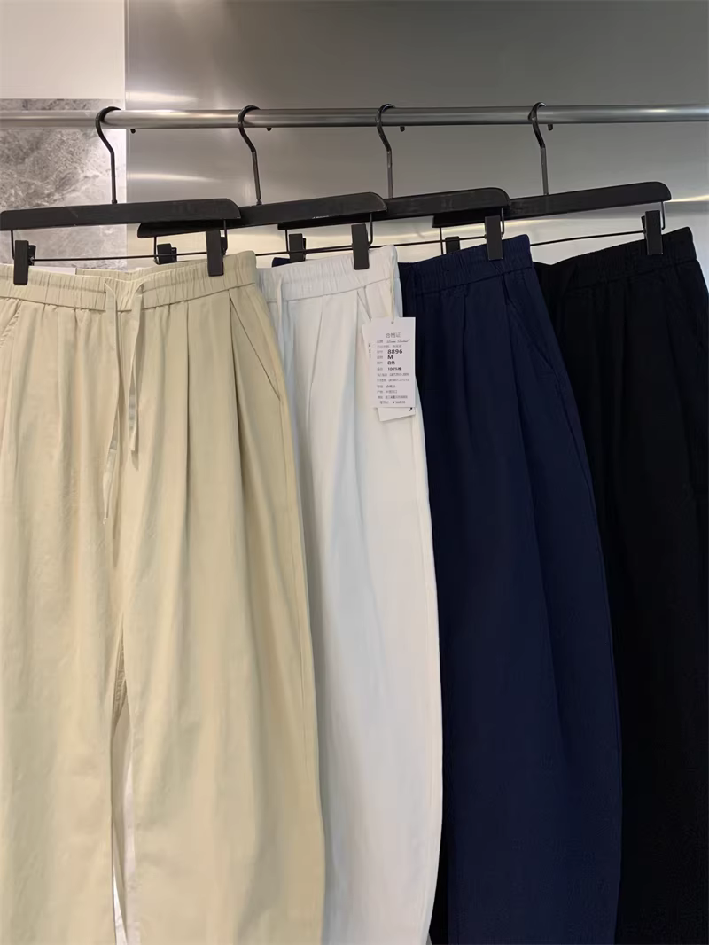 - Don Quixote 100% cotton + kiểu quần lưỡi liềm! Quần ống rộng dáng rộng, lưng thun co giãn, mềm mại và thoáng khí cho nam mùa xuân/hè