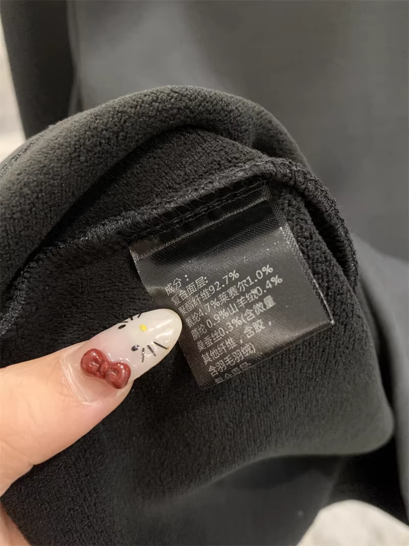 成分:复合面层:92.7%聚酯纤维+4.7%氨纶+1%莱赛尔+0.9%腈纶+0.4%山羊绒+0.3%桑蚕丝