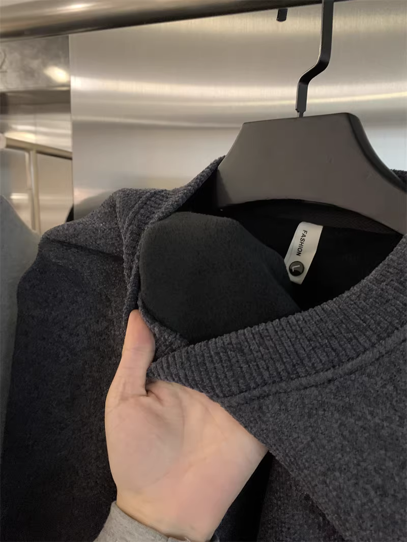 时尚圆领款领口 下摆和袖口是针织罗纹拼接