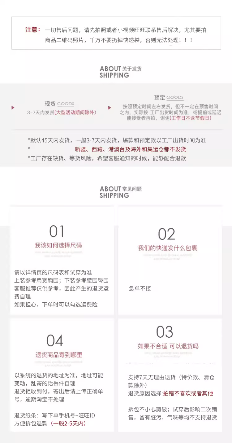 温馨提示:因每个人的体型和穿衣习惯不同,试穿表和客服推荐仅供参考,决定权在自己的手中,因此产生的退货运费自理~