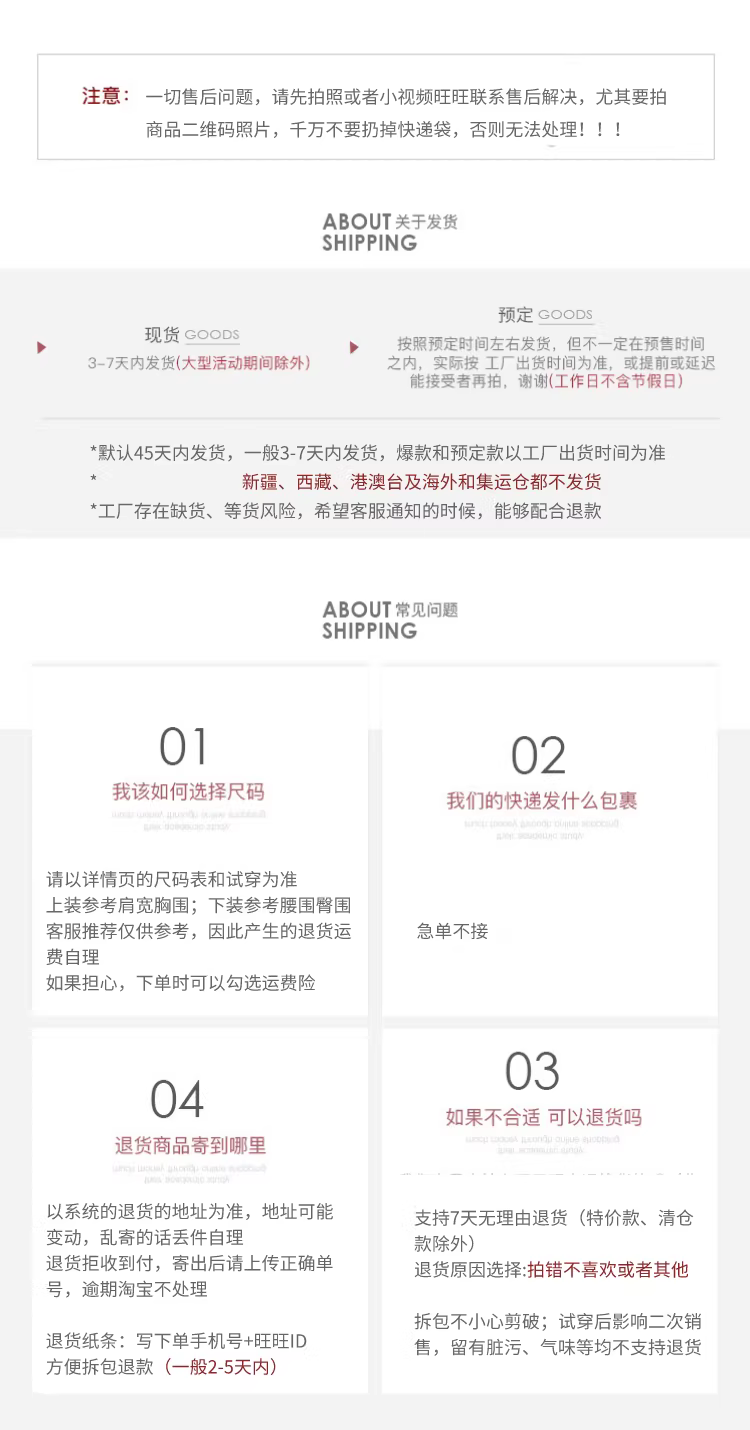 温馨提示:因每个人的体型和穿衣习惯不同,试穿表和客服推荐仅供参考,决定权在自己的手中,因此产生的退货运费自理~