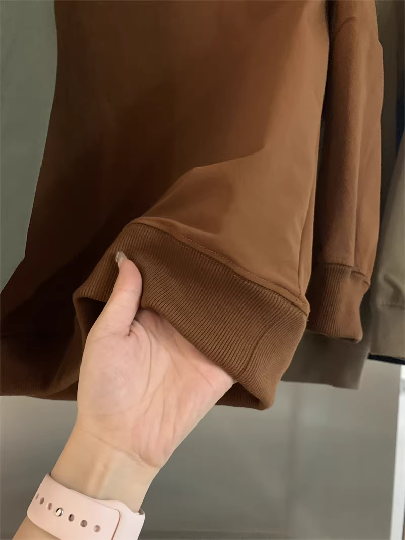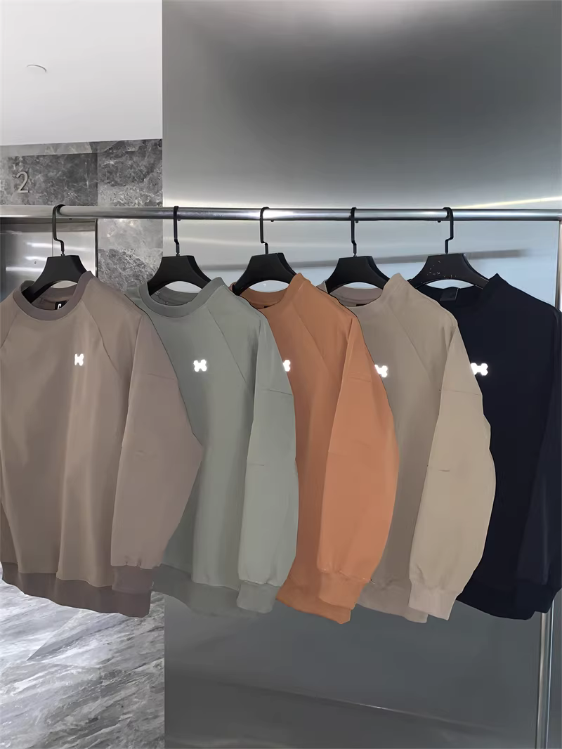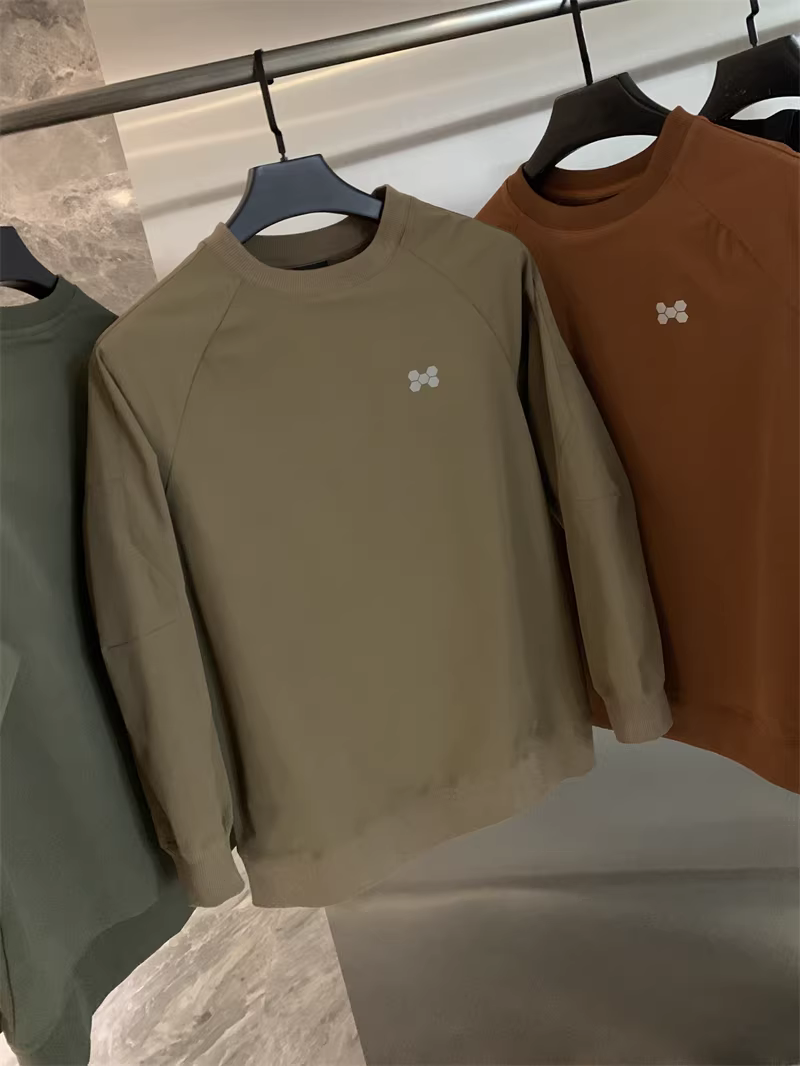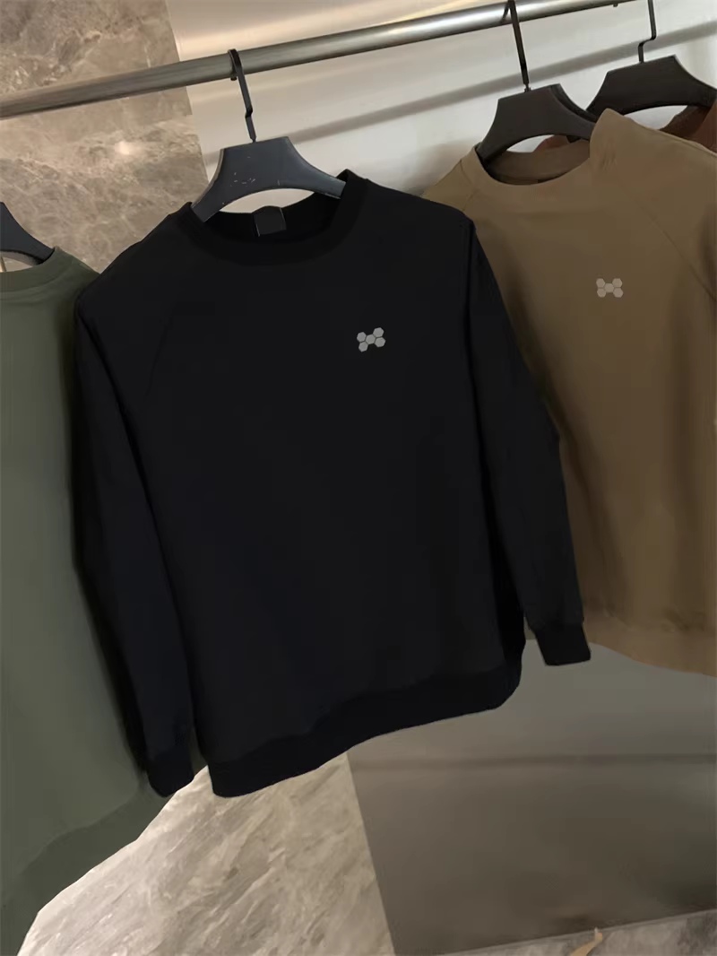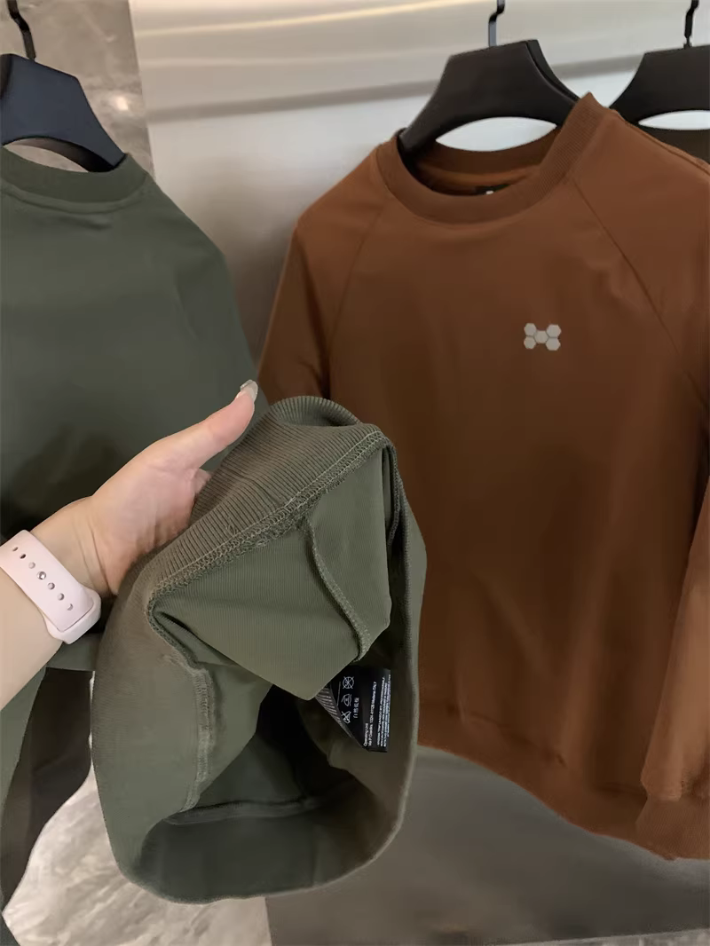圆领卫衣款,领口、下摆、袖口均是同色定制的罗纹收口