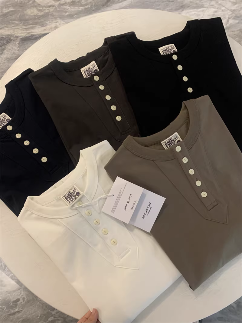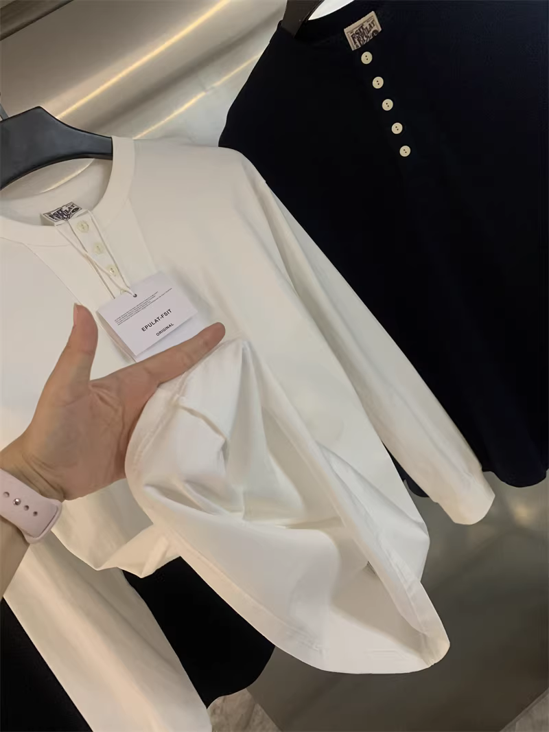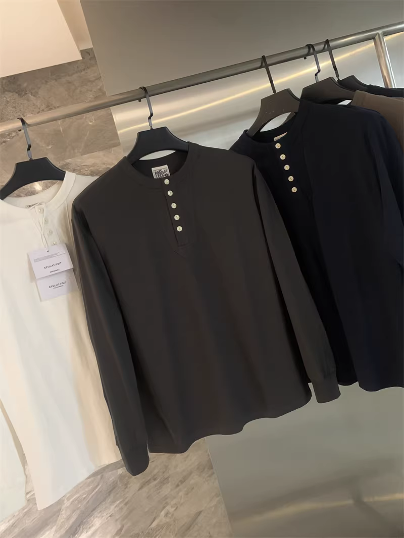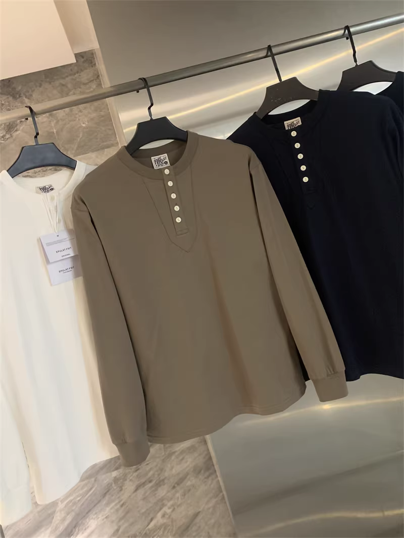 Don Quixote, phong cách giản dị mạnh mẽ của Mỹ! Cổ áo Henry cổ điển! Áo thun dài tay chất liệu cotton nguyên chất dành cho nam mùa thu.