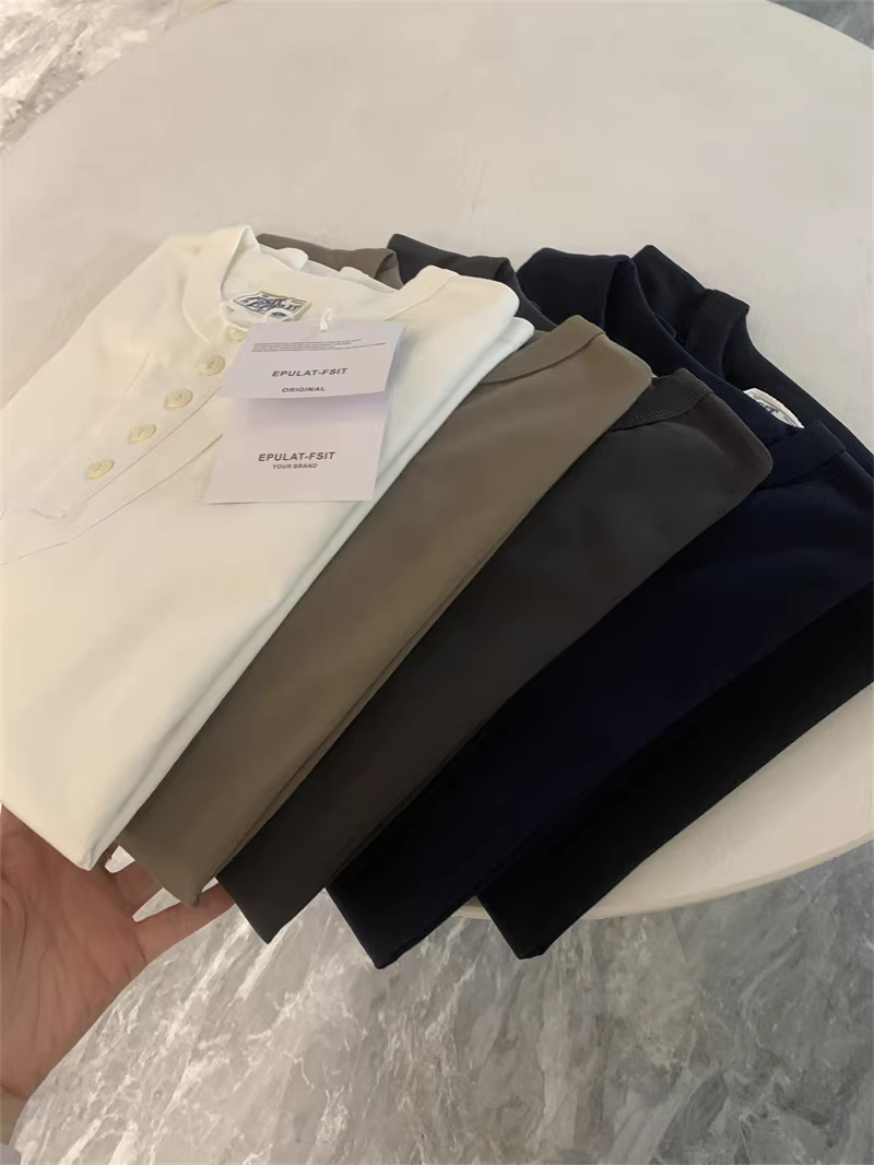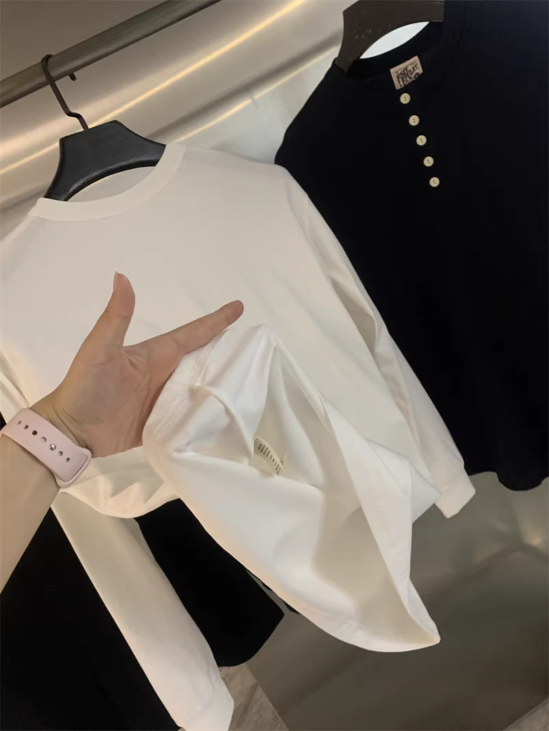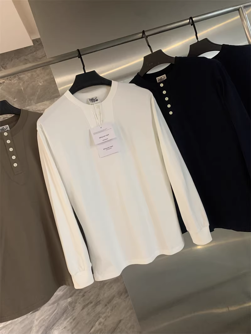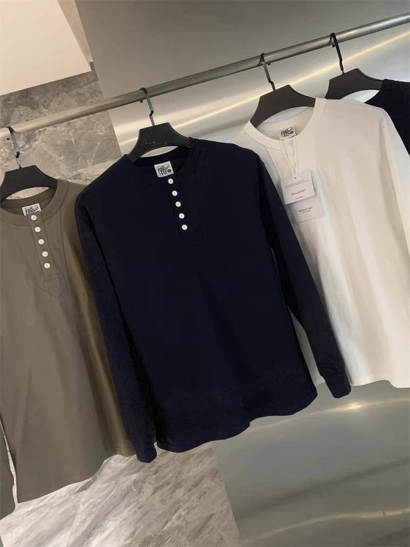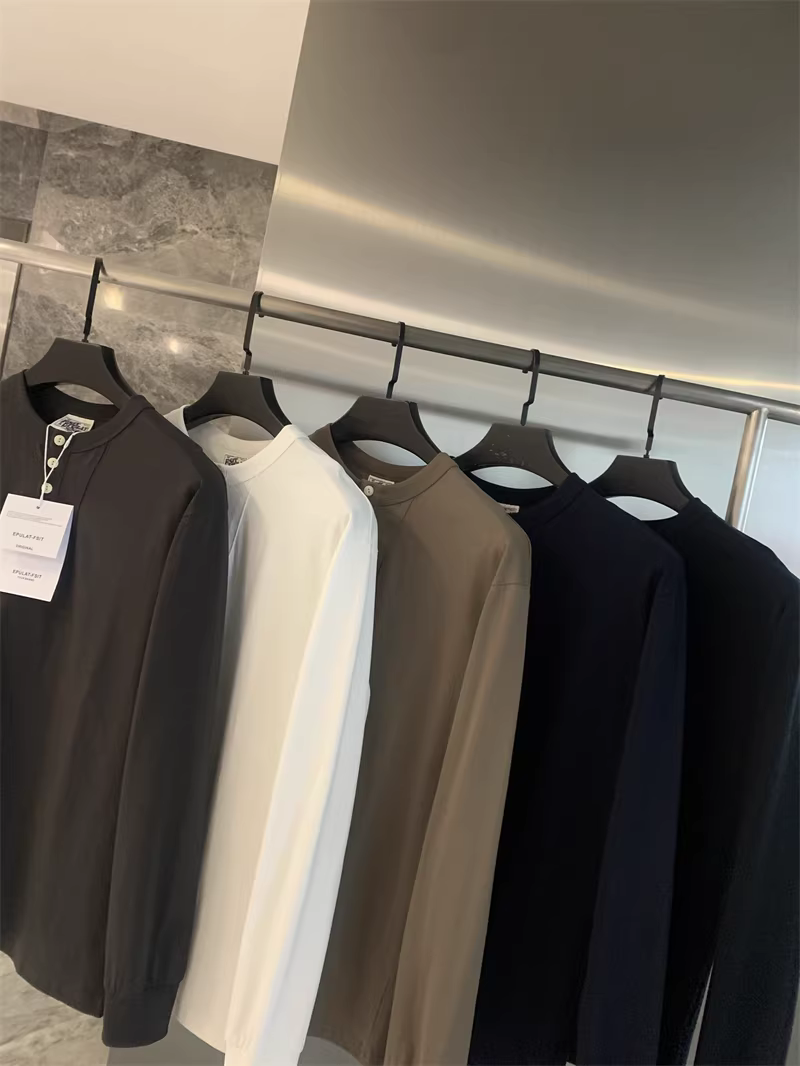 Don Quixote, phong cách giản dị mạnh mẽ của Mỹ! Cổ áo Henry cổ điển! Áo thun dài tay chất liệu cotton nguyên chất dành cho nam mùa thu.