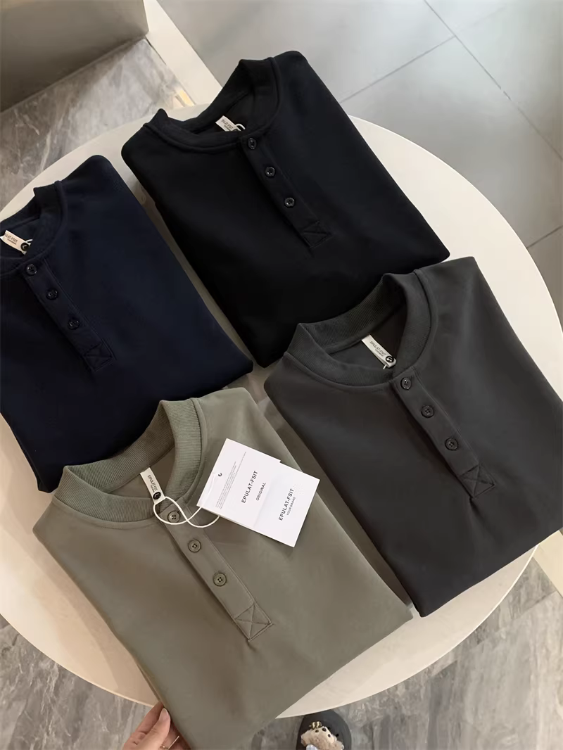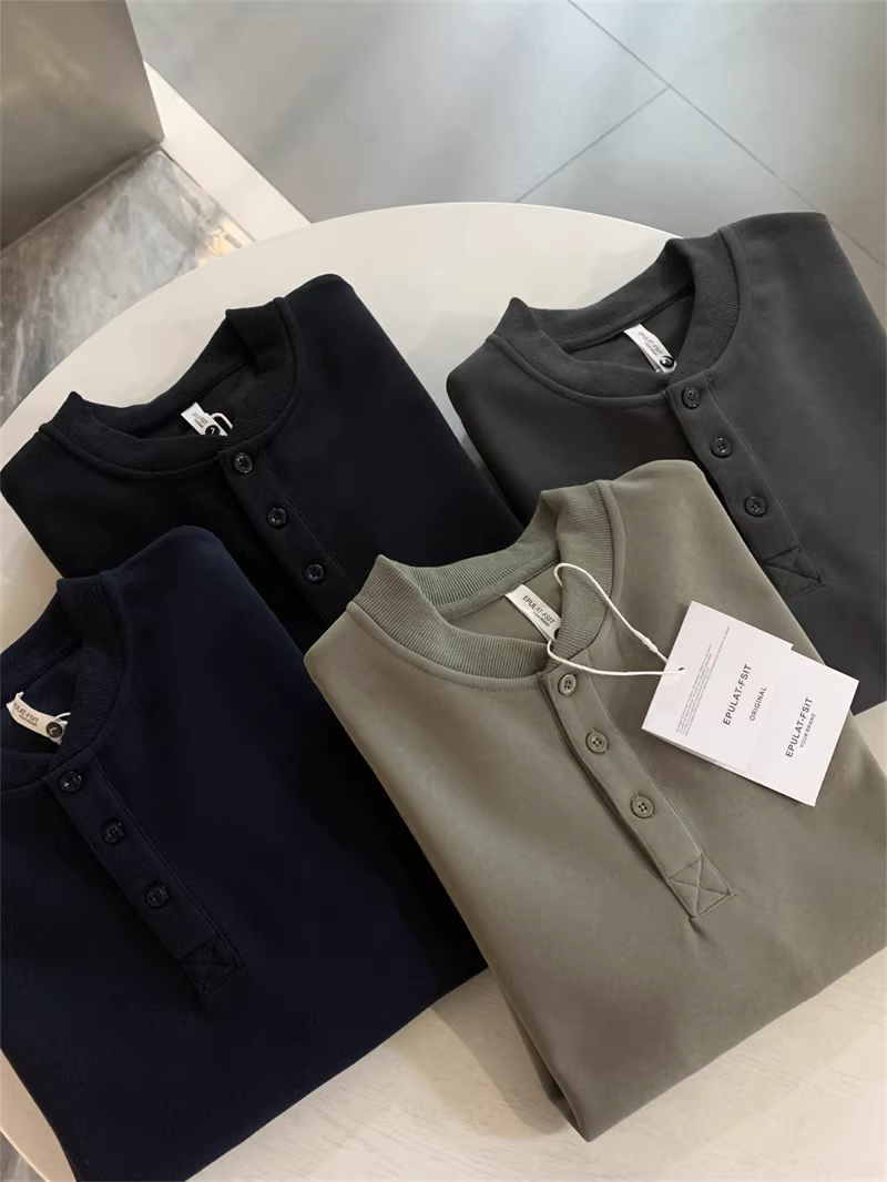 Don Quixote phong cách retro Mỹ! Cổ áo Henry cổ điển! Áo nỉ nam thời trang đa năng màu trơn mùa thu