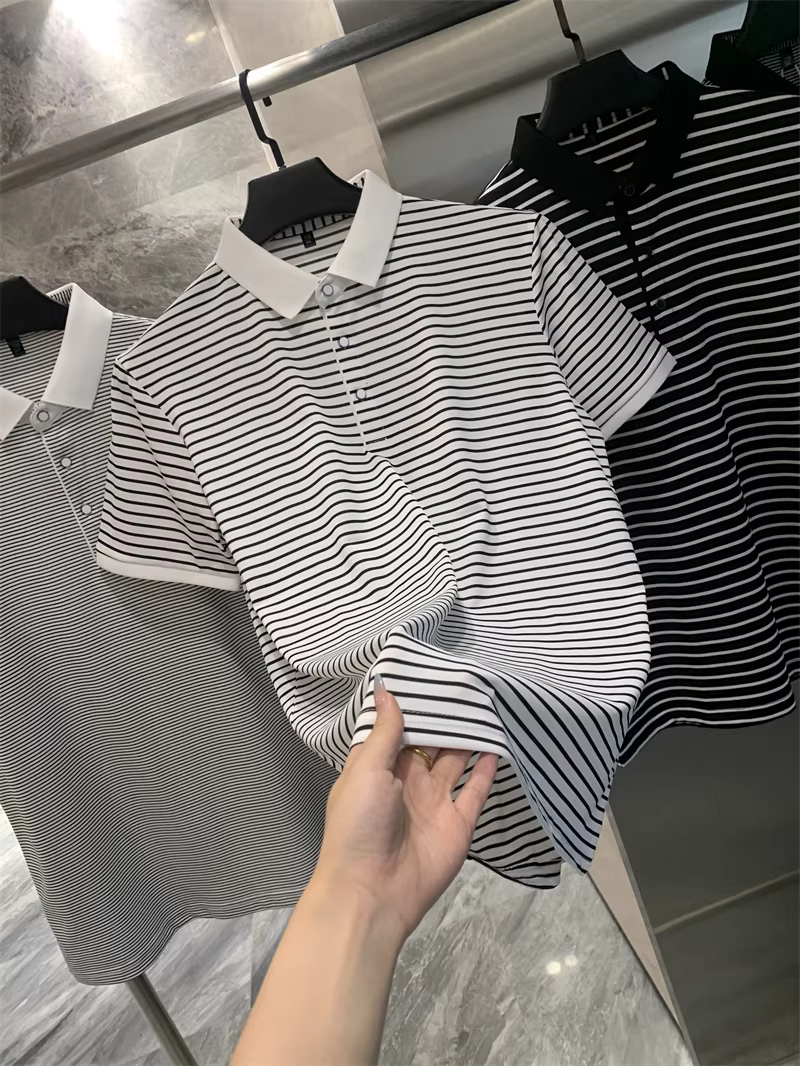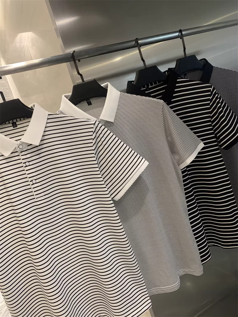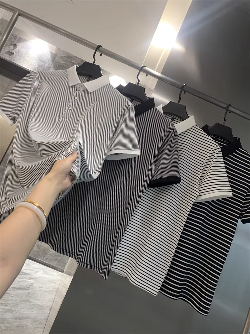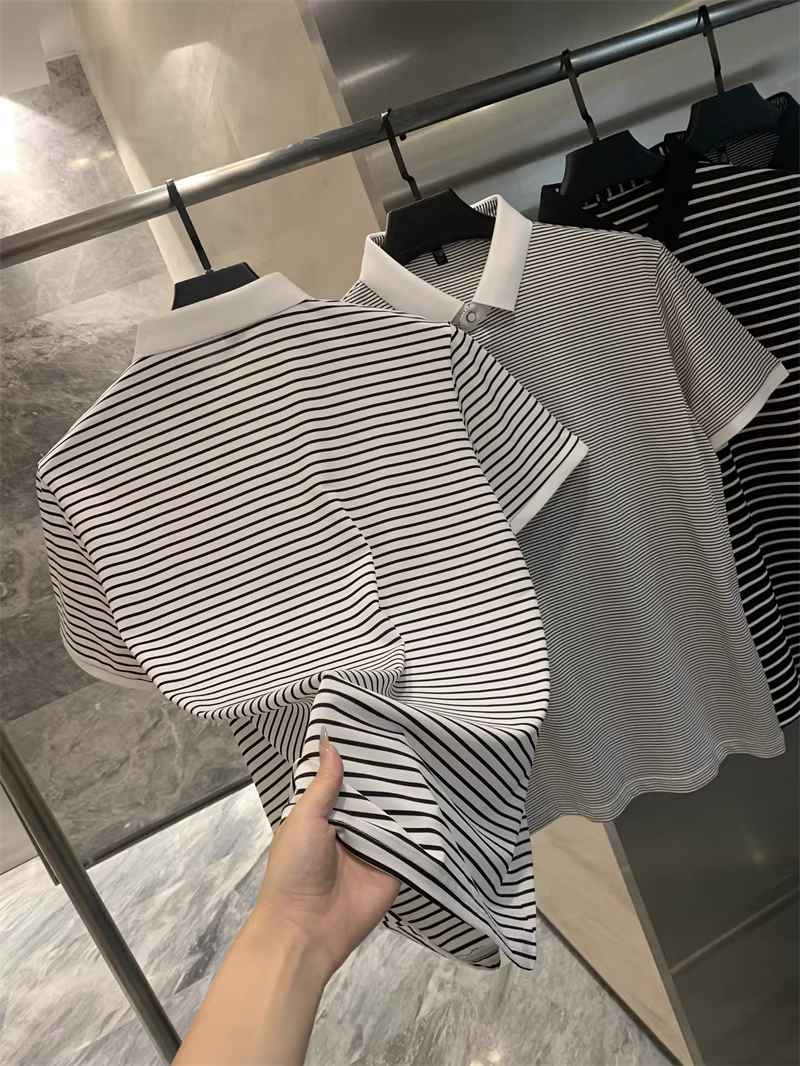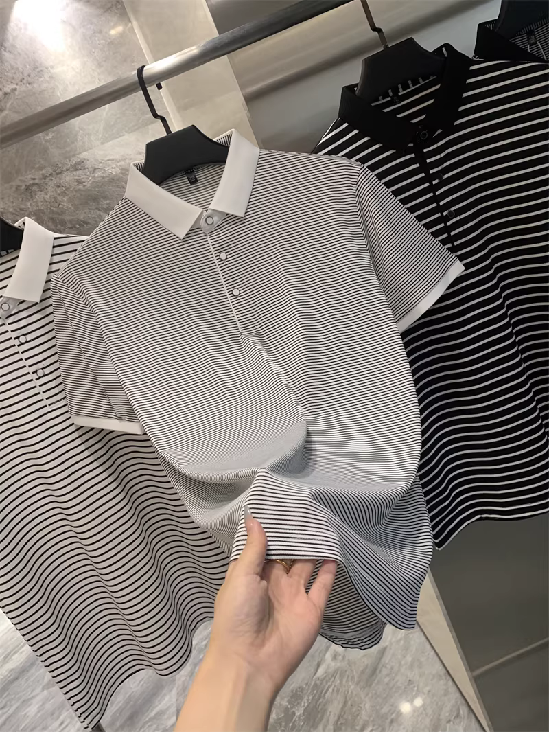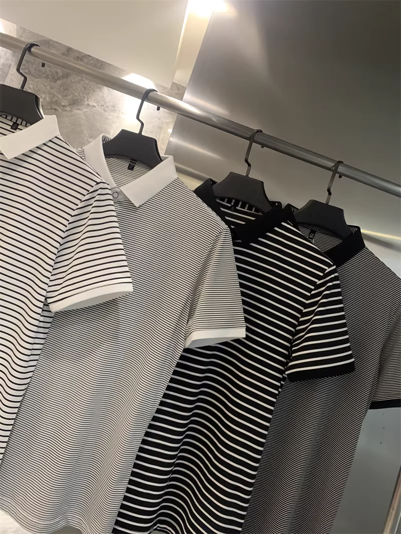 Don Quixote rất giàu tính nghệ thuật! Áo polo nam ngắn tay, cổ trụ, sọc thô/mịn nhuộm sợi! Phong cách mùa hè năng động.