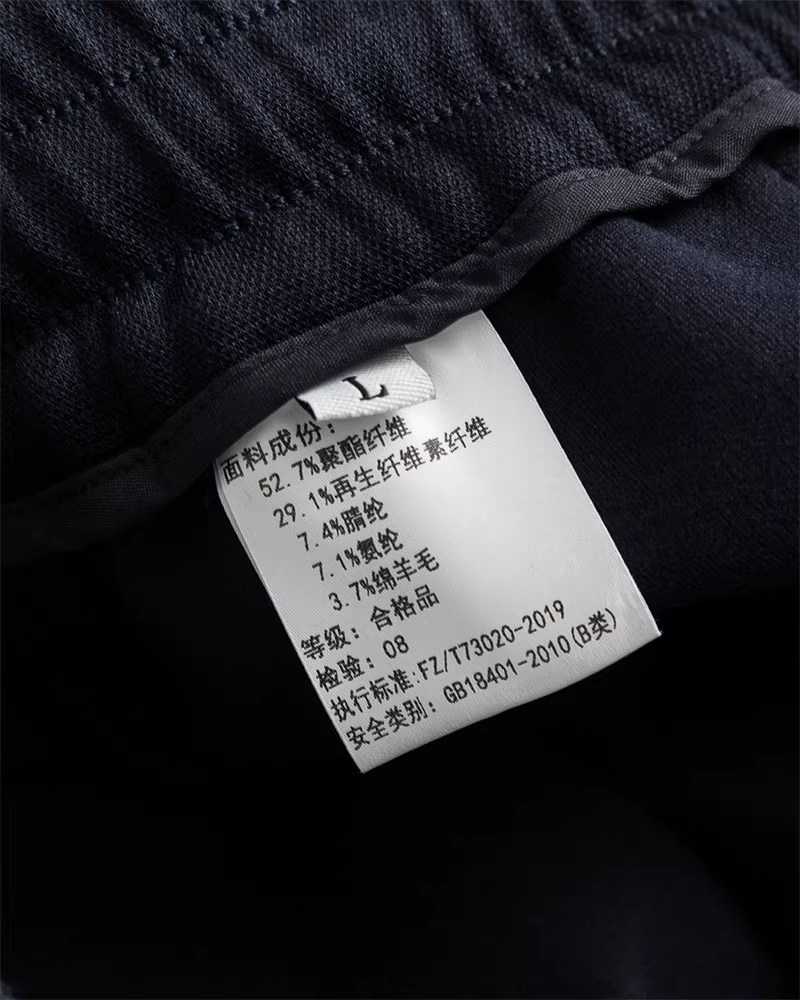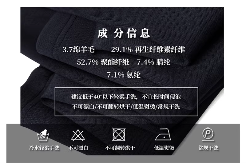 52.7%聚酯纤维+29.1%再生纤维素纤维+7.4%腈纶+7.1%氨纶+3.7%绵羊毛