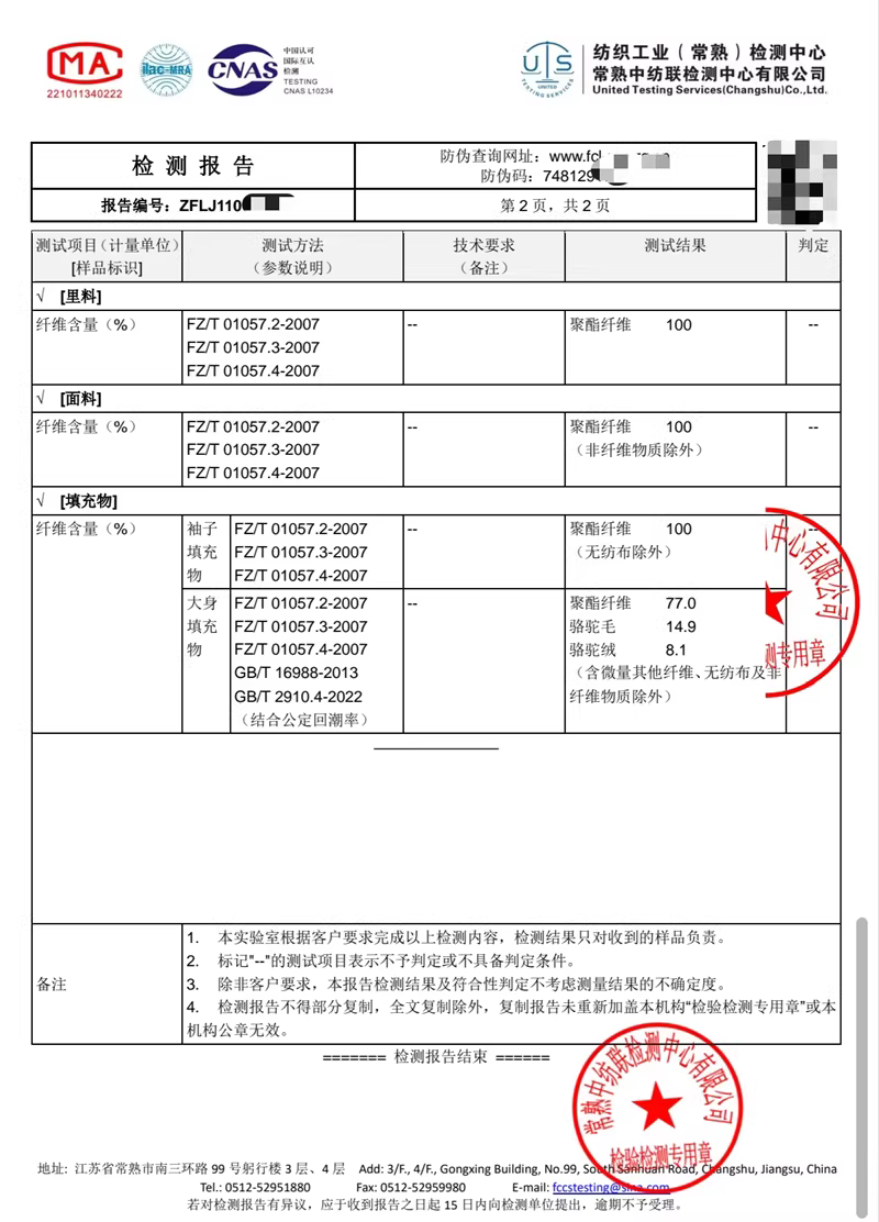 填充物1:9.6%骆驼绒+10.2%骆驼毛+78.7%聚酯纤维+1.5%其他纤维