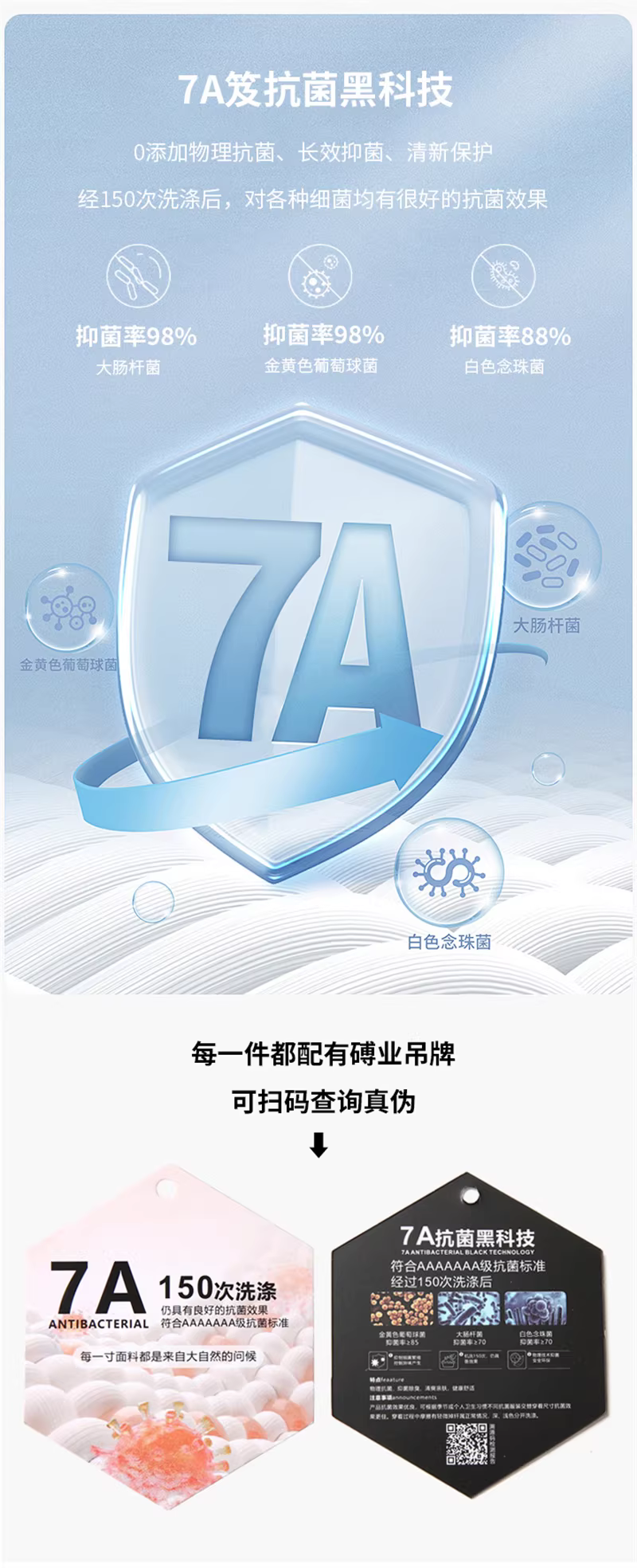 7A抗 菌黑科技!0添加物理抗 菌、长 效抑 菌、清新保护