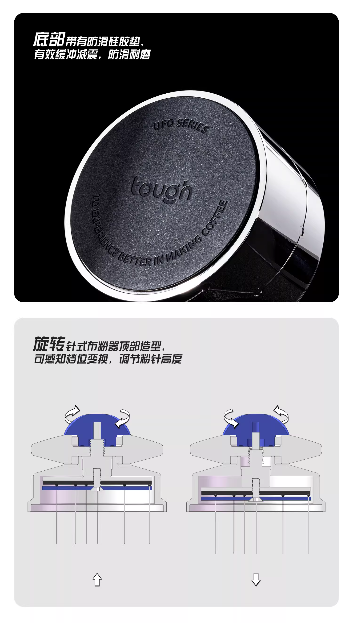 - Dụng cụ phân phối bột cà phê UFO Stubborn, dòng UFO, dụng cụ phân phối bột cà phê Ý, kim khuấy và tán bột với chiều dài kim có thể điều chỉnh