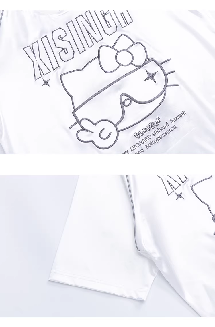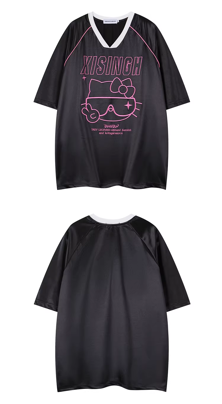 - From Mars Little Cat Biye Áo thể thao cổ điển phong cách đường phố Mỹ phong cách thể thao mùa hè giản dị đa năng cổ chữ V tay ngắn