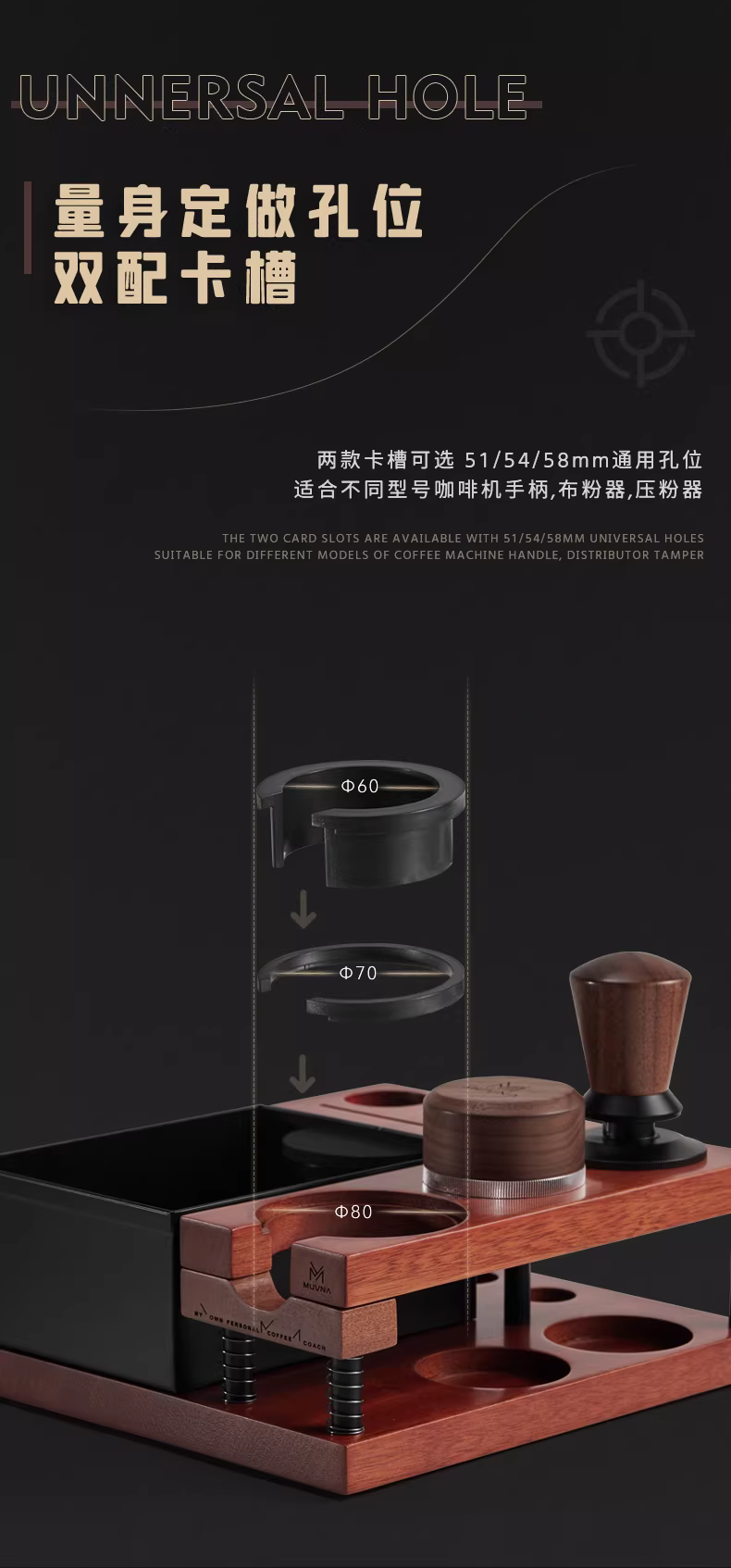 Giá đỡ MUVNA, giá đỡ tamper, hộp đựng bã cà phê, giá để đồ quầy cà phê, gỗ chắc chắn lò xo 51/53/58