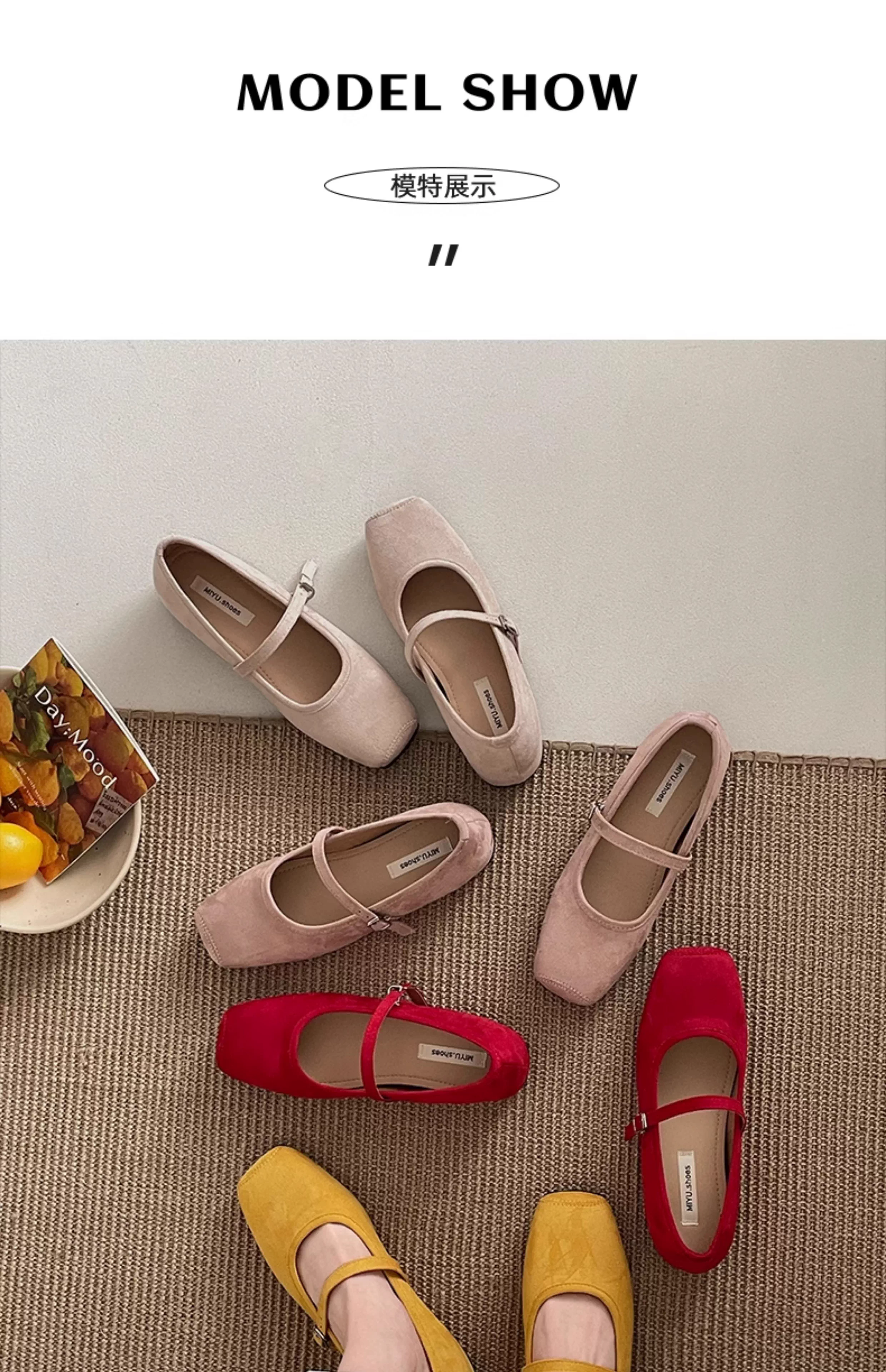 - Giày bệt đế bằng mũi vuông kiểu retro màu đỏ dành cho nữ, kiểu mới mùa thu 2025, phù hợp với chân váy, giày Mary Jane đế mềm.