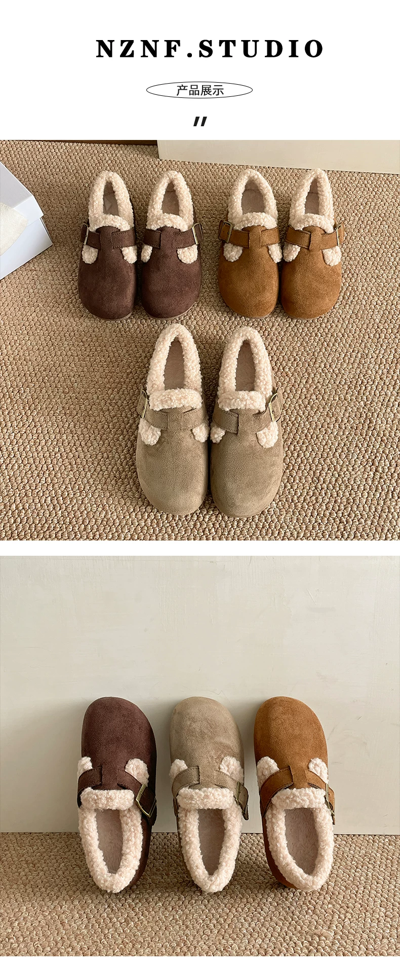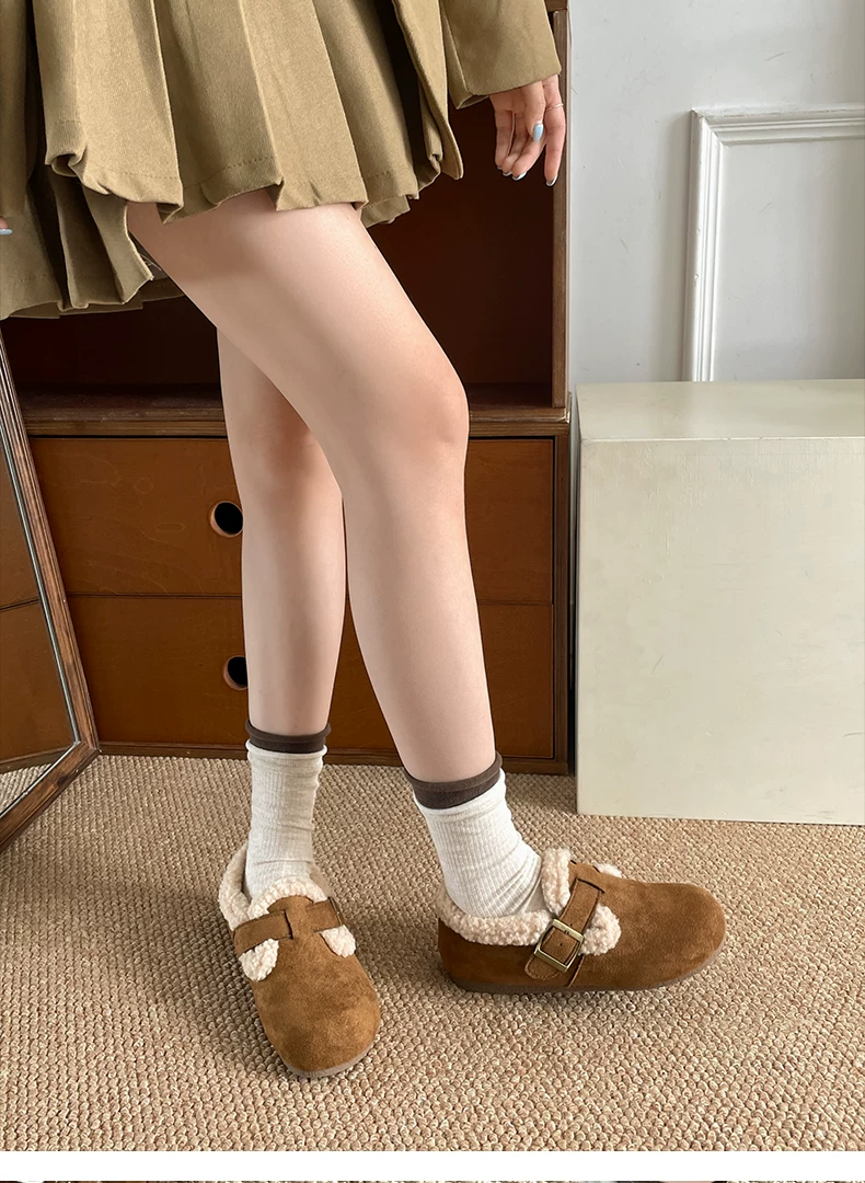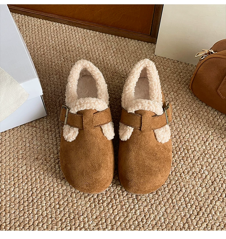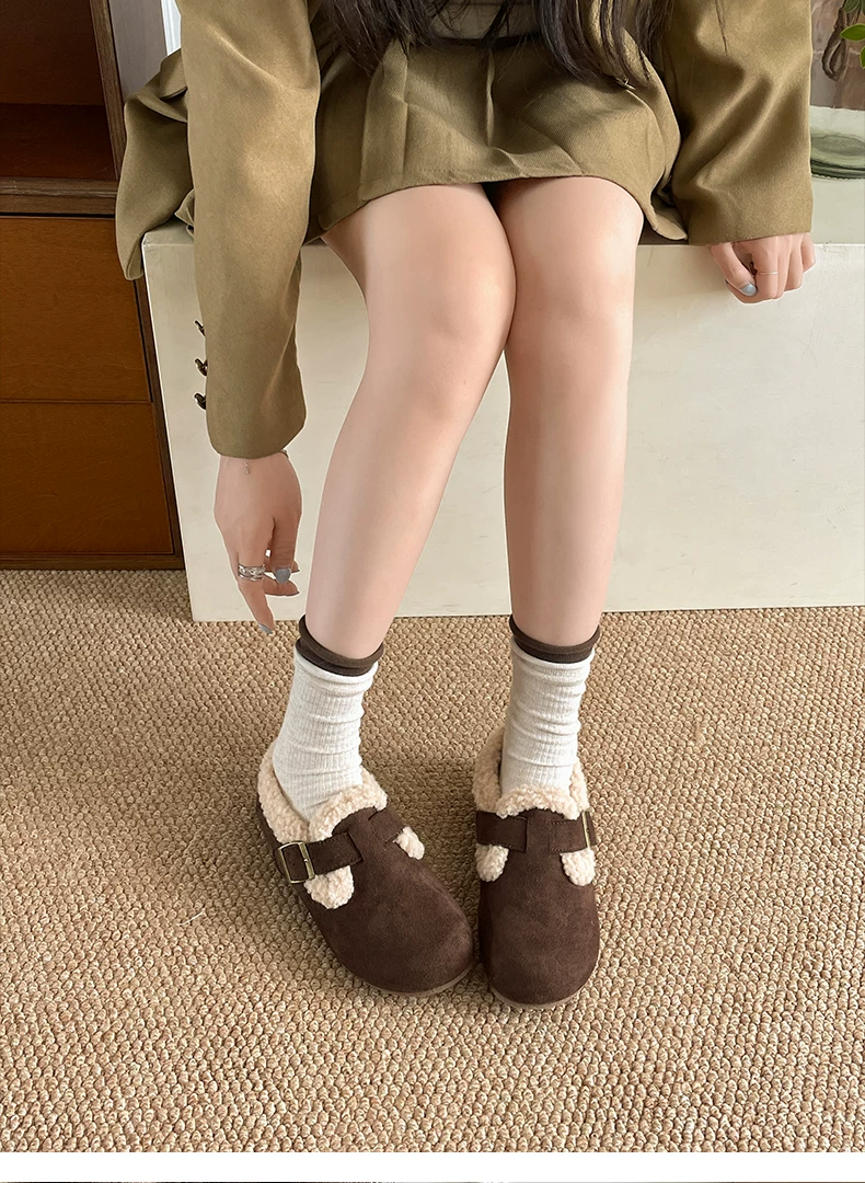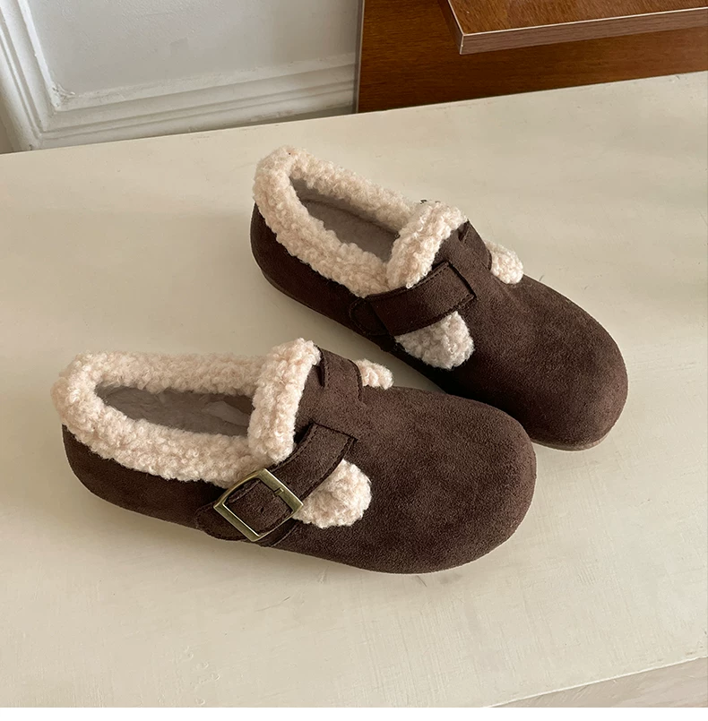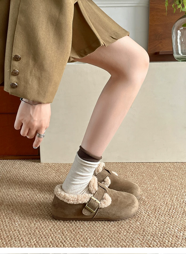 - Giày Birkenstock nhung đế bằng màu nâu cổ điển dành cho nữ, kiểu dáng thu đông 2025 mới, phối cùng chân váy và giày bông giữ ấm đi tuyết